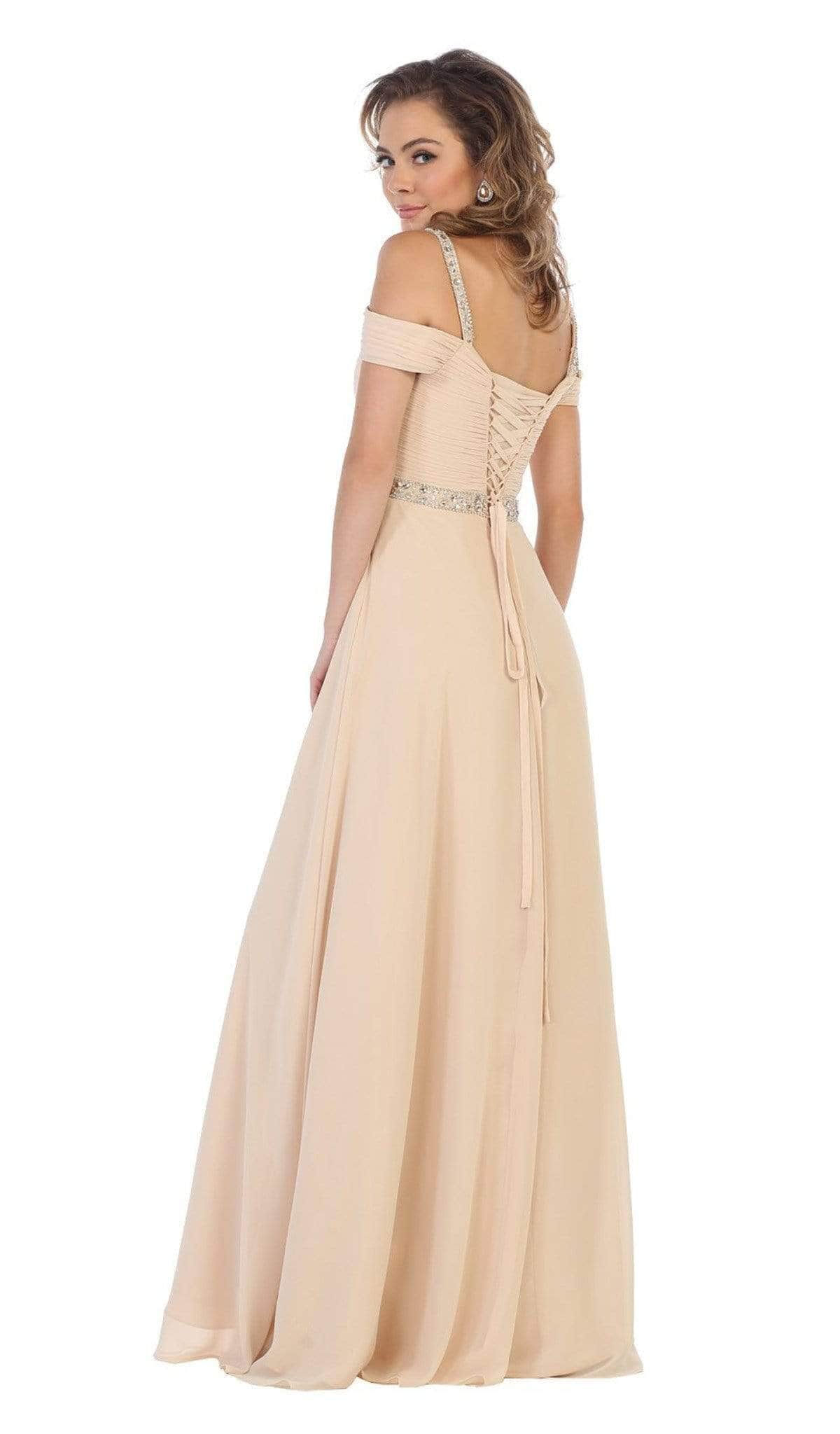 Get ready to be captured in picture of sophistication in this lovely May Queen MQ1515 masterpiece. This stunner highlights an off shoulder neckline supported with embellished straps. The same embellishments beautify the natural waist as the ruched bodice is accented with a knot center detail. The A-line skirt tapers to a full length hem line as lace up closure secures the back for ease of movement. Be in this gorgeous May Queen creation and leave a lasting impression. Model are wearing Eggplant and White colors. Find more Purple Prom Dresses.
