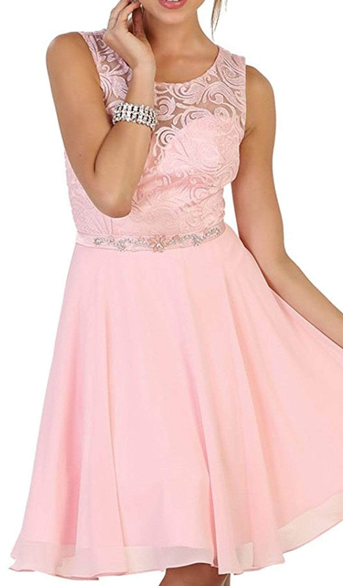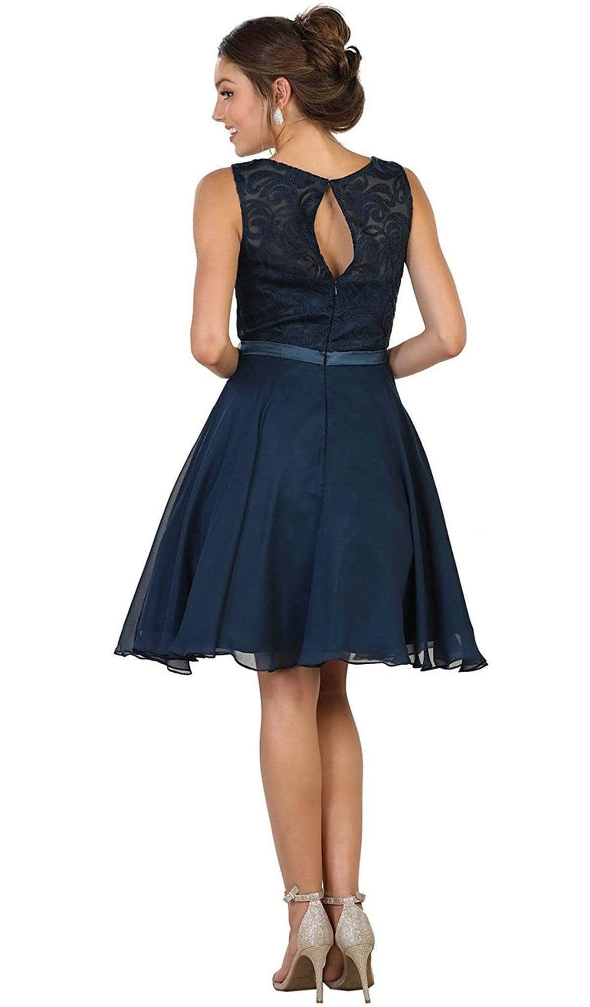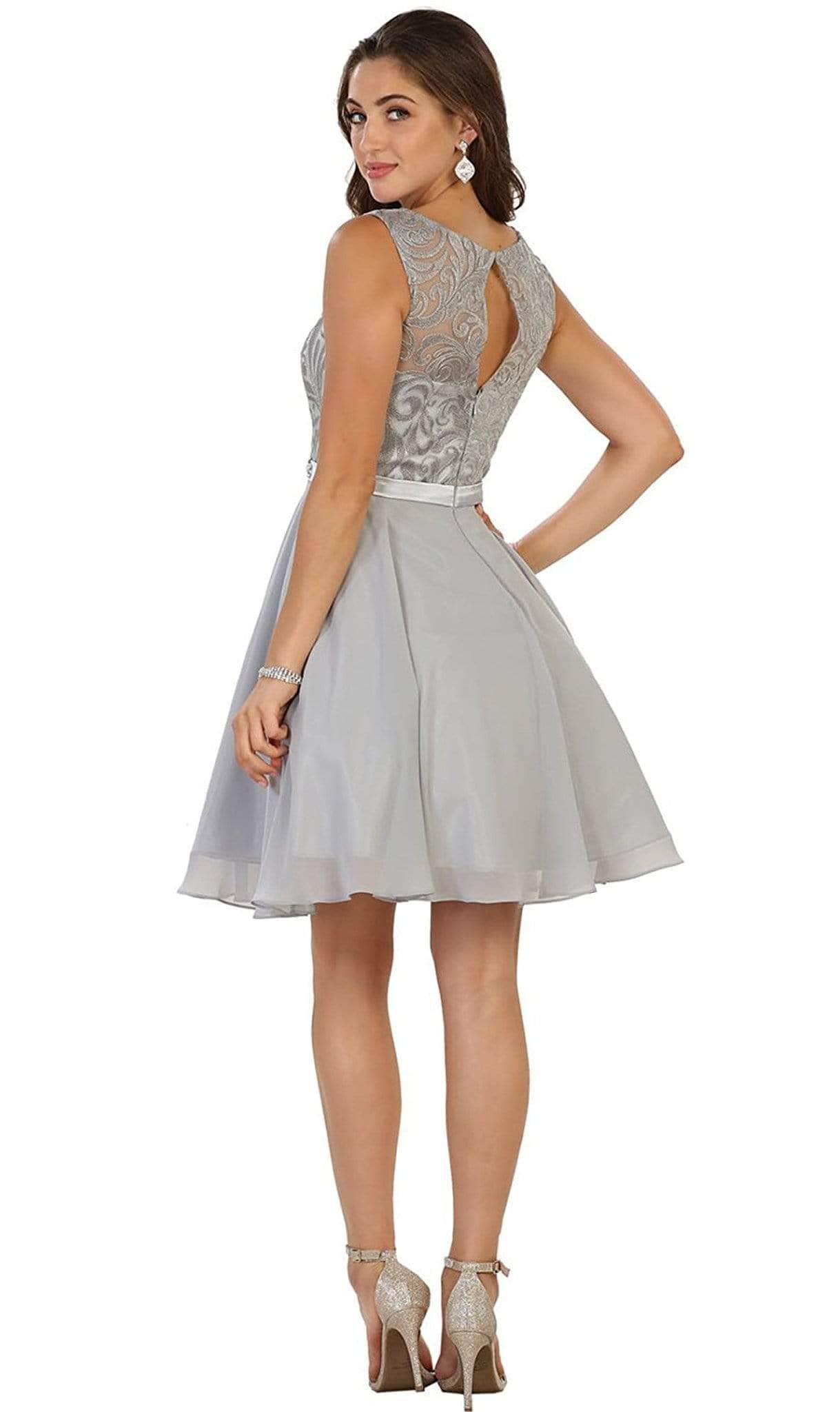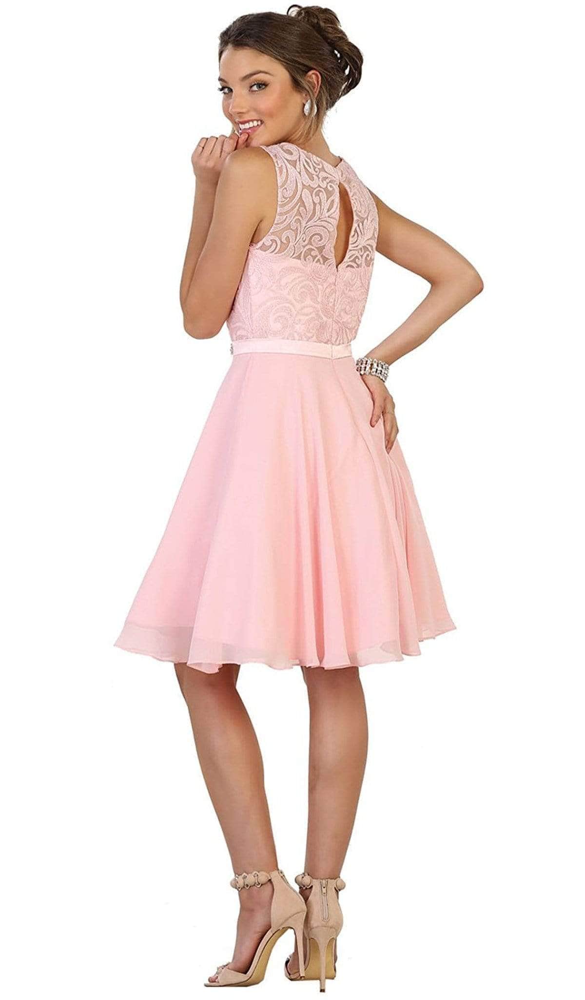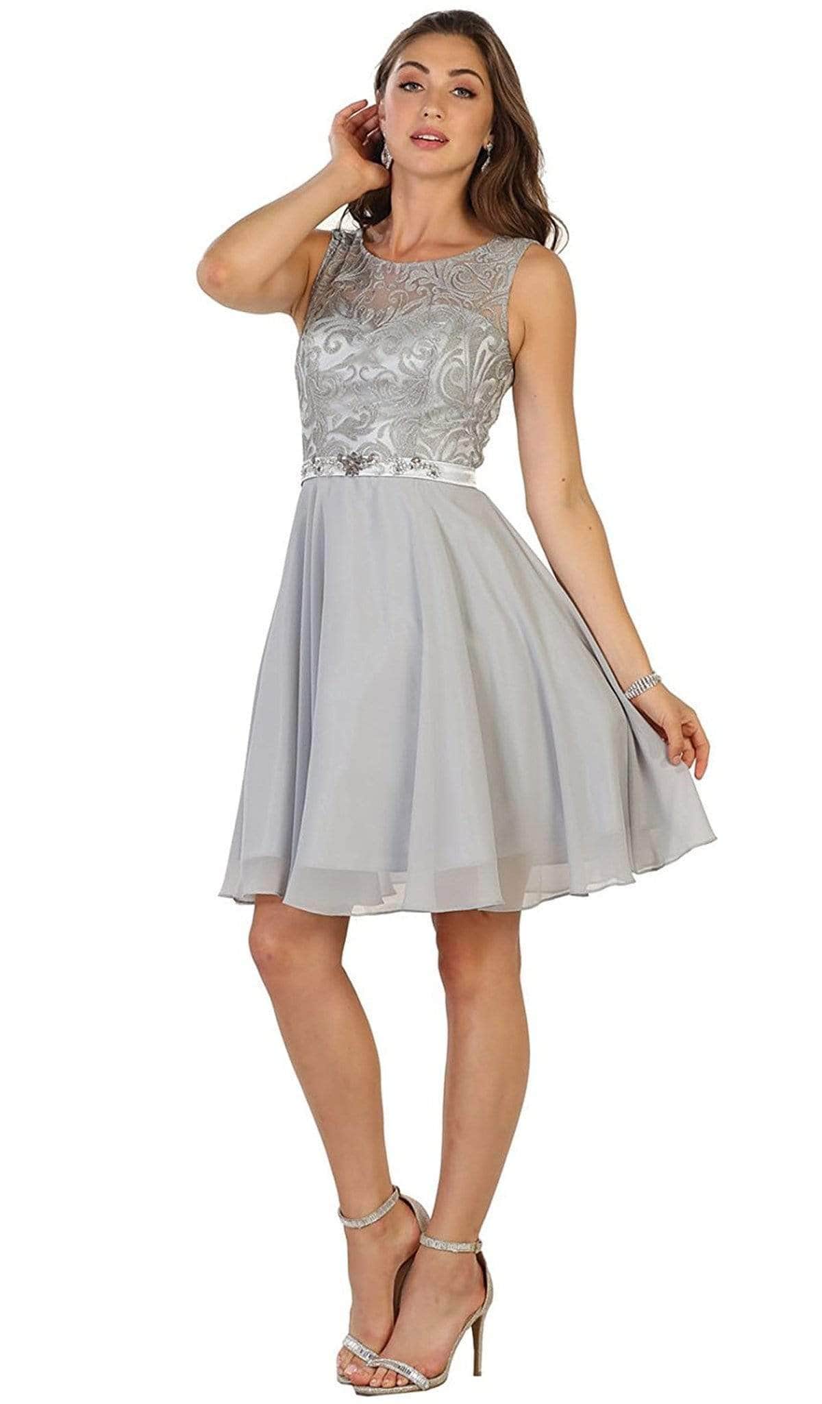 Glam up your wardrobe in a hit creation from May Queen 1521. The sleeveless dress highlights your natural beauty, and it’s adorned with floral lace appliques on the upper bodice. The wide shoulder straps provide support to the illusion jewel neckline, while the waist has a thin band and beaded embellishment for an opulent charm. This dress is completed in a knee-length A-line skirt and a keyhole back. You will undoubtedly turn heads in this May Queen 1521 dress. Models are wearing the Navy, Pink, and Silver colors.