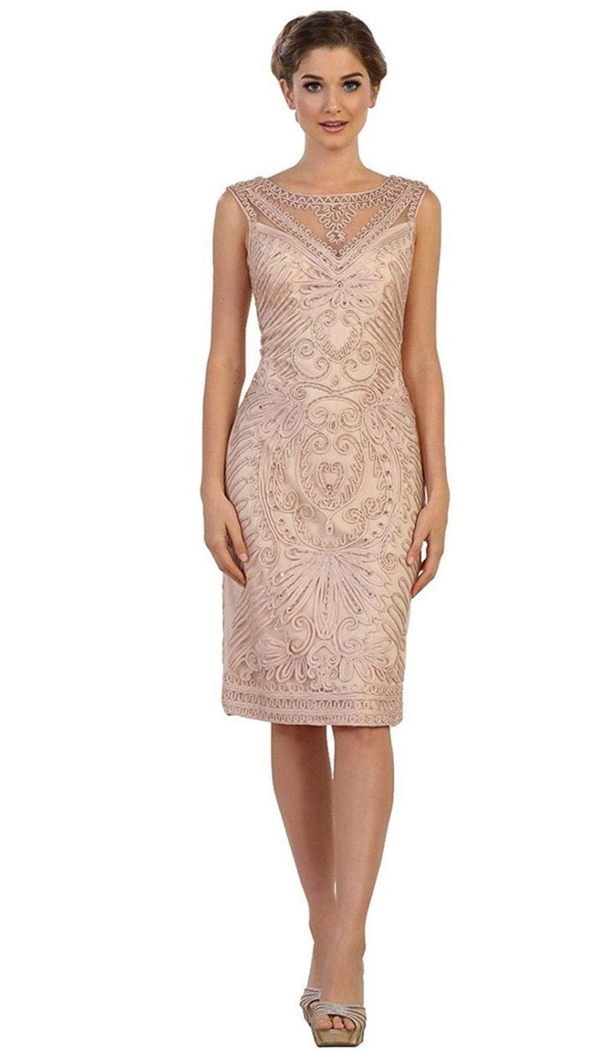 Heighten your charming appeal by wearing this May Queen MQ-1541 design. This knee length dress charms with an illusion bateau neckline and cap sleeves. The fitted bodice is embellished with beading and piping details. The V-back has a zipper closure while the skirt highlights your curves in a sheath silhouette. Flatter your shape with a sculpted dress from May Queen MQ-1541. Models are wearing the Burgundy, Champagne, Charcoal Gray, and Mauve colors.