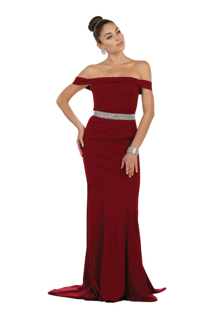 Look chic and seductive in this marvelous dress by May Queen MQ1545. This ensemble radiates elegance in an off the shoulder neckline. The sleek bodice is cinched in an embellished belt while the back has a zipper closure. Gracing the floor is a full length sheath skirt with sweep train. Exude a streamlined yet edgy style as you dance all night long in this alluring May Queen dress. Model is wearing Burgundy color.