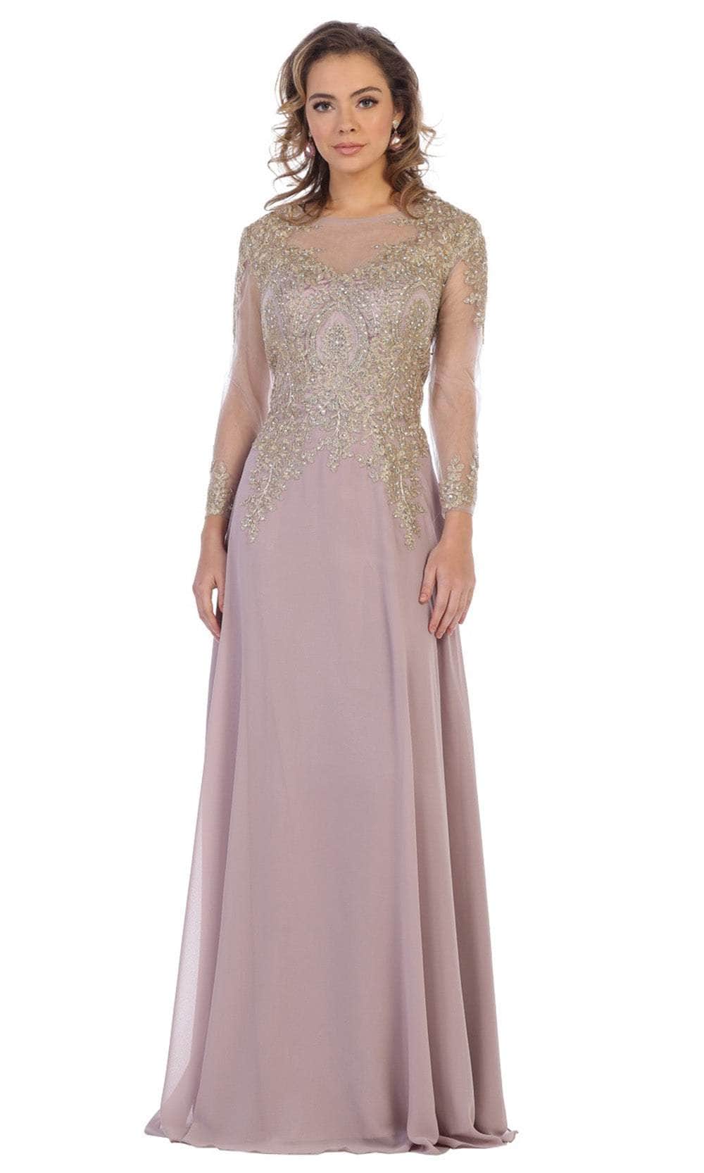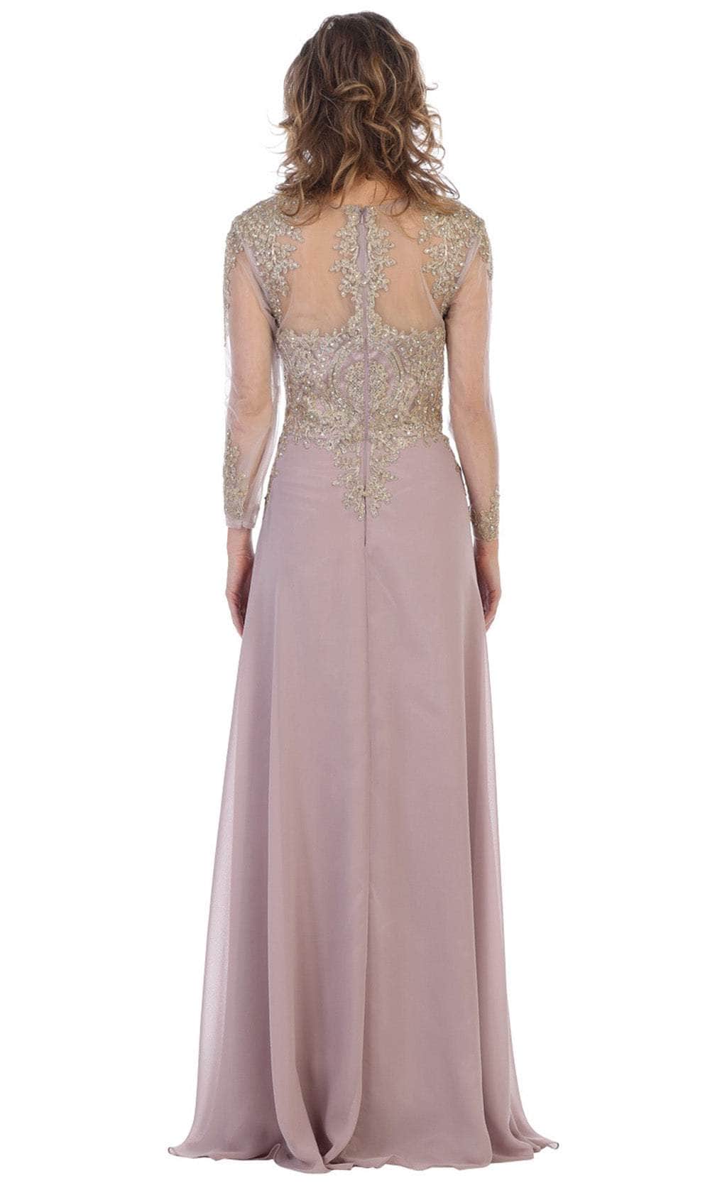 Captivate the crowd with your temptress beauty and grace wearing May Queen MQ1549. This fabulous dress features a jewel neckline and fitted bodice and sheer long sleeves ornate with embroidery. It has a sheath skirt that runs at full length hem. Enhance your visual appeal in this luxurious May Queen gown. Model is wearing Black/Gold, Champagne/Gold, Silver, and Mauve/Gold color dress.