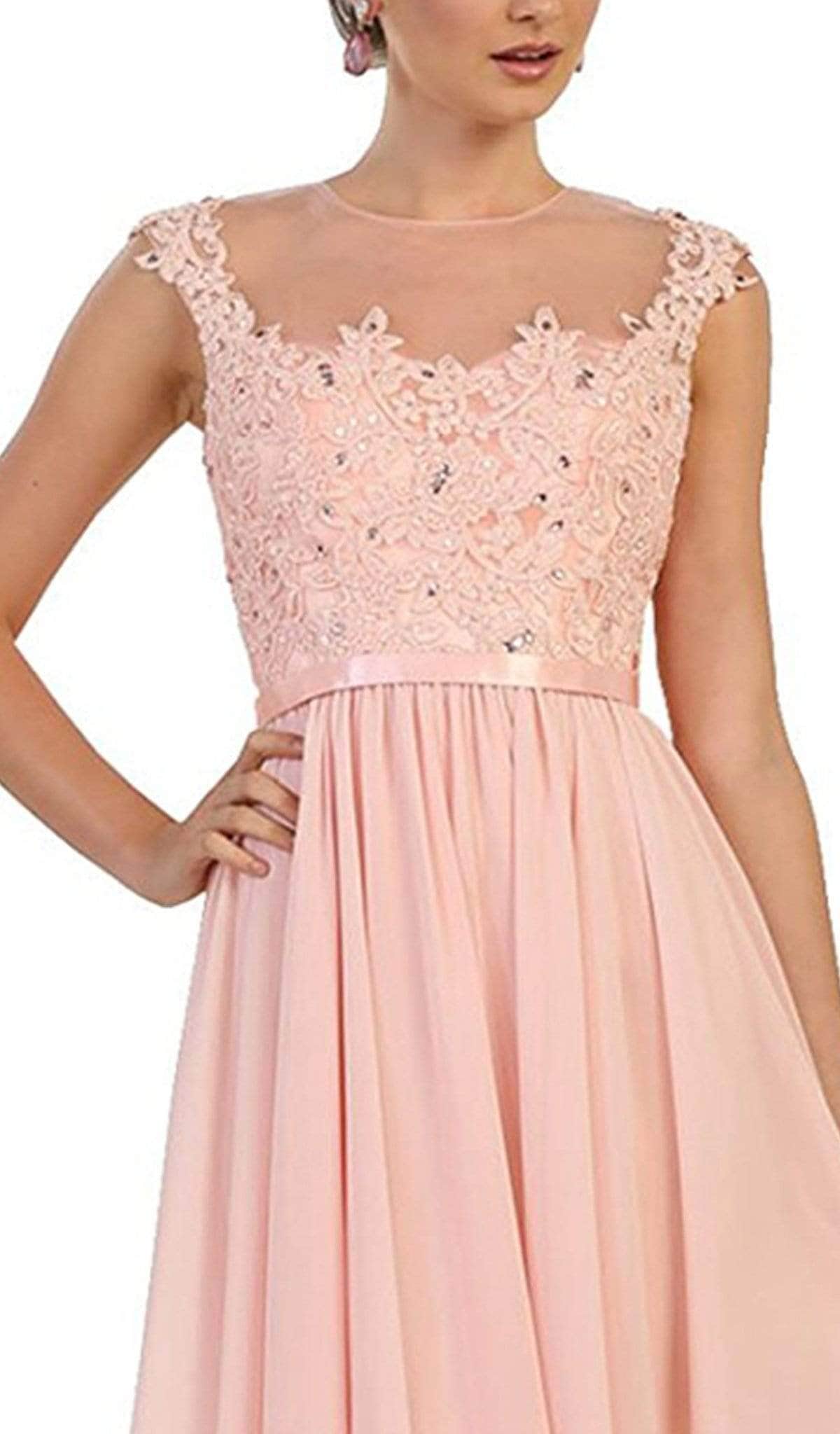 | Details: | Sheer Neckline, Cap Sleeves, Beaded Lace Appliques, Floral, Thin Waistband, Pleated Skirt, Sheer Full Back, Back Zipper Closure |