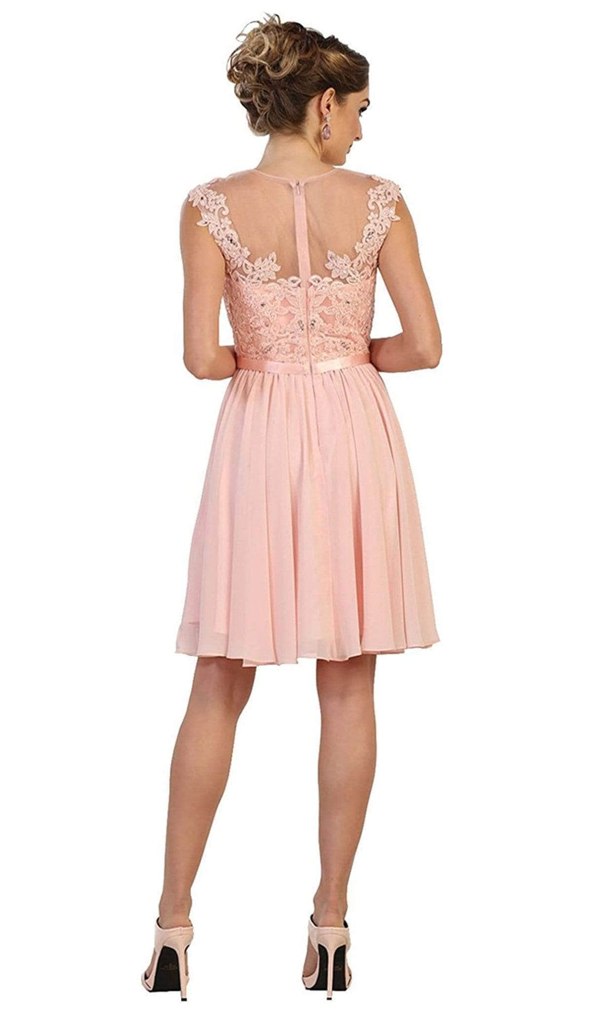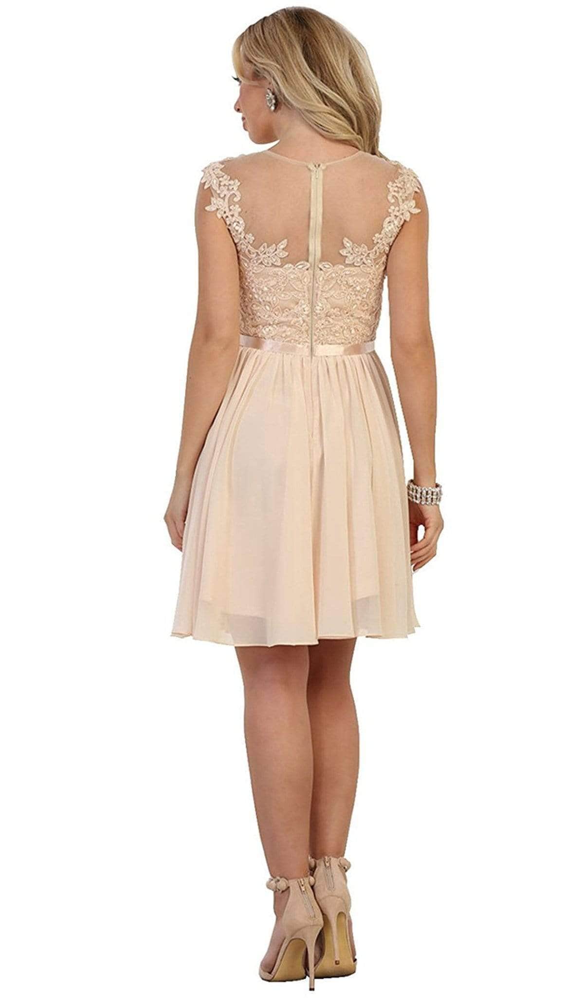 Look fresh and pretty in this creation by May Queen MQ1550. The floral lace applique and sprinkled beads on the upper bodice will make you stand out in the crowd. It shows off an illusion jewel neckline, cap sleeves and a partial illusion full-back. The thin waistband beautifully cinches your waist for a slimmer look. The soft pleated accents on the A-line skirt flow alluringly to the short hemline. Be dressed up beautifully with this Queen MQ1550 cocktail dress. Models are wearing the Blush, Burgundy, Champagne, and Silver colors.