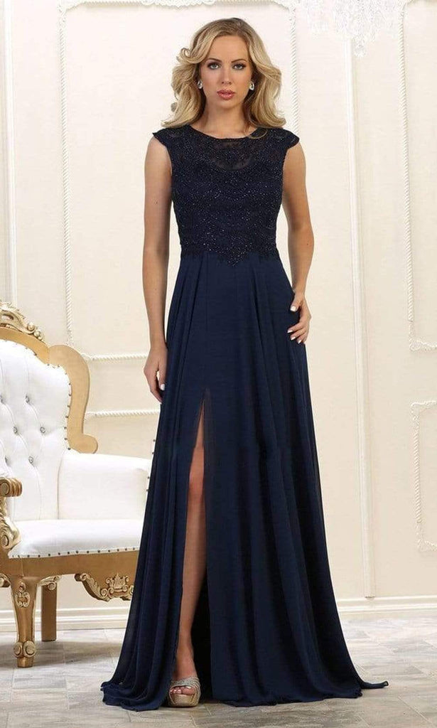Display your sophisticated sense of style in this lovely May Queen MQ1563B piece. Heat stone embellishments design the bodice, framed with an illusion bateau neckline and cap sleeves. Soft pleats highlight the a-line skirt, accented with a side slit to perfectly elongate your sexy leg, finished with a sweep train. Beam with pride when you wear this May Queen creation. Dress is pictured in Champagne, Dusty-Rose, Hunter-Grn, Mauve, Navy, Royal, and White colors.