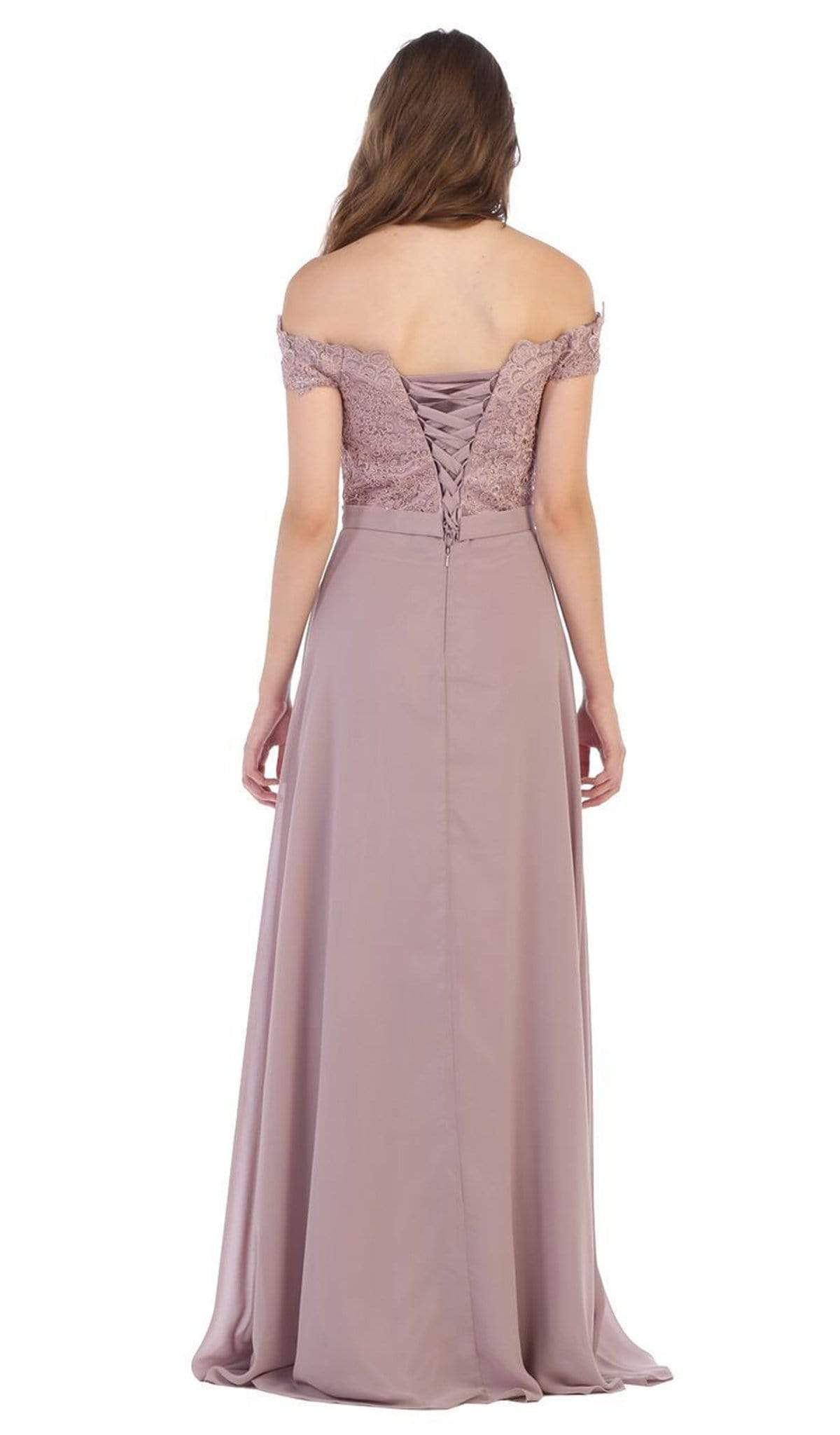 Be stunningly pretty wearing this long formal evening gown by May Queen MQ1601. This full length Chiffon gown is framed with an off shoulder fitted bodice beautifully textured with lace applique details. The back reveals a corset style lace up details for an adjustable fit, followed by a center zipper closure at the end. This fabulous ensemble features a full-length solid chiffon skirt that finishes at floor length. Charm everyone from all angles as you shine all night while dancing in this evening gown by May Queen. Models are wearing the Mauve and Silver colors.