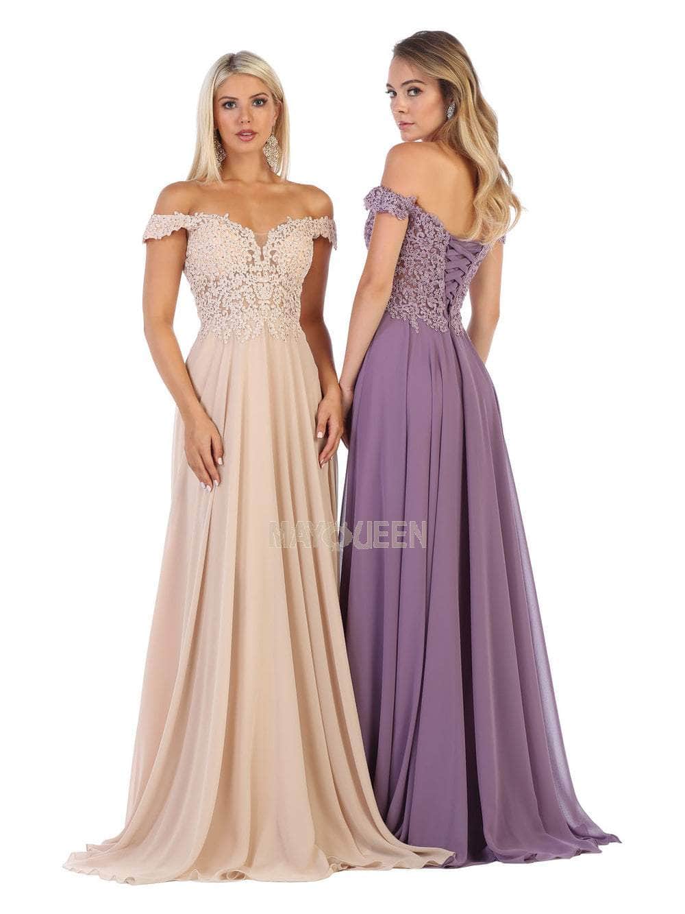 Heighten your charming appeal in this long evening formal gown by May Queen MQ1602. Divinely crafted in solid chiffon fabric, this full length dress boast a slightly V neckline and scoop back with an over the shoulder cap sleeves and lace appliqued fitted bodice. The back is styled with lace up closure for a much comfortable fit, followed by a zipper closure at the end. The luxurious skirt of this special occasion dress features fine gathers and flutters through the floor length. Twirl and shine in this simple but captivating creation from May Queen. Dress is pictured the variants: Burgundy, Champagne, Mauve, Navy, Red, Victorian Lilac and Dusty Rose.