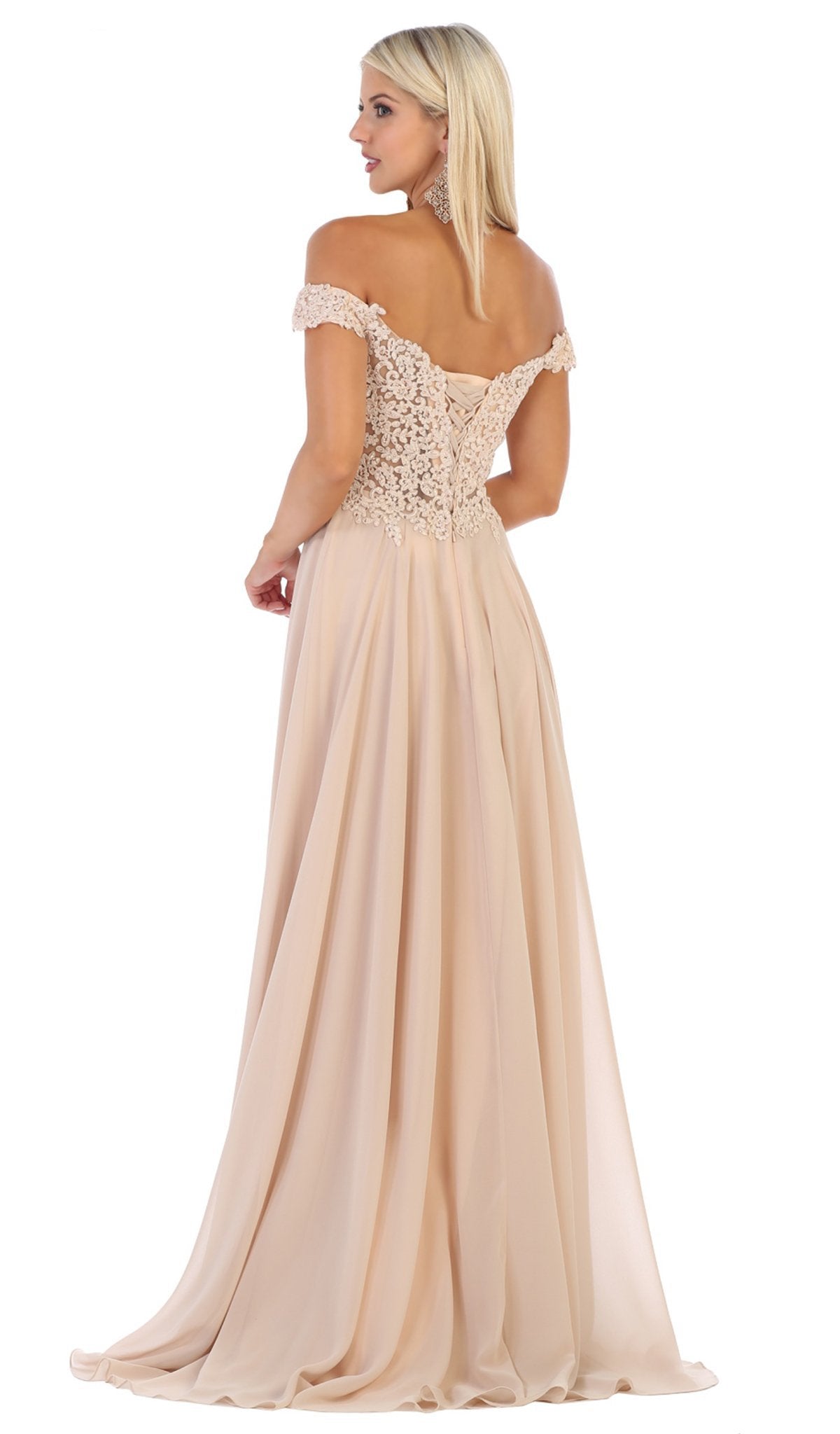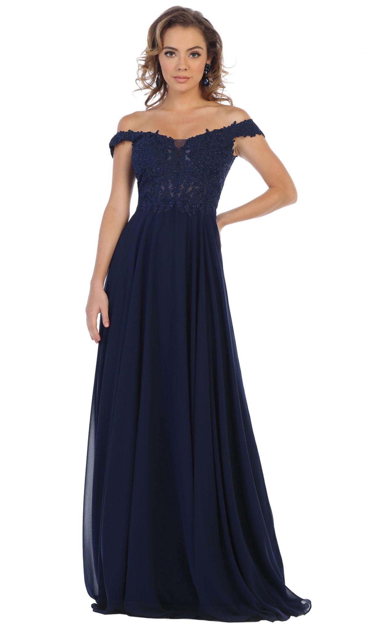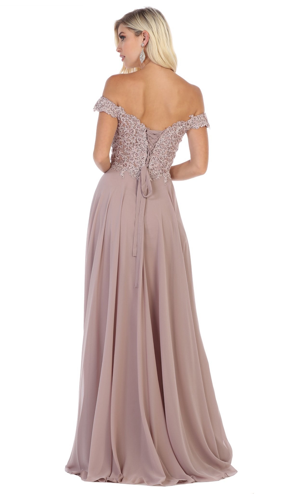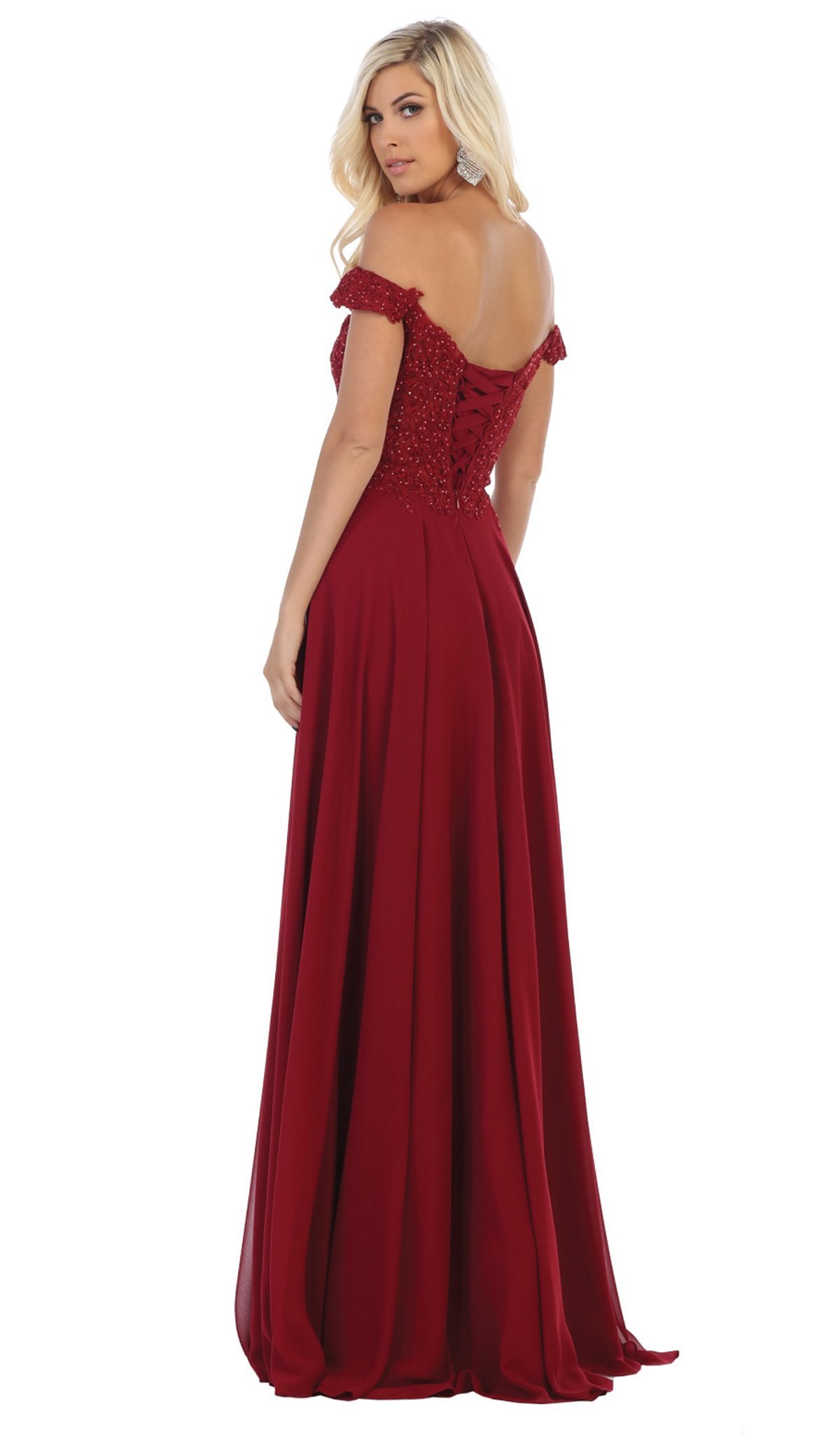 Appear in defined sophistication and beauty wearing this lovely evening dress by May Queen MQ1602B. Gorgeous floral appliques design the sweetheart bodice with off-shoulder straps complemented with a laced up mid-open back. Fabulous pleats adorn the a-line skirt as it smoothly flows to the floor completed with a small train. This May Queen ensemble will definitely make you feel special.  Dress is pictured in the variants: Burgundy, Champagne, Dusty Rose, Mauve, Navy, Red, and Victorian Lilac, Dusty Blue, and Sage colors.