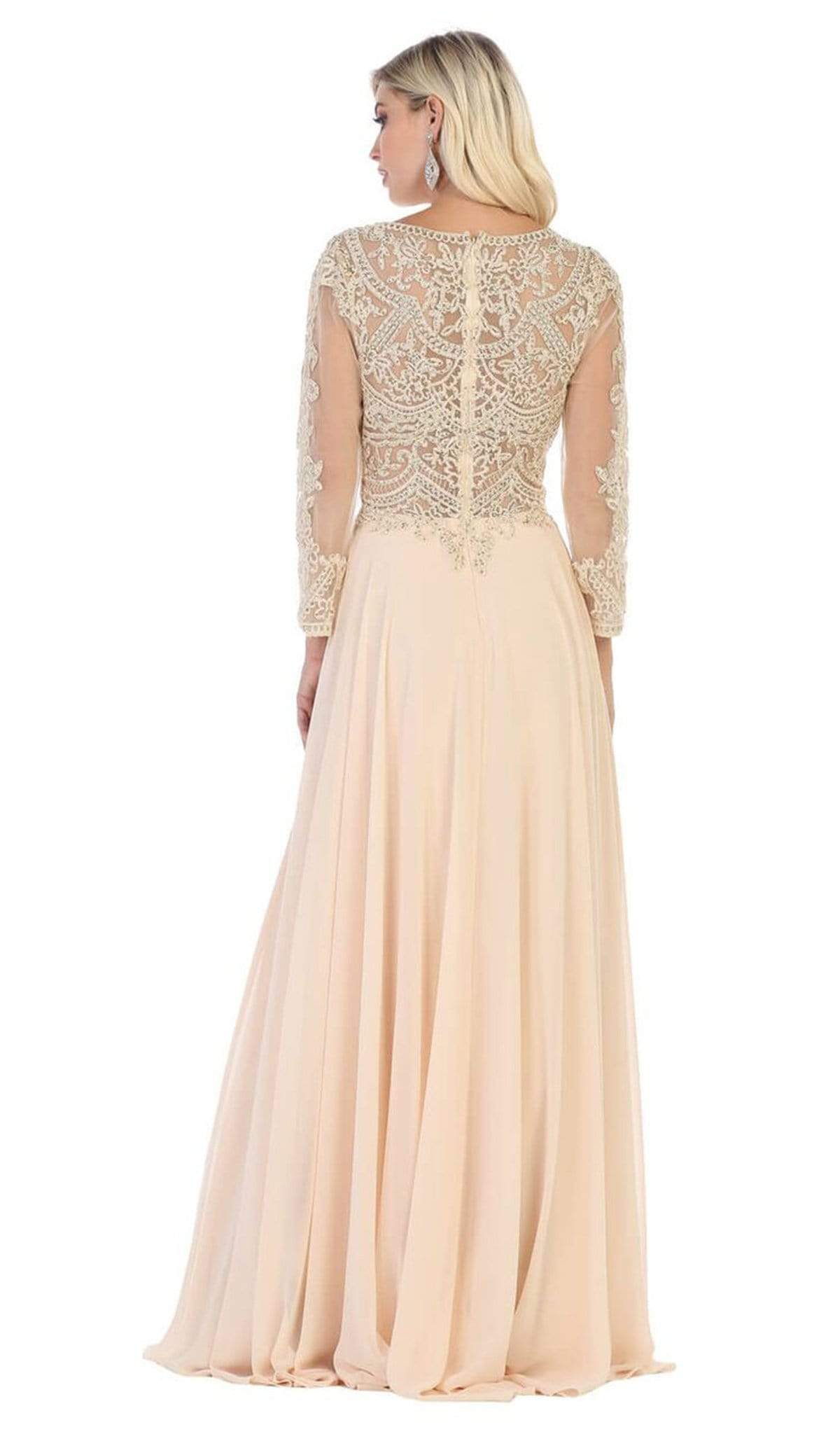 May Queen - MQ1615 Embroidered Long Sleeve Bateau A-line Dress