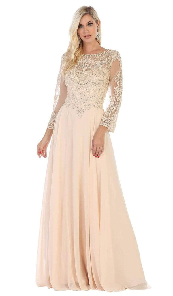 Get noticed in any crowd wearing this May Queen MQ1615B masterpiece. Featuring a beautiful illusion bodice crowned by long sleeves and a bateau neckline, the dress is a true showstopper. A lovely lace appliques and beadings decorate the upper bodice. It also displays a zipper fastening on the illusion full back. The skirt fashions a flowy A-line silhouette that reaches the floor and finishes with a sweeping train. Look fabulous for your event in this May Queen MQ1615B dress. Models are wearing Champagne, Dusty-Rose, Mauve, Mocha, and Navy colors.