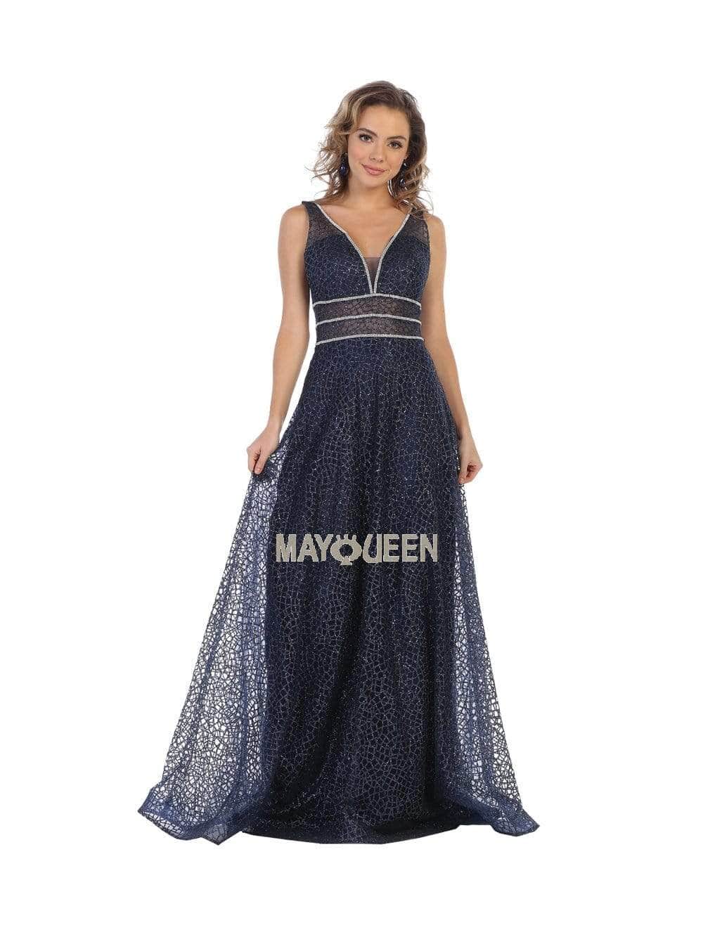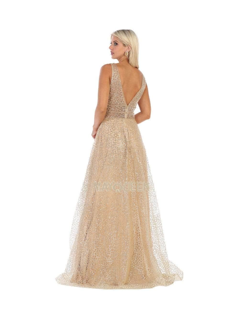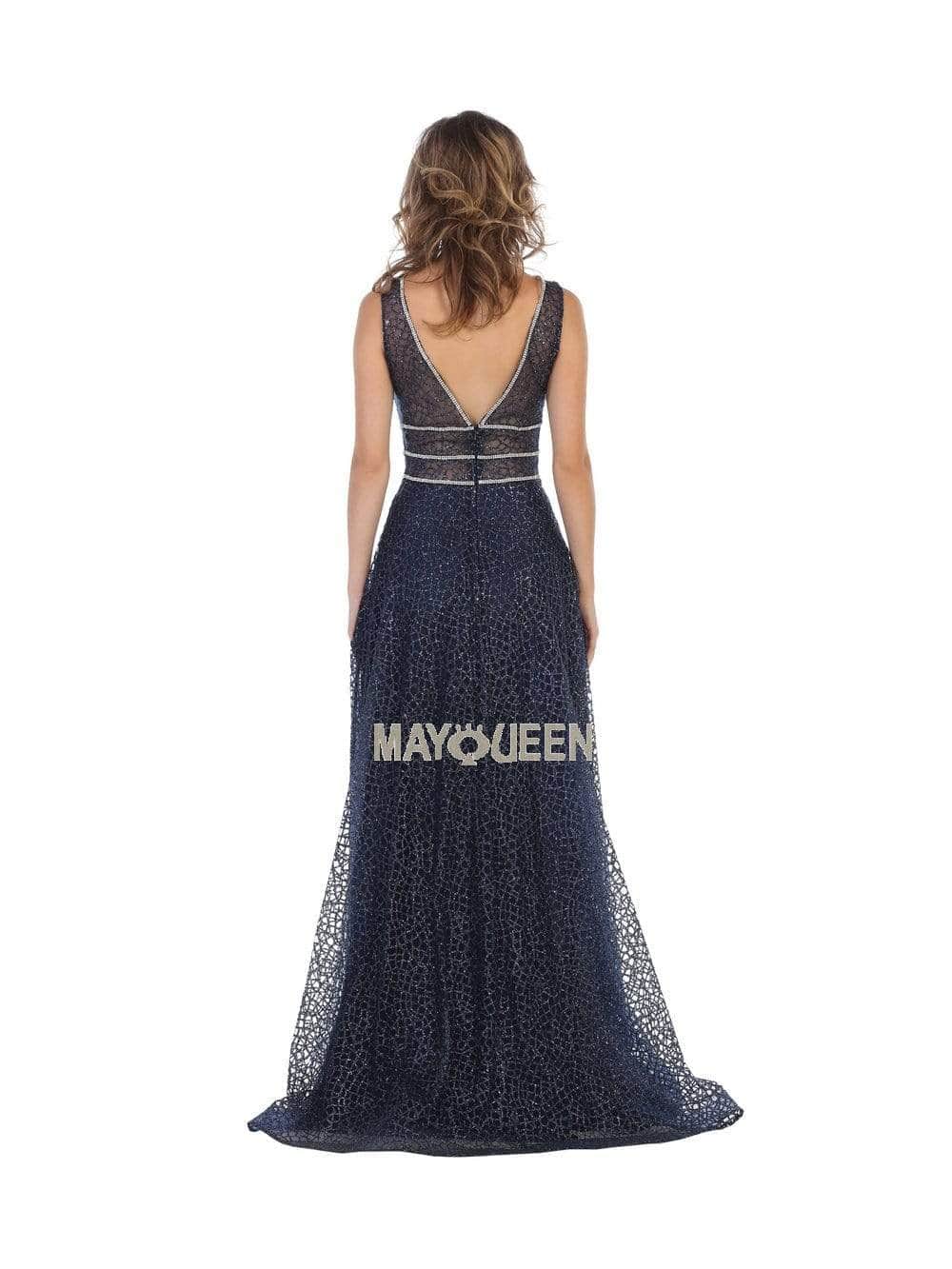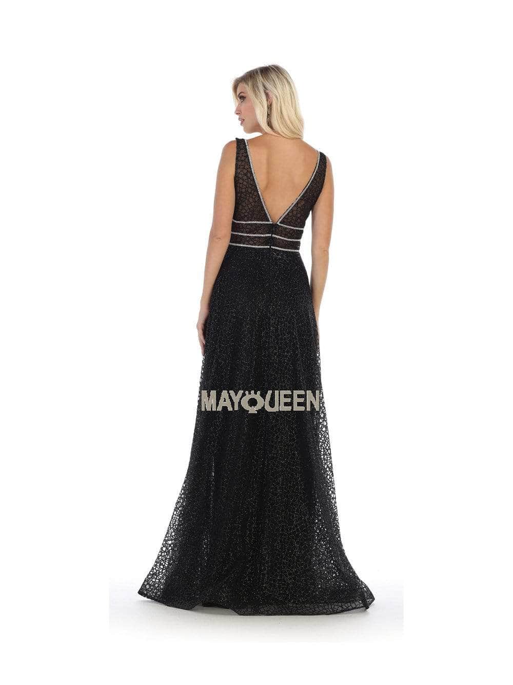 Impress pure decadence in this beautifully adorned dress by May Queen MQ1623. These embellishments on the dress dazzles in a sleeveless, deep V-neckline with a fitted bodice and a low V-back. The skirt flourishes in a full-length A-line silhouette. Wrap yourself in a purely stellar dress from May Queen MQ1623. Models are wearing the Black, Burgundy, Gold, Navy, and Silver colors.