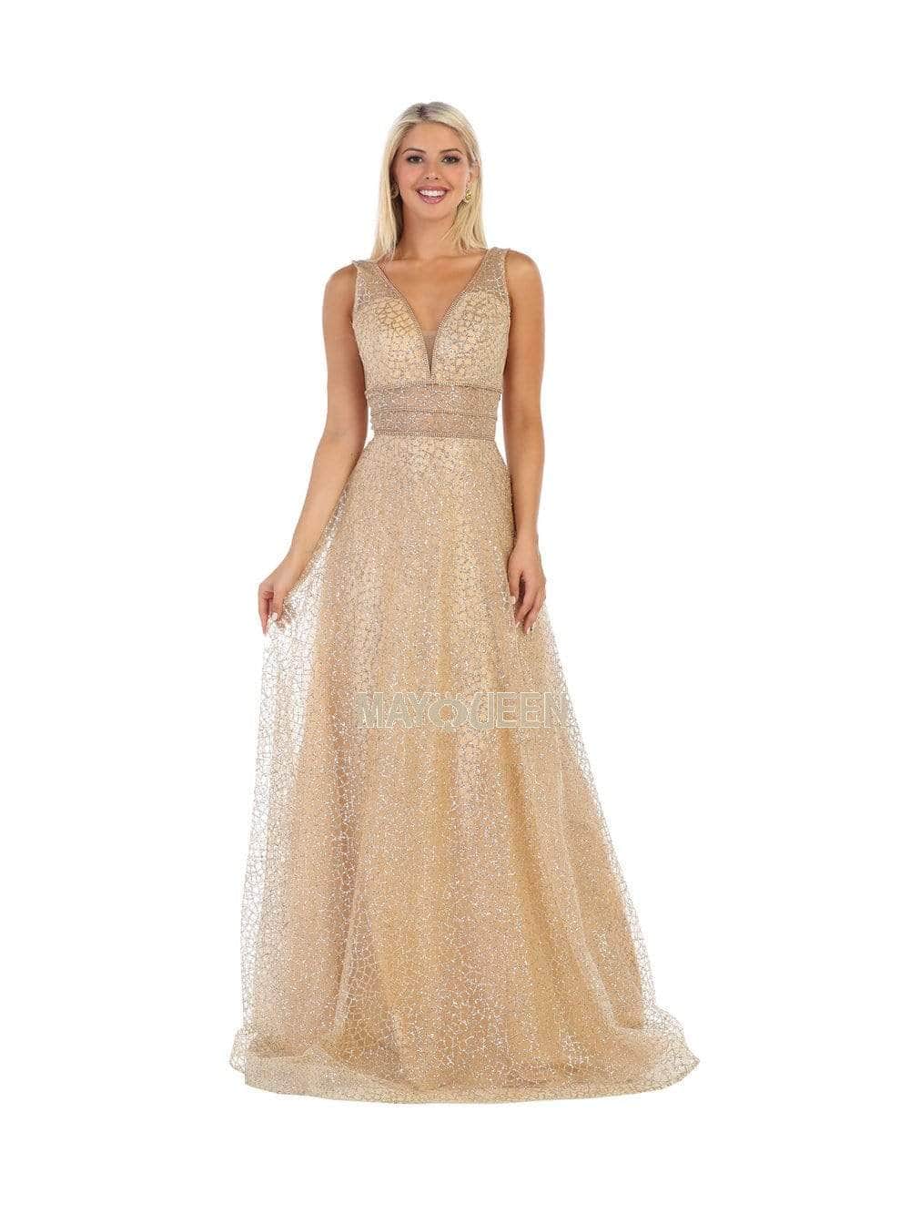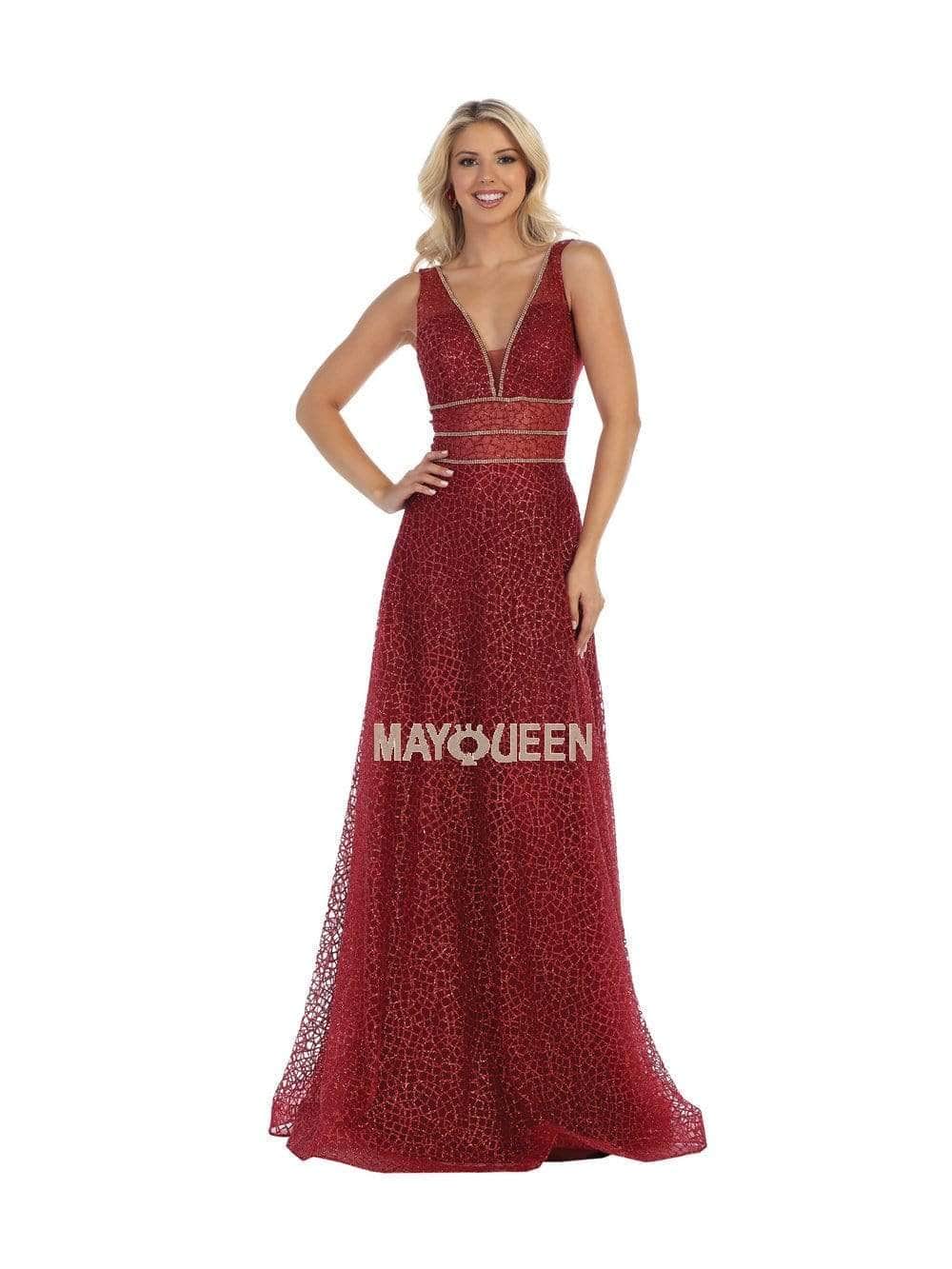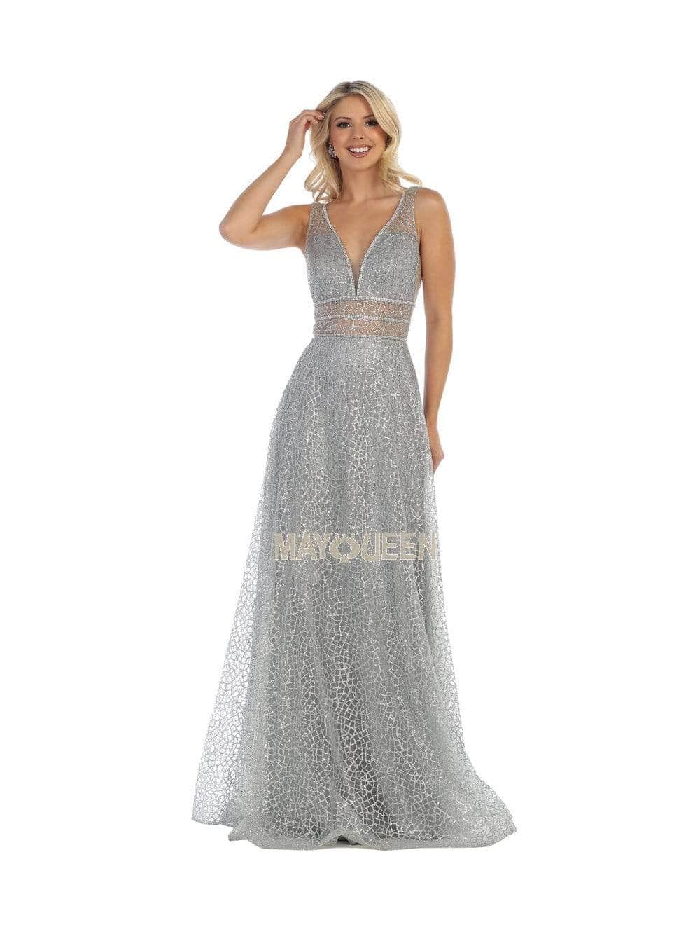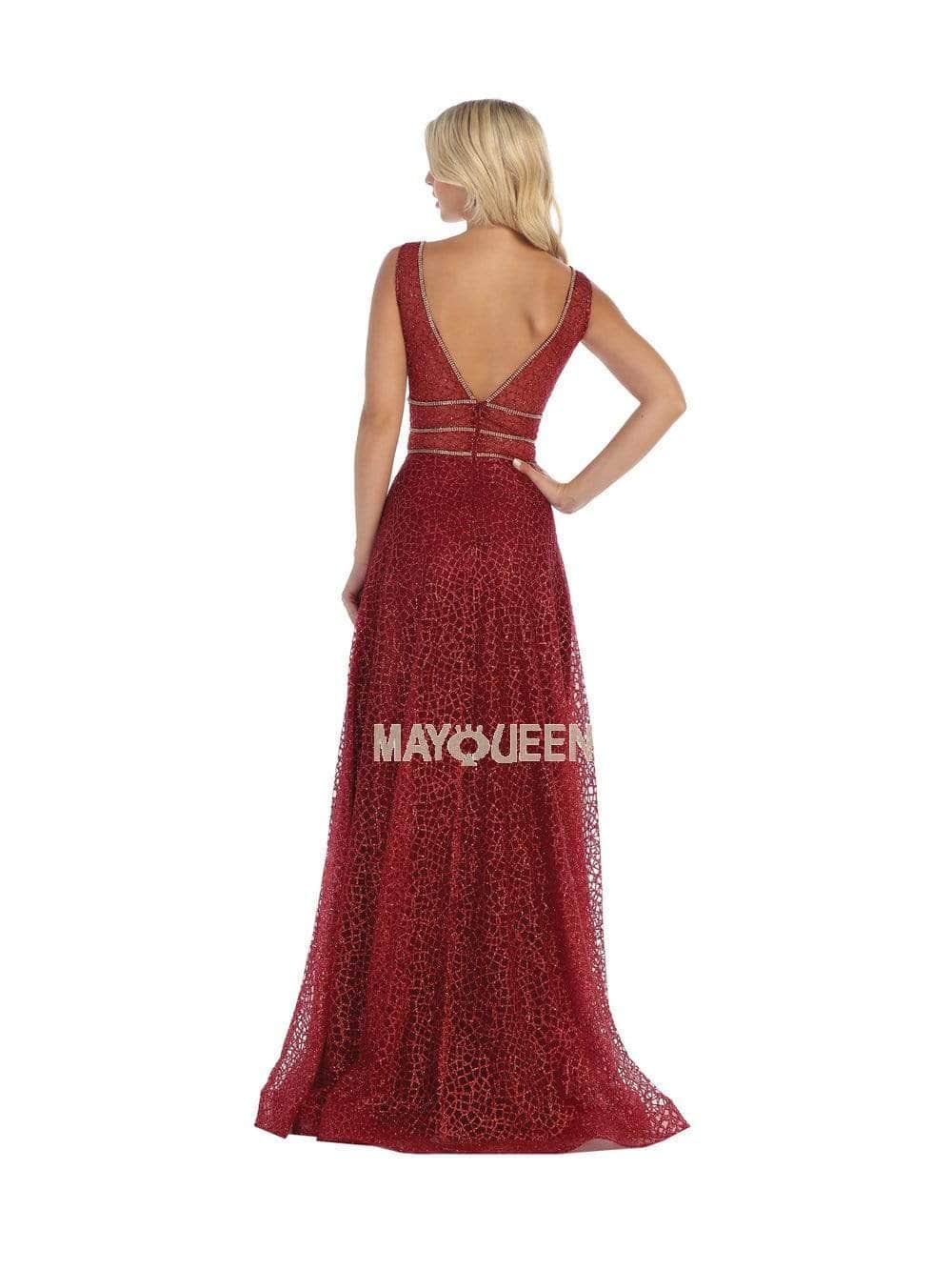 Impress pure decadence in this beautifully adorned dress by May Queen MQ1623. These embellishments on the dress dazzles in a sleeveless, deep V-neckline with a fitted bodice and a low V-back. The skirt flourishes in a full-length A-line silhouette. Wrap yourself in a purely stellar dress from May Queen MQ1623. Models are wearing the Black, Burgundy, Gold, Navy, and Silver colors.