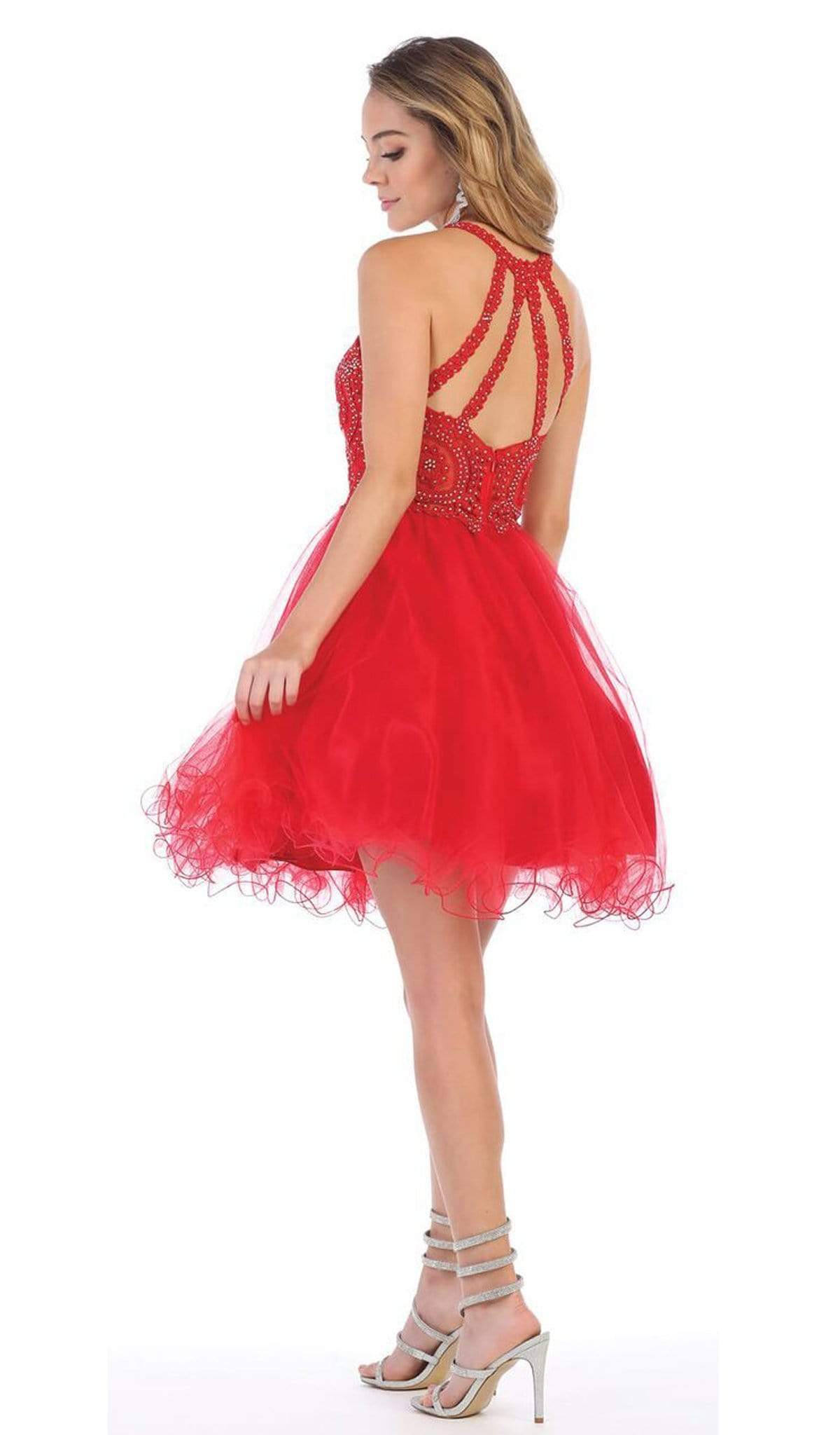 Feel like a dainty belle as you impress the crowd wearing this pretty May Queen MQ1643 short cocktail dress. This fit and flare party dress charms in a sleeveless bodice embellished with beaded lace applique in stately pattern, features a sheer yoke leading to the jewel neckline edge with lace details. The back allures in a caged cutout framed in similar lace accented straps. The skirts frothy net over satiny sheet lining compliments a regal finish to this short special occasion dress. Be effortlessly breathtaking with this May Queen creation. Find more cocktail dresses.