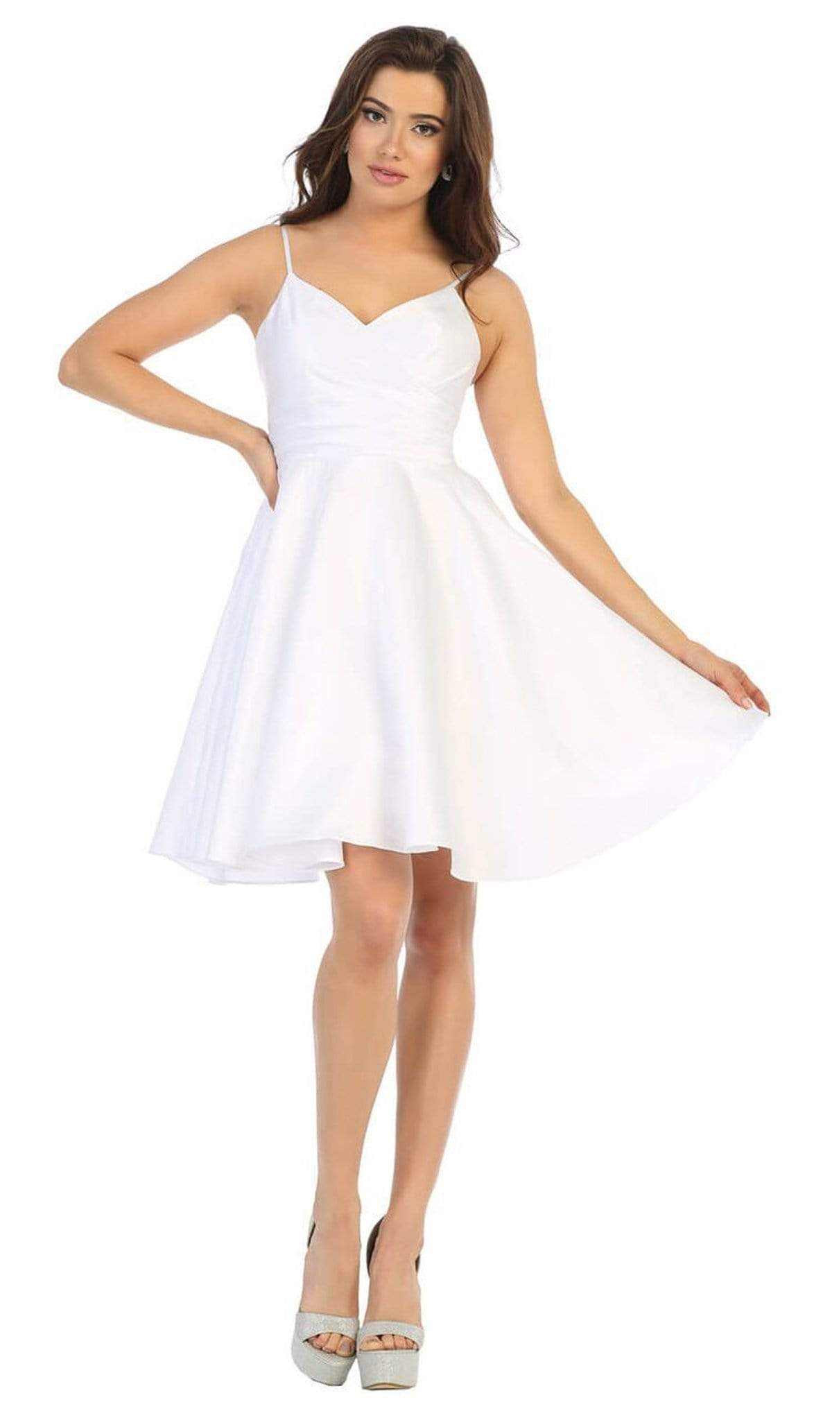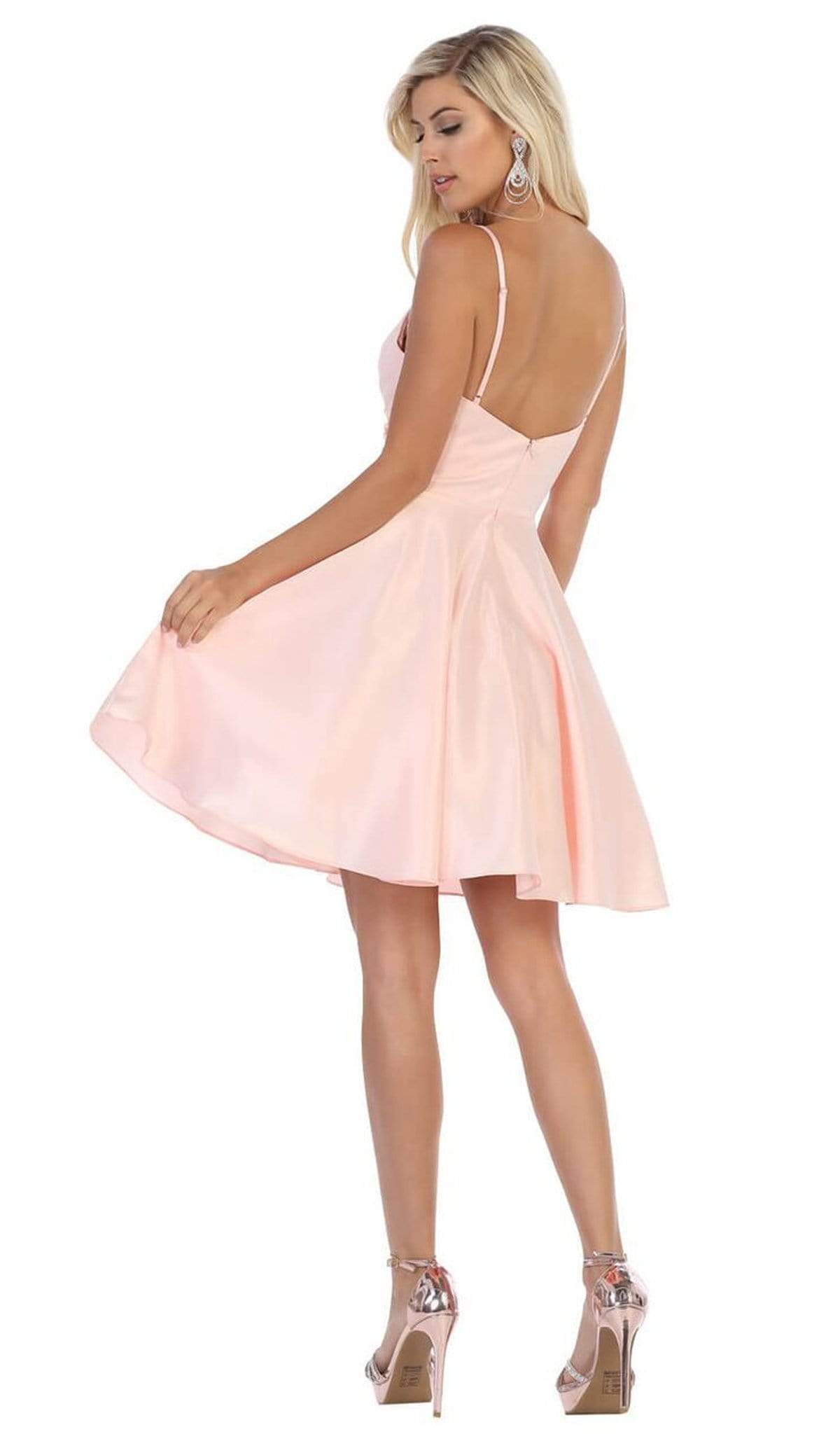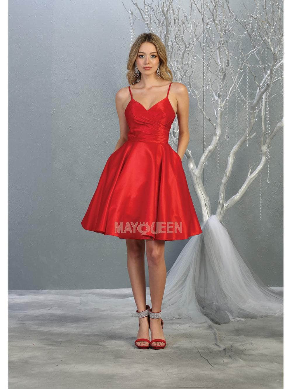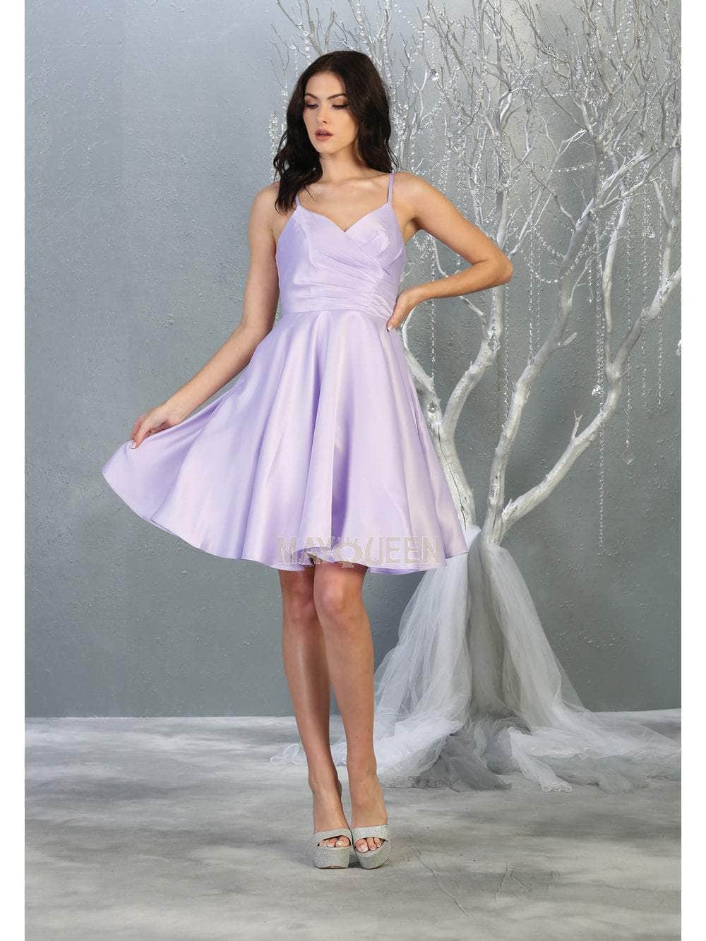 May Queen MQ1654 defines elegant simplicity. This satiny sleeveless short dress features a surplice style V neckline held by an adjustable fine shoulder straps, cinched natural waist and flared above the knee length skirt. This May Queen dress creates charming look and is an ideal dress for cocktail party, wedding and homecoming.