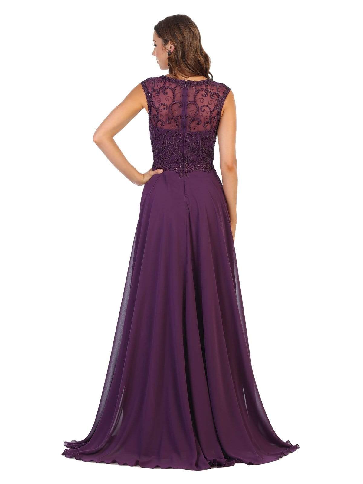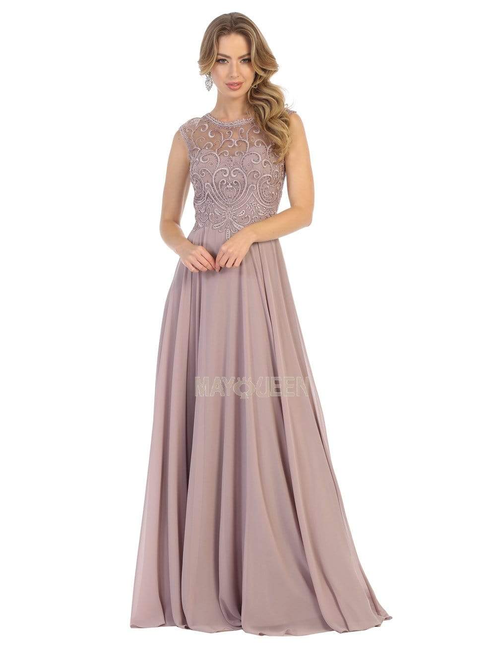 Showcase a classy and feminine flair in this May Queen MQ1707 creation. Embroidered with a swirl motif on a subtly cap sleeved bodice, this dress flatters with an illusion jewel neckline. Crafted with an illusion full back, the chiffon skirt cascades into a full-length hemline and a sweep of train. Charm everyone with the gorgeous style of this May Queen masterpiece.