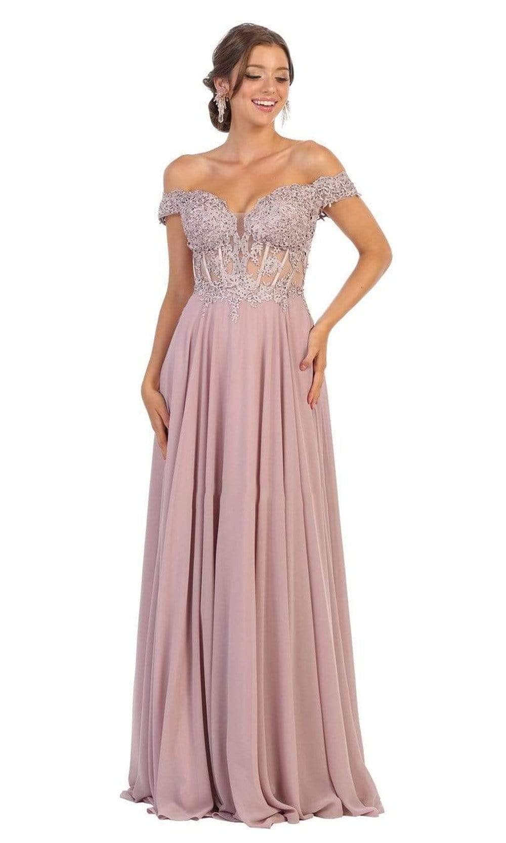 Impress everyone with the mesmerizing elegance of this May Queen MQ1714 creation. Ornamented with rhinestones and lace appliques, this dress features an off shoulder neckline with a sheer overlaid sweetheart inset. Corset boning ornate the sheer bodice as the back is nipped with a lace up design. The chiffon skirt cascades to the floor with a brush of train. Make everyone swoon when you show up in this May Queen masterpiece.
