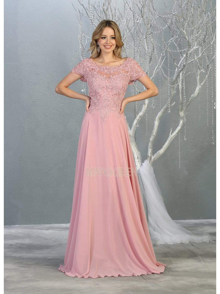 Inspire people to take a gander at your stunning beauty in this May Queen MQ1763 creation. Overlaid with a sheer lace overlay, this dress fascinates with jewel-strewn appliques on its bodice. Designed with short sleeves, this ensemble shows off a scoop neckline with a sheer lace accent. Streaming from the waist with lace appliqued details, the chiffon skirt flutters into a fascinating train. Look like an elegant vision on the red carpet in this May Queen MQ1763 masterpiece. Models are wearing the Burgundy, Dusty Rose, Mauve, Navy and Perry Blue colors.