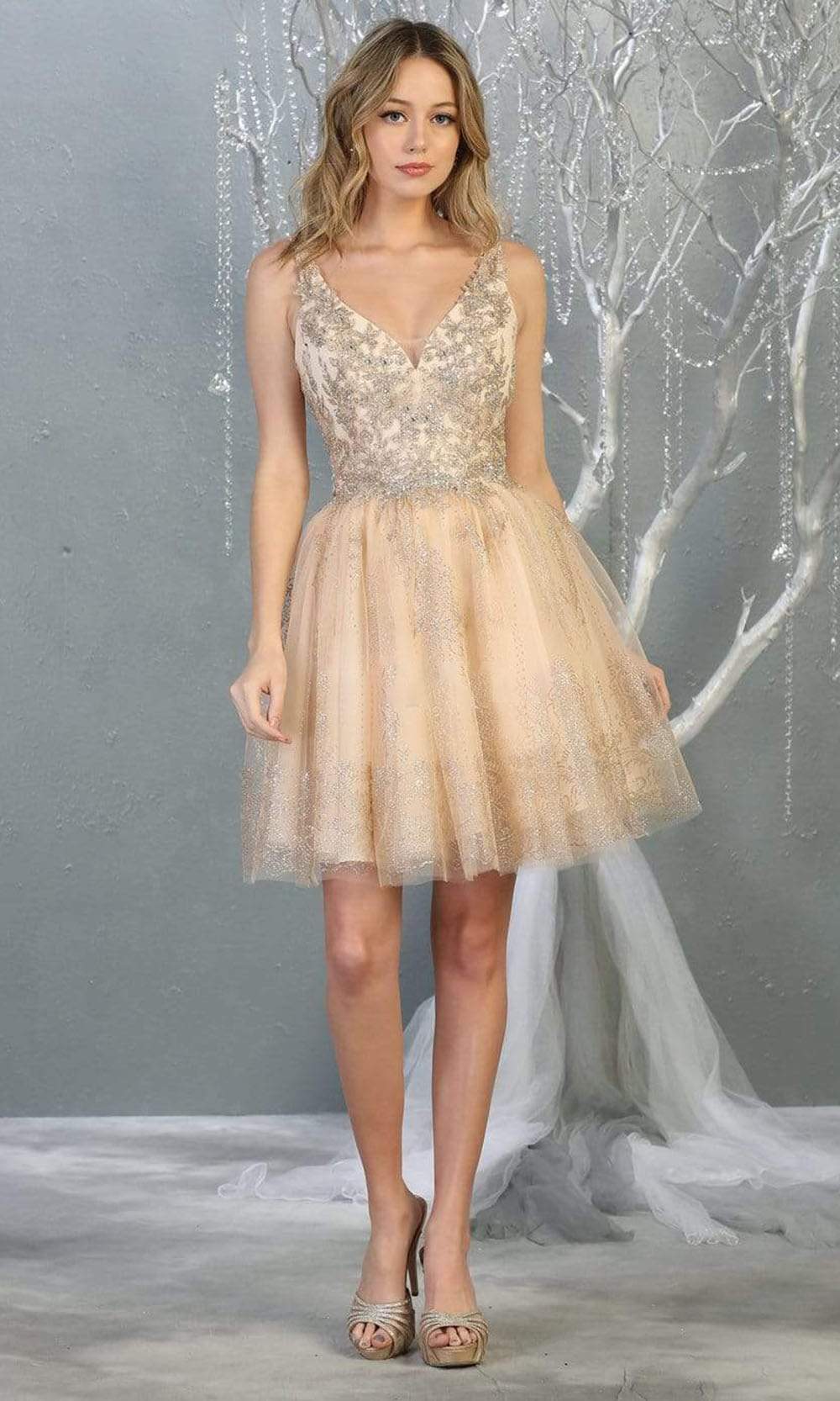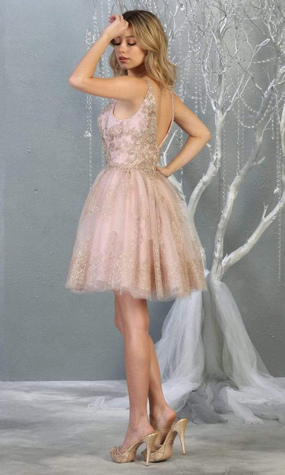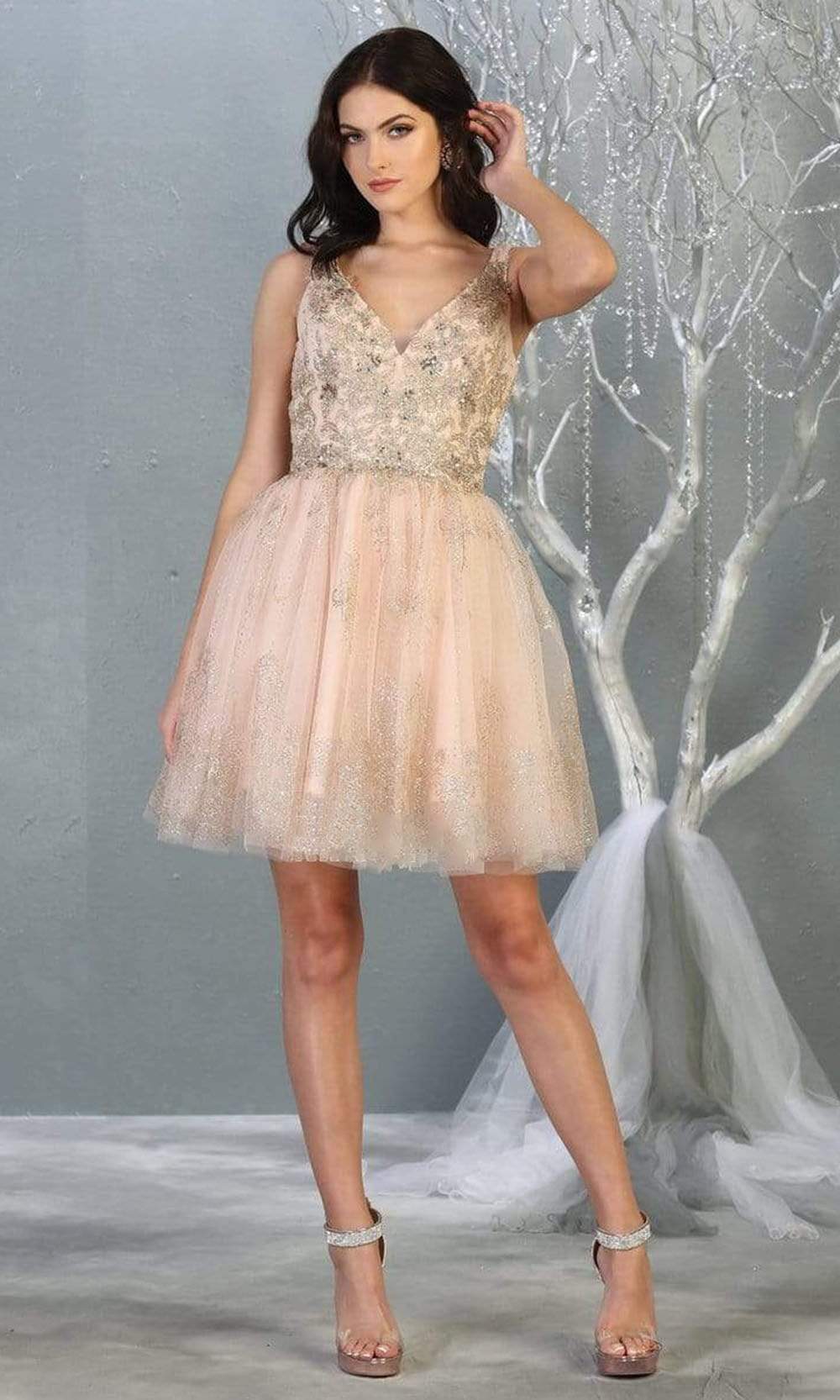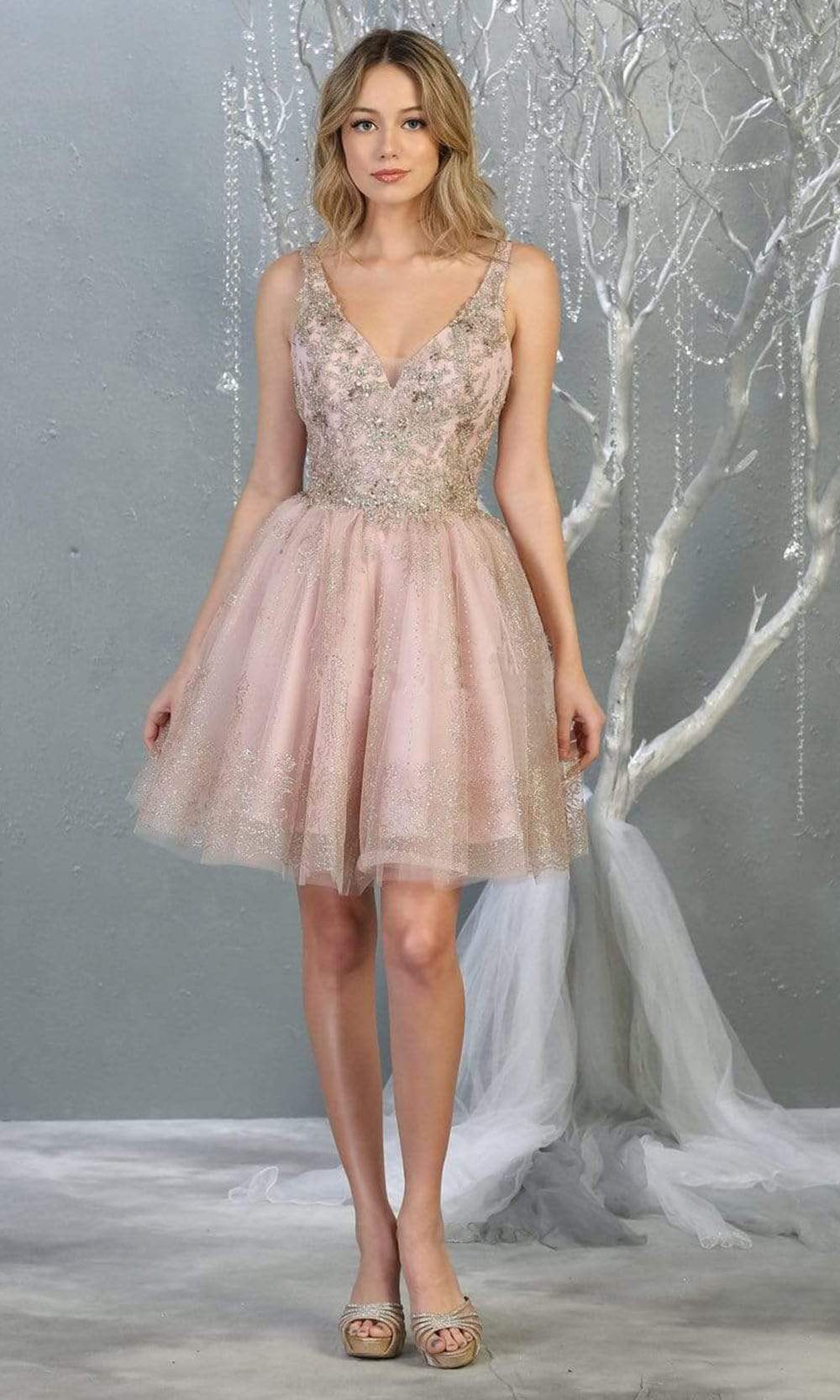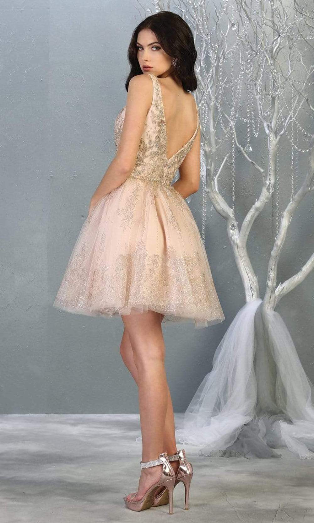 Shine like the stellar beauties of the night in this May Queen MQ1817 creation. Designed with metallic appliques on a sleeveless bodice, this dress reveals a deep v-neckline with a sheer modesty inset. A deep v-open back rhymes with the intricacy of its fitted bodice. Fascinating glitter details ornate its skirt as it flares into a short A-line silhouette. Make heads turn in this exquisitely made May Queen masterpiece.