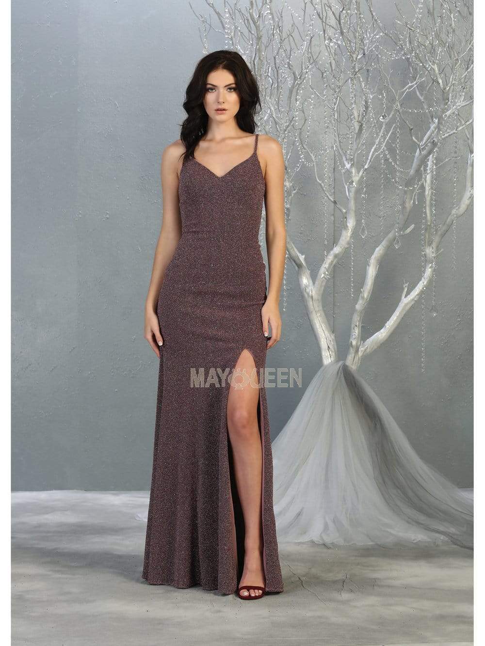 Sizzle all night in this fabulous look by May Queen MQ1822. Dazzles in a sleeveless, deep V-neckline with a fitted bodice and back zipper closure. The dress has a flattering trumpet skirt with a slit and a sweep train finish. This May Queen dress is specially designed to make that special occasion worth reminiscing.