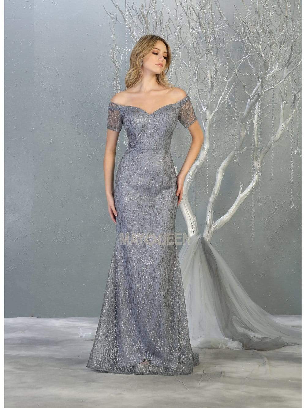 Make everyone stare as you show up in this dazzling May Queen MQ1824 masterpiece. The whole ensemble is designed with glitter accents as the fitted bodice showcases an off-shoulder neckline which extends to sheer short sleeves. The skirt parades a sheath silhouette which cascades to a full length hemline, completed with a sweep train. Be in this stunning May Queen and leave a lasting impression.