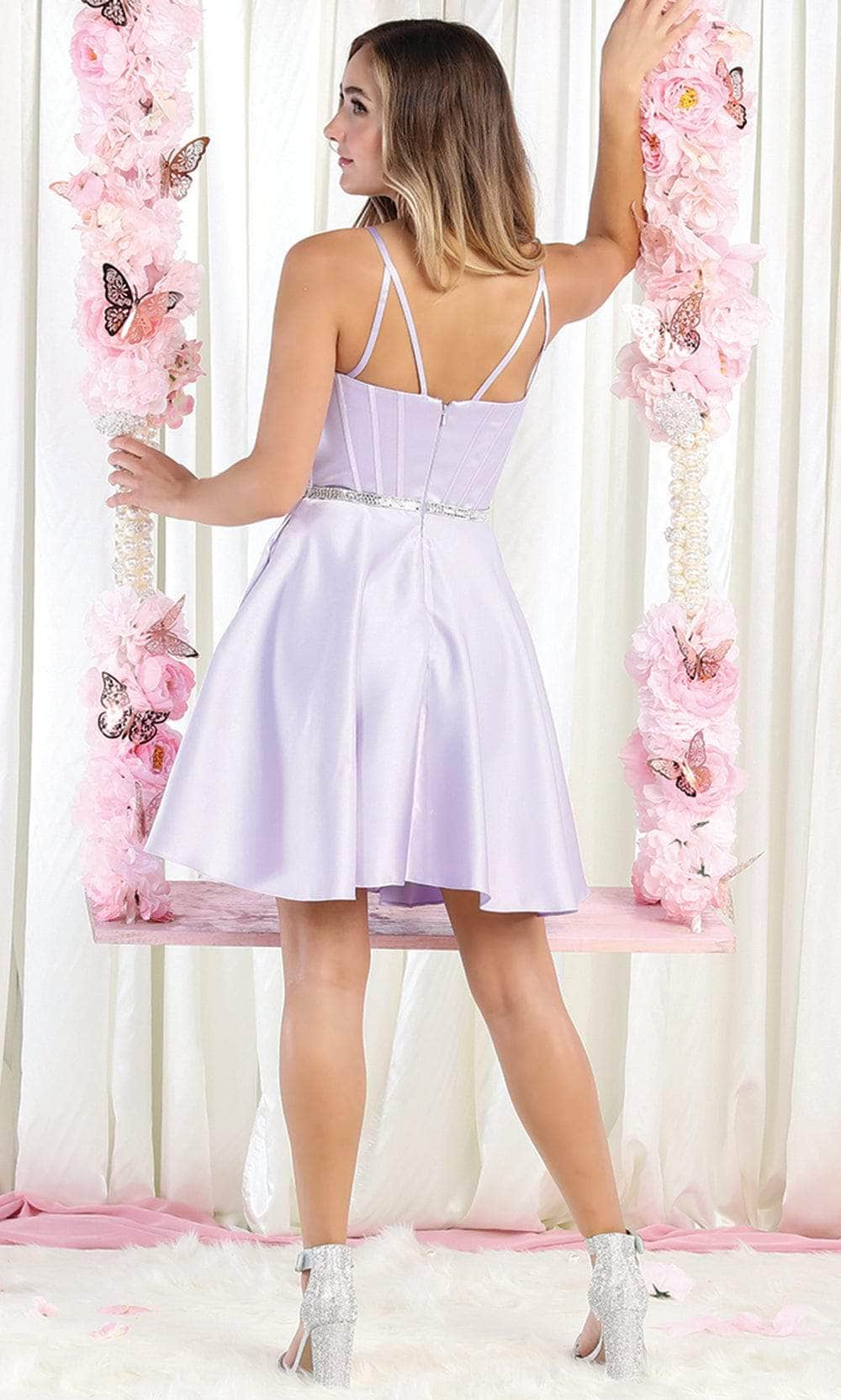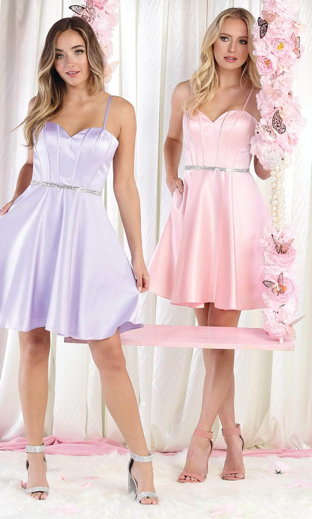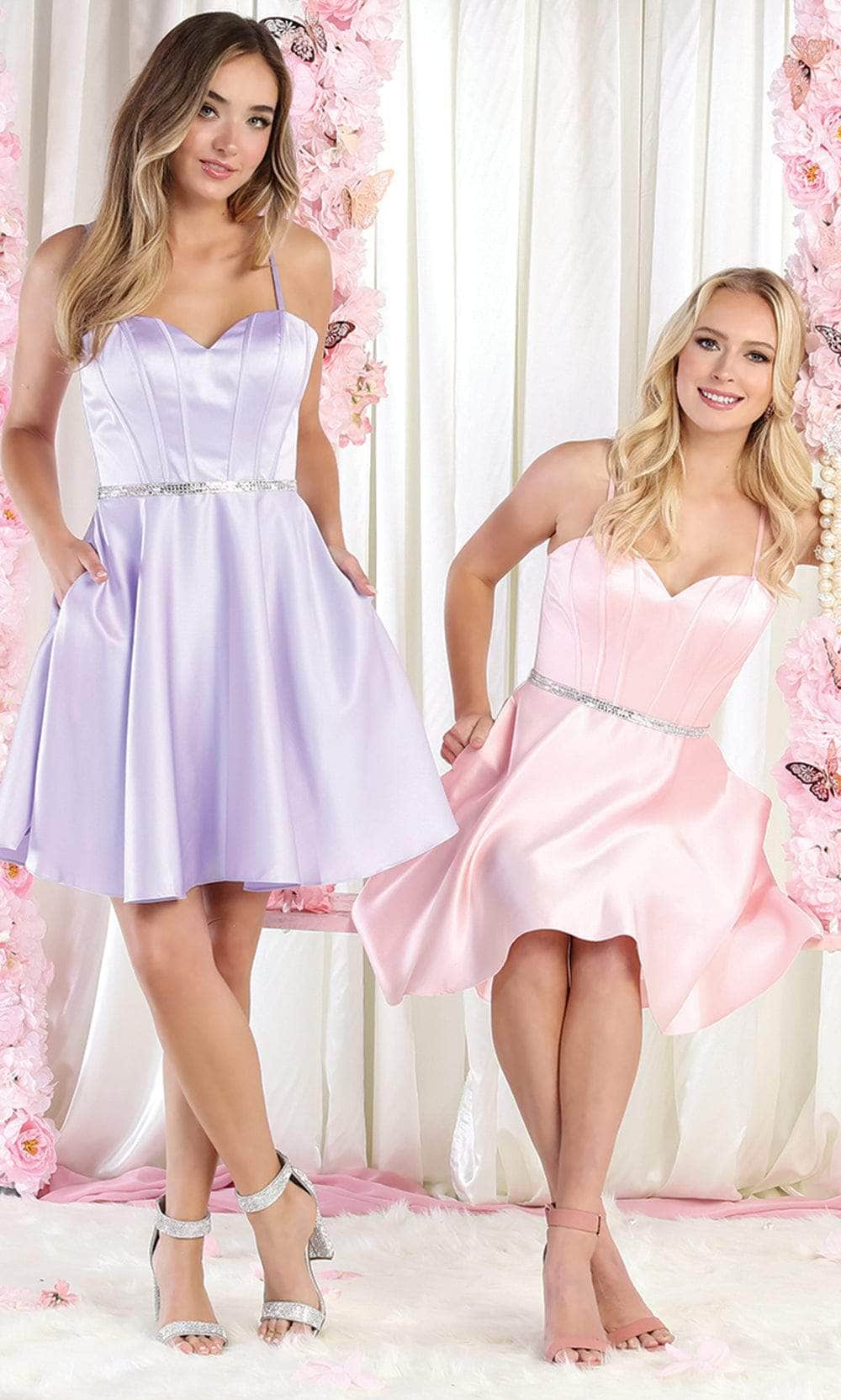 Turn heads instantly when you wear this May Queen MQ1864 masterpiece. This adorable sleeveless dress boasts a bustier bodice with pipe details and a sweetheart neckline. It is supported with spaghetti straps leading to the midrise back and making a strappy design. Crowned with a metallic waistband for a slender appearance, the skirt is styled in an A-line silhouette that flutters into a lovely short hemline. Complete with pockets on both sides. Heighten your charming appeal in this May Queen MQ1864 dress. Models are wearing Baby Blue, Black, Blush, Burgundy, Champagne, and Lilac colors.