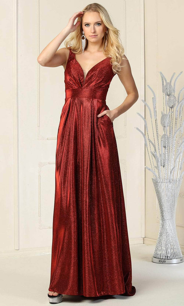 Strike a pose as you enter the room in this exquisite May Queen MQ1875 masterpiece. Beautifully tailored with glitters all over its length, this gown charms in  sleeveless and plunging V-neckline with soft ruching and sheer inset detail at the bust. The scoop back is enclosed with back zipper closure. Defined with a wide waistband, the pleated skirt has side pockets and flares stunningly into a full length A-line silhouette. An alluring sweep train completes this look. Bloom with beauty and love as you saunter towards forever in this May Queen creation. Wherever you go, whatever you wear, leave a long-lasting impression on the gathering with May Queen’s collection of dresses for bridal, bridesmaid, prom, homecoming, cocktail, formal, semi-formal, and many more  themes. Models are wearing the Burgundy and Rose Gold colors.