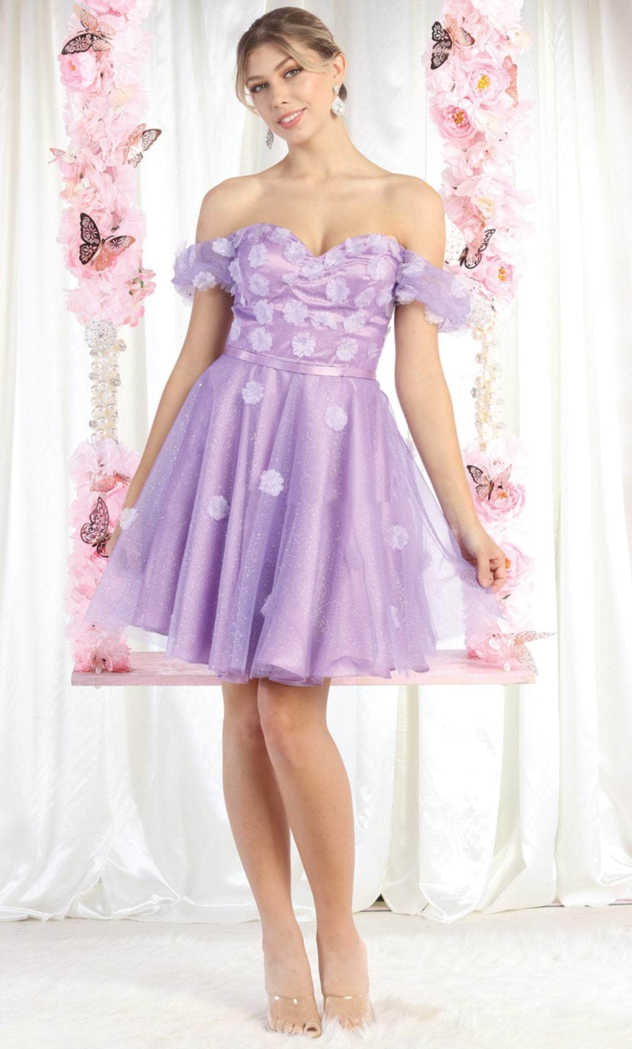 Be mesmerized by the stunning spectacle made by this May Queen MQ1934 creation. Flatteringly sculpted with tailoring lines and sheathed in a glitter tulle fabric, this dress features an off shoulder neckline with a sweetheart notch. Designed with floral appliques and designed with sheer off shoulder puff sleeves, this ensemble is designed with a midriff back and a satin waistband. The skirt flares beautifully into an A-line silhouette with a mini hemline. Be the center of attention on your next formal occasion in this May Queen masterpiece. Model is wearing the Lilac color.