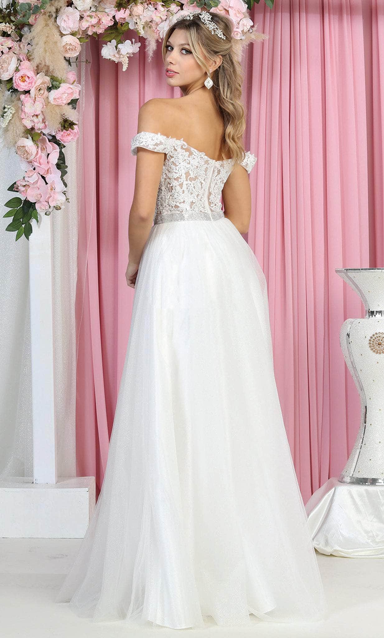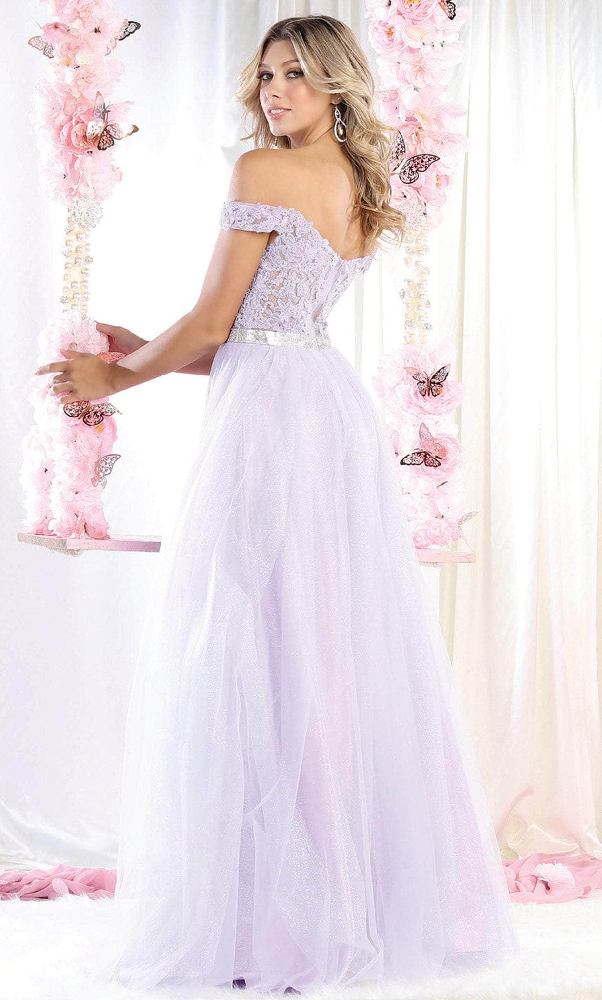 Dare to show off your stellar style on the red carpet in this May Queen MQ1935 creation. Sprinkled with glinting rhinestone details on an embroidered mesh bodice, this piece boasts of an off shoulder neckline with a sweetheart notch. The sheer midrise back is embellished with a zipper closure. Nipped with a metallic waistband, the frothy skirt lavishly cascades into a sweeping denouement. Don't be afraid to flaunt your impeccable sense of style in this May Queen masterpiece. Models are wearing the Baby Blue, Black, Ivory and Lilac colors.