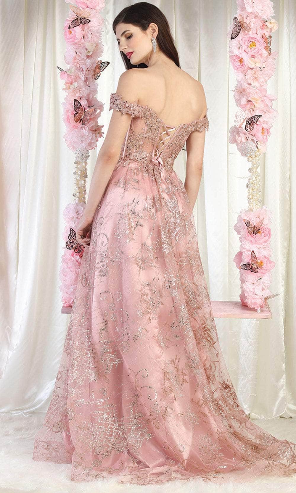 Capture that striking presence and get everyones attention in yhis May Queen MQ1975 gown! Your grand entrance cannot be missed with a dramatic flourish of this dazzling A-line gown. It opens with off shoulder sleeves and a plunging neckline, while the bodice appears like crystals glued to skin in a breathtaking masterpiece of beadwork and rhinestones The lush skirt features satin and a sheer glittering overlay plus a high front sit. A sure winner from May Queen MQ1975 ! Model is wearing Rosegold color.