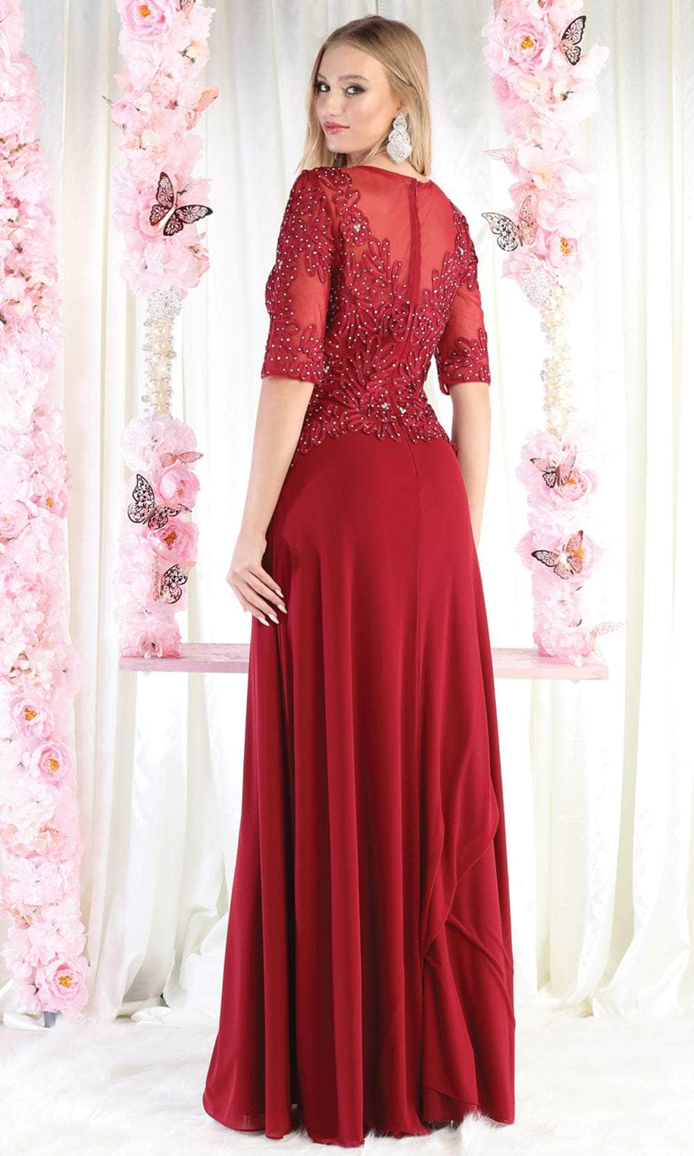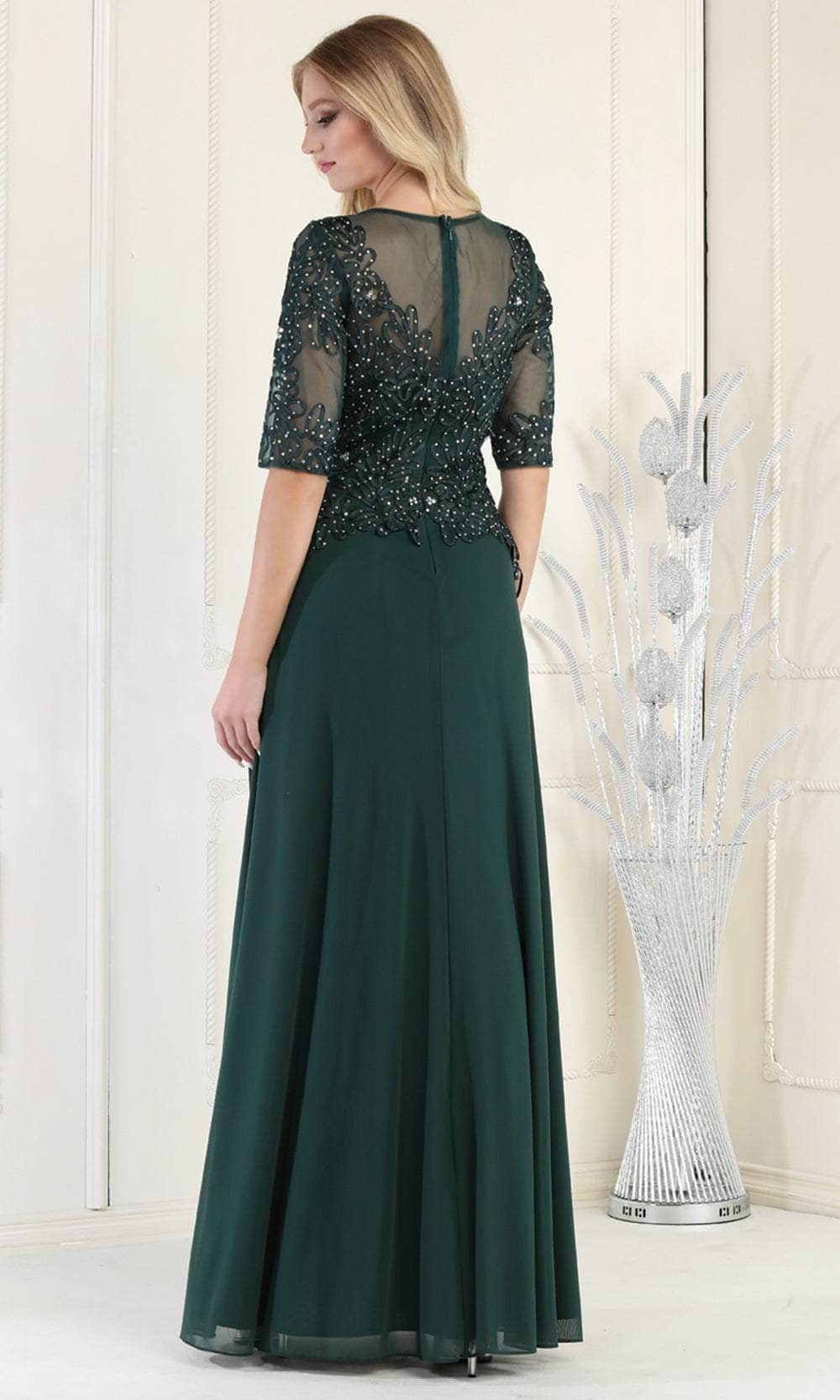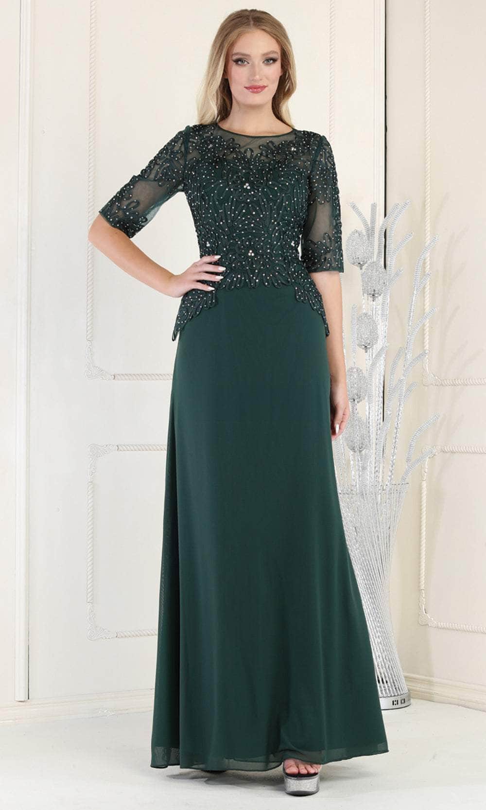Illuminate the fashionable assembly as a dazzling beacon of style by wearing the May Queen MQ1979 creation. Embellished with intricate soutache details and a constellation of rhinestones adorning the bodice, this stunning piece features an illusion jewel neckline. Framed by sheer quarter sleeves and enriched with a peplum detail, the illusion full back discreetly conceals a zipper closure. Meticulously crafted, the skirt descends gracefully into an A-line design, culminating in a floor-length hemline. Embrace an entirely feminine style as you assert your presence with grace in the May Queen MQ1979 masterpiece. Models are wearing the Burgundy, Dusty Blue, Dusty Rose, and Hunter Green colors.