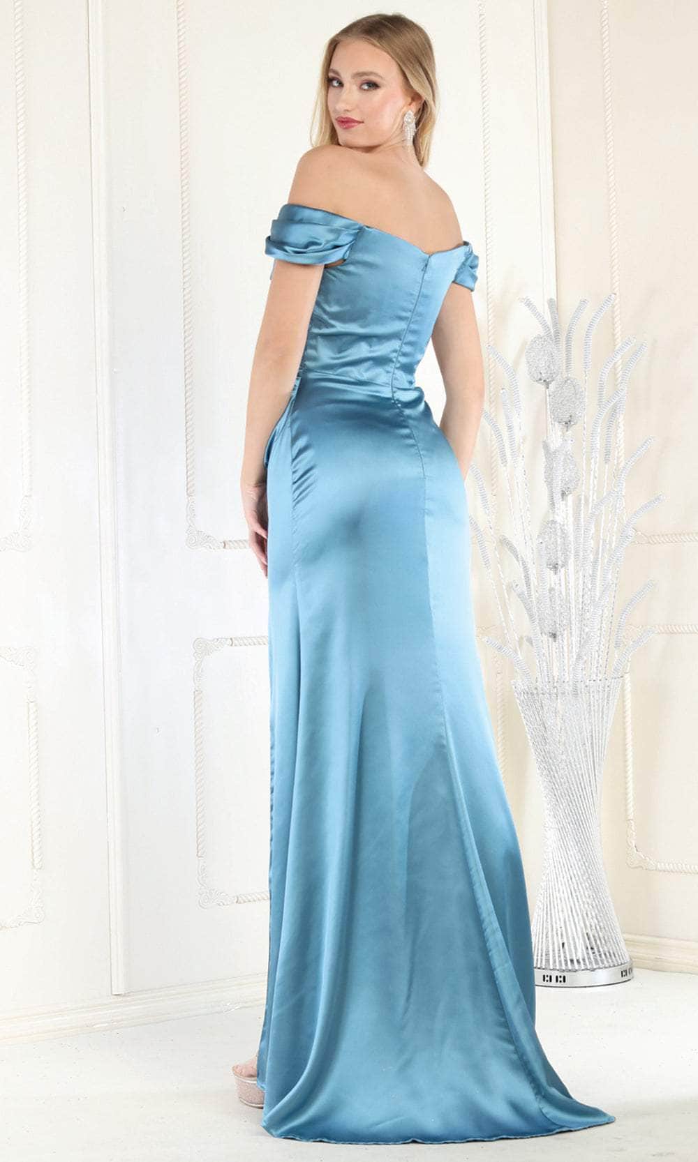 Exude an air of elegance and sophistication in this May Queen MQ1997 masterpiece. With off-shoulder sleeves and a flattering V-neckline, this dress accentuates your collarbones and frames your face beautifully. The sheath silhouette is enhanced with ruched details that create a figure-hugging effect, while the full-length skirt flows effortlessly, ending in a daring slit that reveals just the right amount of leg. The dress is finished with a train that adds a touch of glamour and a center zipper closure at the back that ensures a perfect fit. Feel like a real queen in this fabulous May Queen MQ1997. Models are wearing Dusty Blue, Fuchsia, Lilac, Mauve and Sage colors.