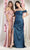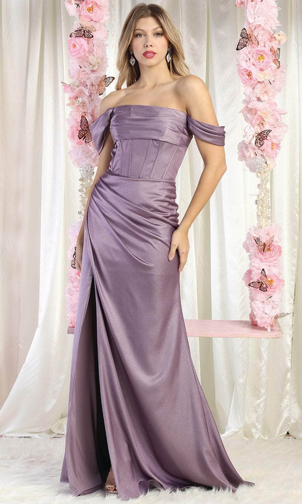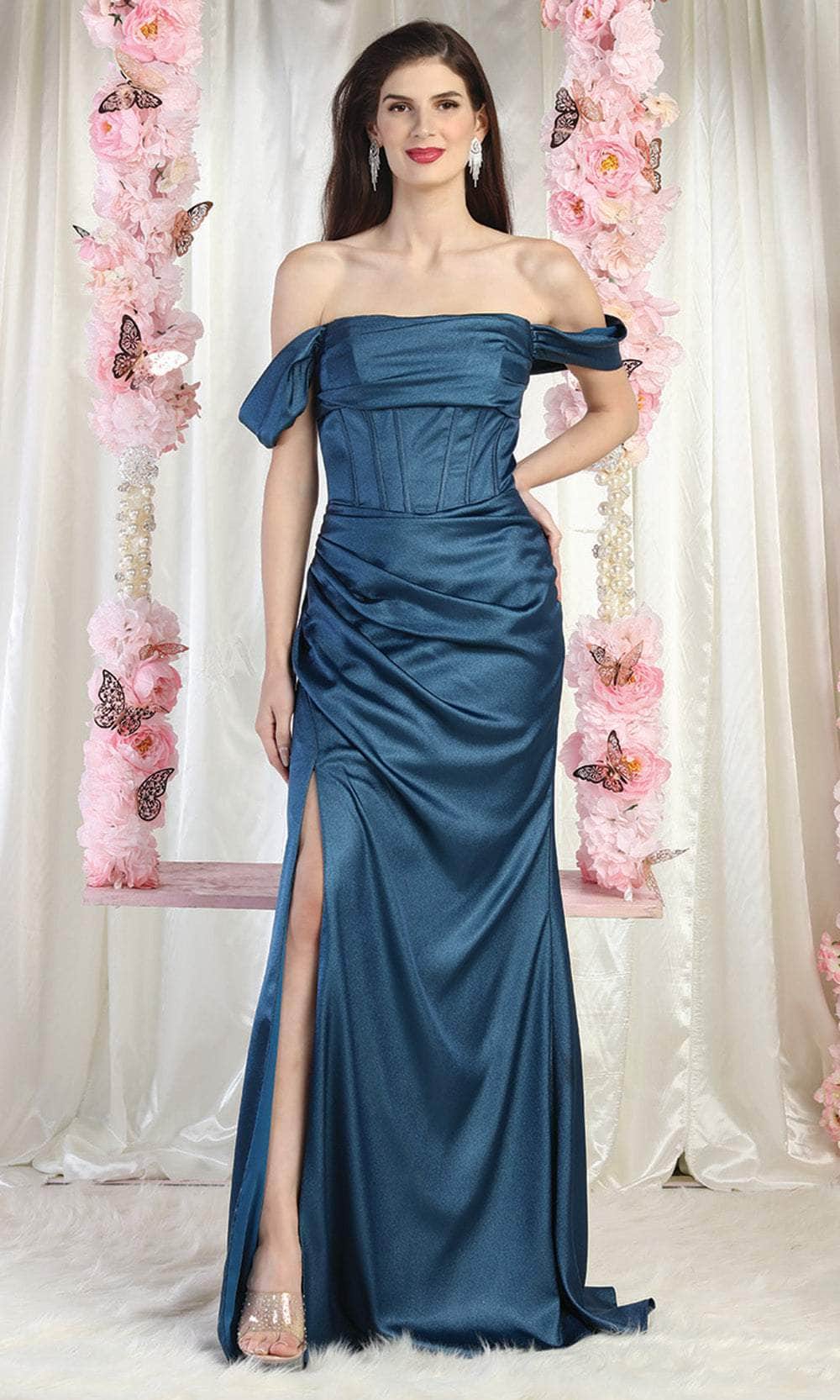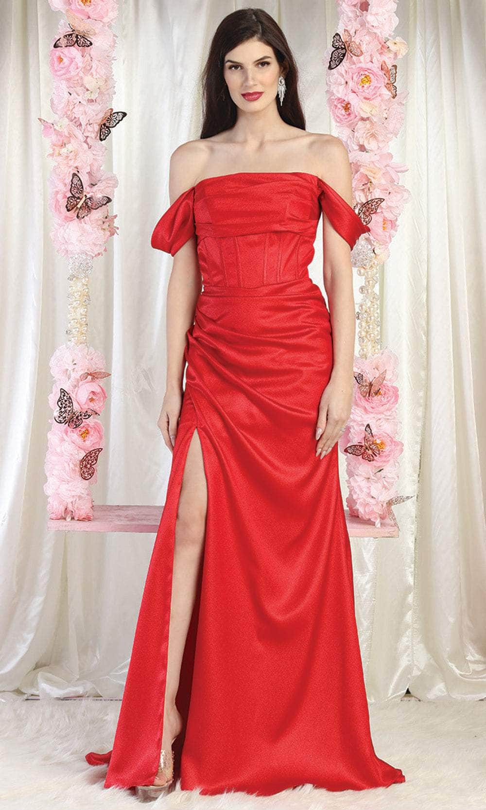 Embrace your regal presence in the May Queen MQ1998 creation, exuding an air of confidence. Draped luxuriously in a smooth satin silhouette, this elegant piece unveils an off-shoulder neckline with draping arm straps adorning a corset-style bodice. The midrise back, discretely secured by a concealed zipper, features gentle cascading drapes that gracefully highlight the top of the skirt's provocative slit. The trumpet shaped skirt leading the eye to its sweeping floor-length denouement. Revel in the glamour and exquisite tailoring of the May Queen MQ1998 masterpiece. Models are wearing the Champagne, Dusty Rose, Red, Teal Blue, and Victorian Lilac colors.