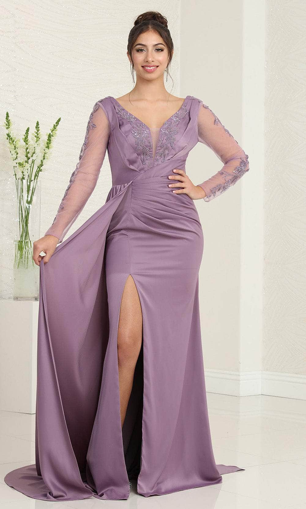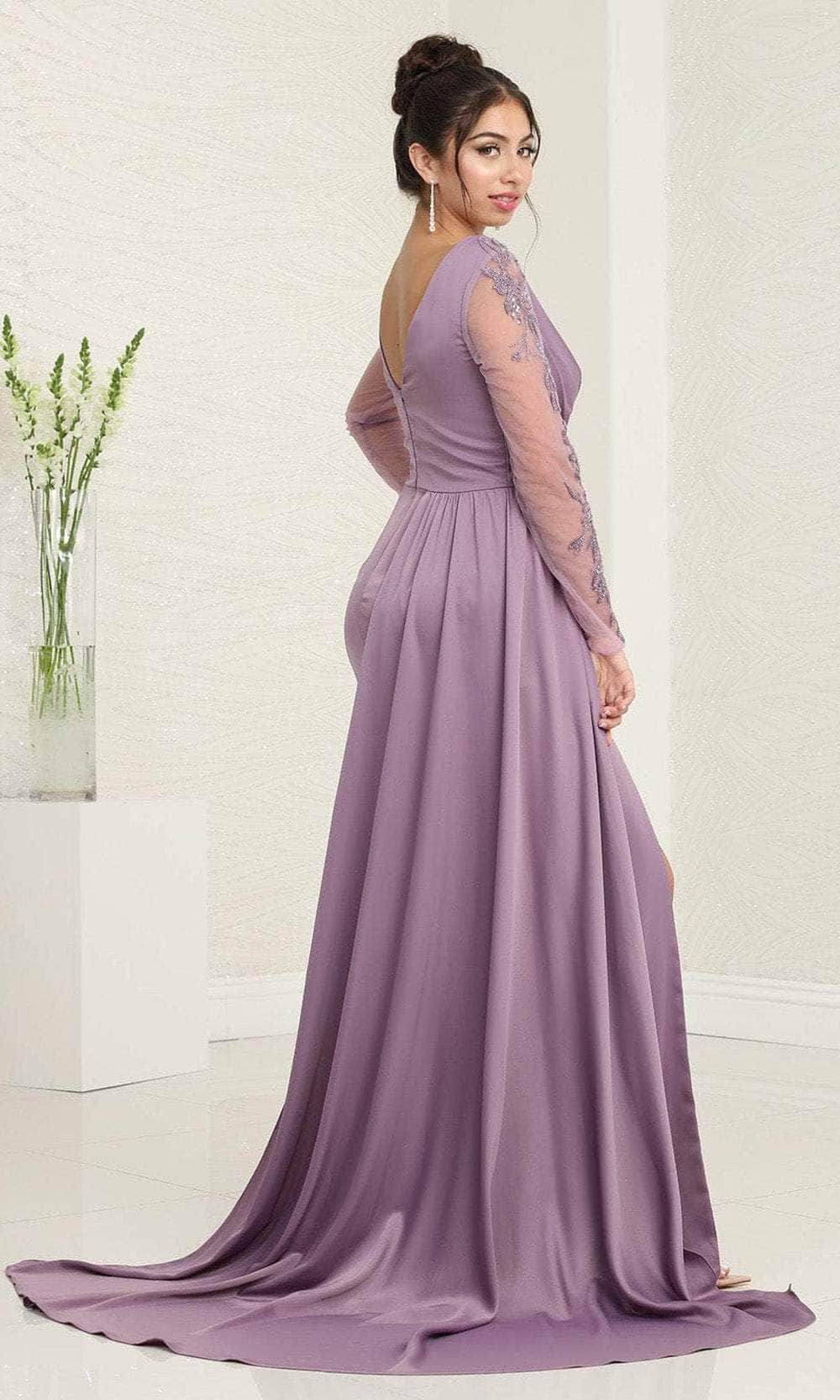 Glow with the elegance of a goddess with the May Queen MQ2008 creation. Gracefully adorned with sheer long sleeves embellished with lace details, this gown parades a plunging v-neckline with an illusion inset. Crafted with an asymmetrical empire waist, this gown showcases pleats and is embellished with beaded embroidery. The back is accentuated by a v-open design with a concealed zipper closure. With meticulous craftsmanship, this ensemble unveils a high slit and a side sash as the trumpet skirt flows into a sweeping train. Immerse yourself in the flawless elegance and perfect union of style and comfort offered by the May Queen MQ2008 masterpiece. Models are wearing the Brick, Burgundy, and Victorian Lilac colors.