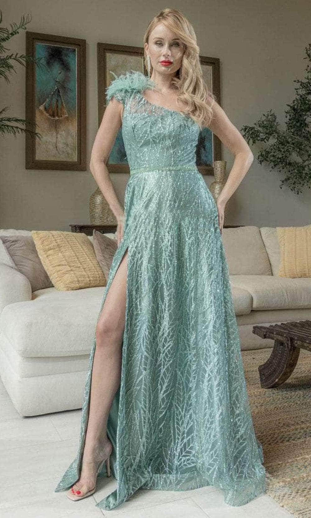Command the room with your luminous presence in the May Queen MQ2024 creation. This elegant piece is artfully designed with a foliage motif adorned in glistening glitter print, revealing a sleeveless bodice and an asymmetrical neckline graced by a feather accent on one shoulder. The dress features a partially open back, discreetly fastened with a concealed zipper, while the waist is elegantly crowned with an embellished band. The skirt opens provocatively with a slit, forming an A-line silhouette that culminates in a sweeping denouement. Embrace and showcase your beauty with timeless sophistication in the May Queen MQ2024 masterpiece. Models are wearing the Fuchsia, and Sage colors.
