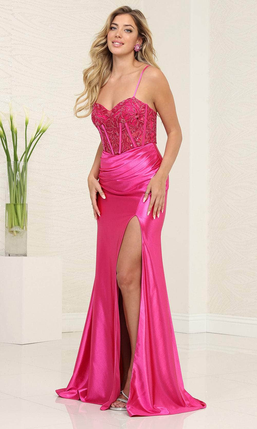 Get ready to leave a lasting impression in this May Queen MQ2046 masterpiece. This delightful sleeveless gown shows a sheer bustier bodice adorned with lace appliques and gleaming beads. It has spaghetti straps and a sweetheart neckline that draws attention to your shoulders and collarbone. The seductive low open back and thigh-high leg slit unveil a hint of your skin. With an elegant sweep train finish, the skirt forms a sheath silhouette with ruched detail to enhance your hourglass curves. This May Queen MQ2046 gown will undeniably make you feel special! Models are wearing Black, and Fuchsia colors.