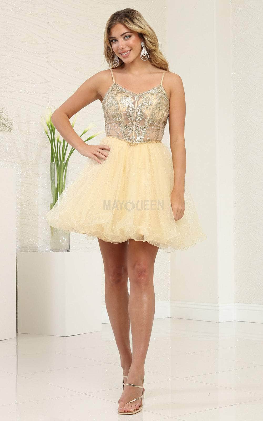 Standout in this May Queen MQ2082 creation that showcases the seamless merging of contemporary style and grace. Trailing with spaghetti straps, this dress features a v-neckline on a corset bodice that offers not just a flattering and well-defined silhouette. Rendered with intricate metallic glitter adornments, the dress elevates a cinched bodice with a lace up detailed back as the ensemble introduces a tulle skirt with a mini hemline that adds to its overall allure. Flaunt your playful and fanciful side in this May Queen MQ2082 masterpiece. Models are wearing the Champagne, Sage, and Silver colors.