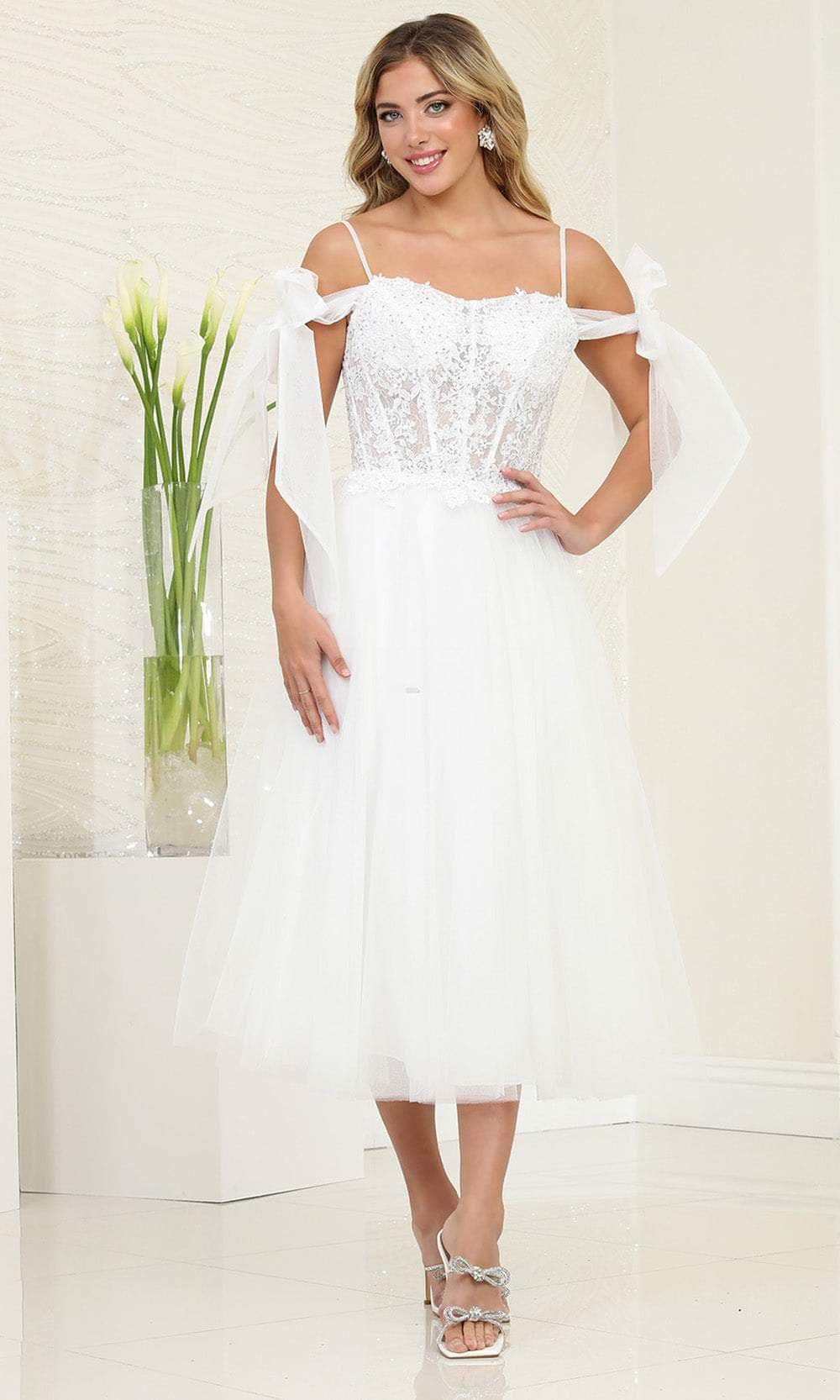 Astound everyone in this beautiful creation from May Queen MQ2089. This ensemble combines modern trends with timeless beauty. It is embellished with floral lace appliques placed on the sheer corset bodice. Features are a semi-sweetheart neckline, spaghetti straps, and a stylish bow tie with off-shoulder sleeves. The mid-open design at the back adds a touch of entice while being secure by a center zipper closure. The skirt flows effortlessly to a tea-length hemline, creating a captivating A-line silhouette. This May Queen MQ2089 dress will let you celebrate that divine feminine beauty! Models are wearing Baby Blue, Lilac, and White colors.
