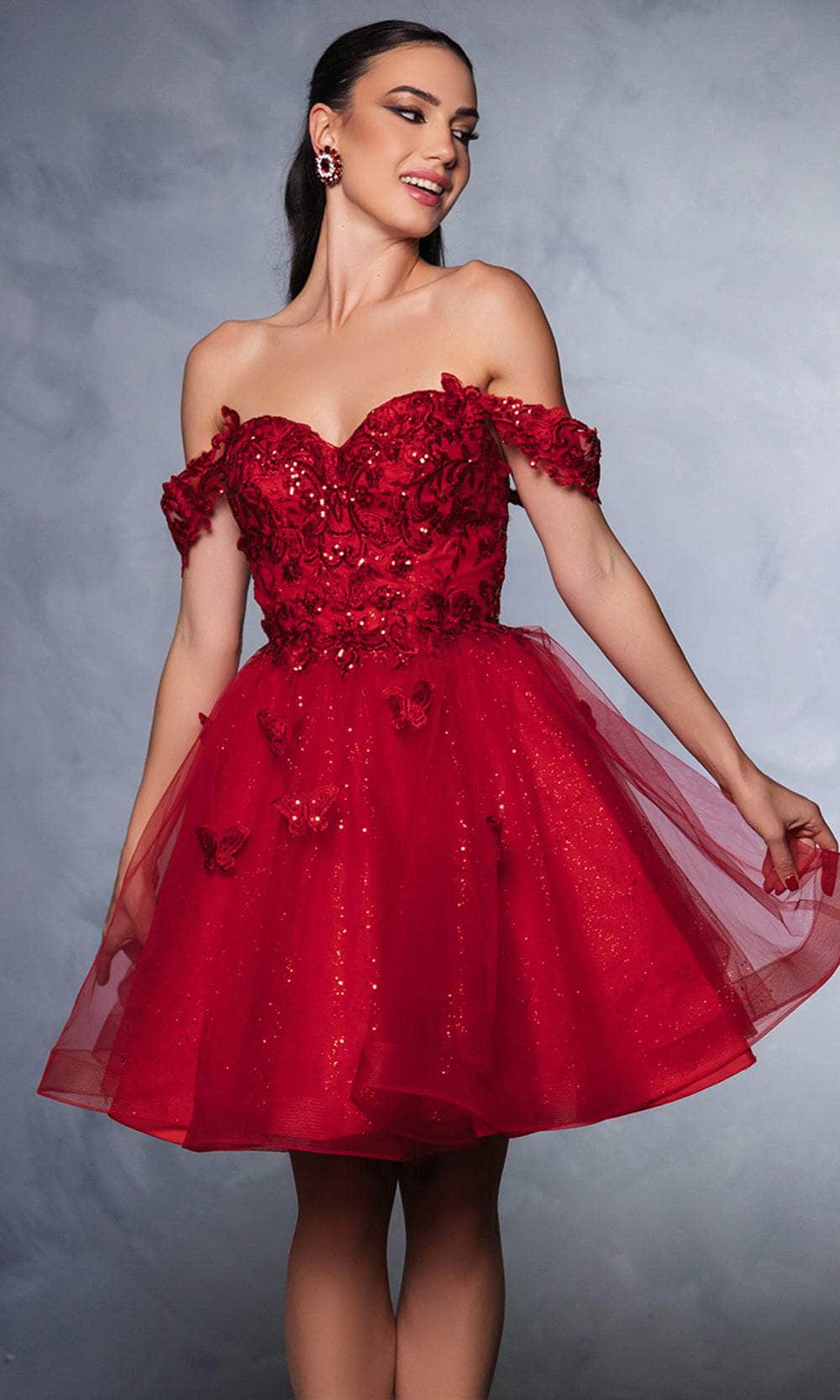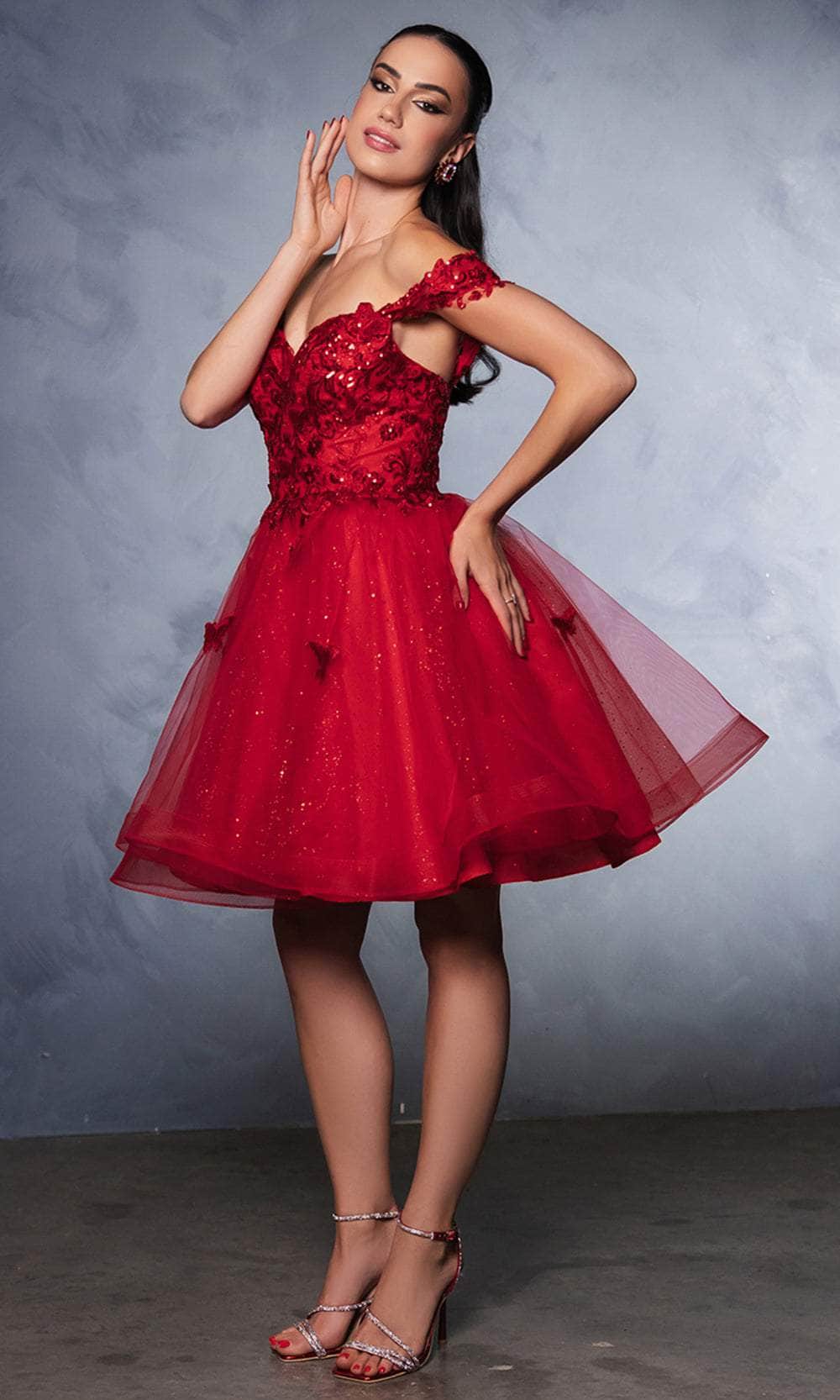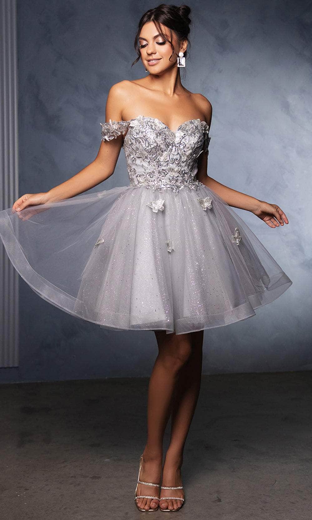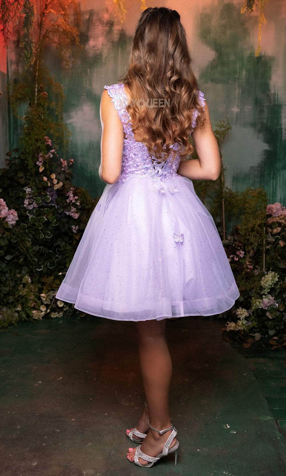 Claim your spot as the darling of the ball with this stunning May Queen MQ2105 cocktail dress. This dress showcases an endearing sweetheart neckline on a fitted and sleeveless bodice, also featuring thick straps for added support. It also reveals a mid-open back that is secured with lace for a sophisticated finish. The top is beautifully adorned with the combination of sequins, floral embroidery, and butterfly appliques, while the mid-thigh A-line skirt shimmers with its glitter designs. Flaunt your figure in this fantastic cocktail May Queen MQ2105 masterpiece. Models are wearing Blush, Champagne, Lilac, Off White, Red, Sage, and Silver colors.