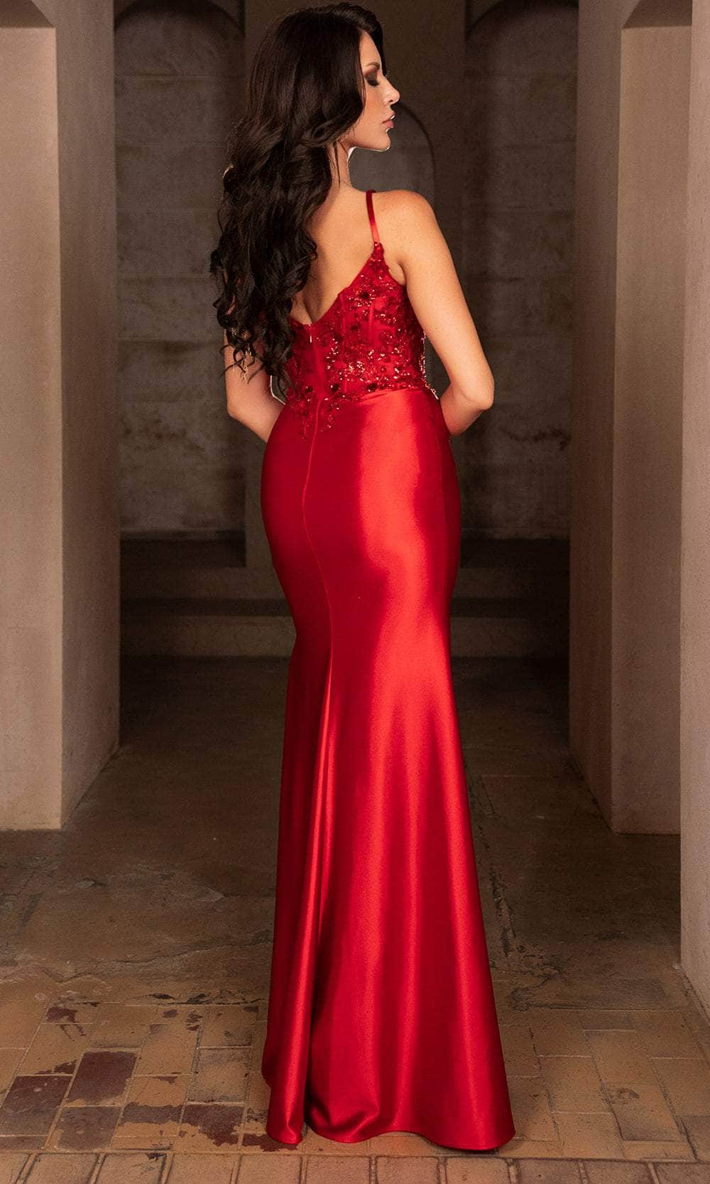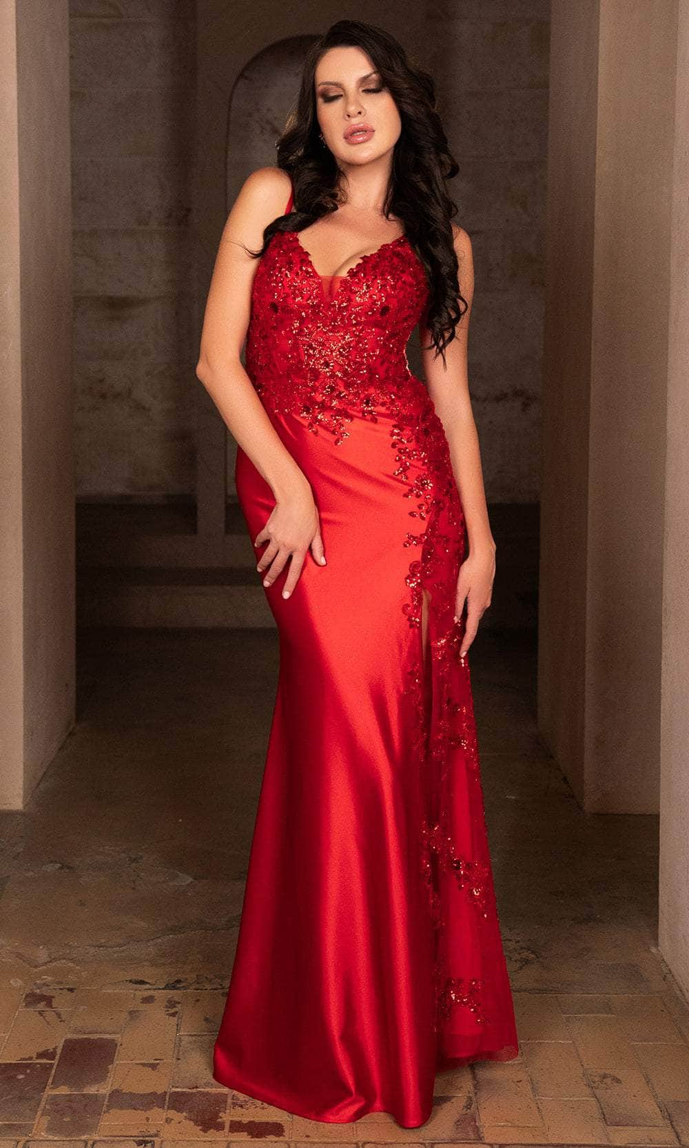 This stunning May Queen MQ2112 evening dress is simply captivating! This attire exhibits an alluring V-neckline on a fitted and sleeveless bodice, also featuring spaghetti straps for added support. It also showcases a scoop back that is secured with zipper for a polished finish. This floor-length sheath dress is adorned with beautiful sequin embellishments, further elevating your overall visual appeal. Experience the outstanding effect in this May Queen MQ2112 masterpiece. Models are wearing Black, Dusty Blue, Eggplant, and Red colors.