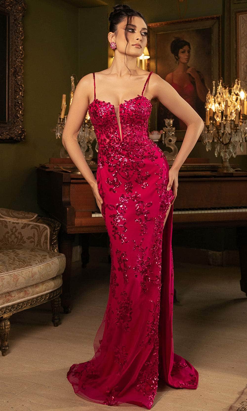 Enter the hall with grace and beauty while wearing this May Queen MQ2118 evening dress. This dress exhibits an endearing plunging sweetheart neckline on a fitted and sleeveless bodice, also featuring a sheer inset as well as spaghetti straps. This attire also reveals an enticing strappy back, while the sheath skirt highlights a seductive high slit. This creation is also entirely designed with sequin embellishments, allowing you to dazzle and shine all night long. Capture that striking presence and get everyones attention in May Queen MQ2118 masterpiece. Models are wearing Fuchsia, Navy, and Red colors.