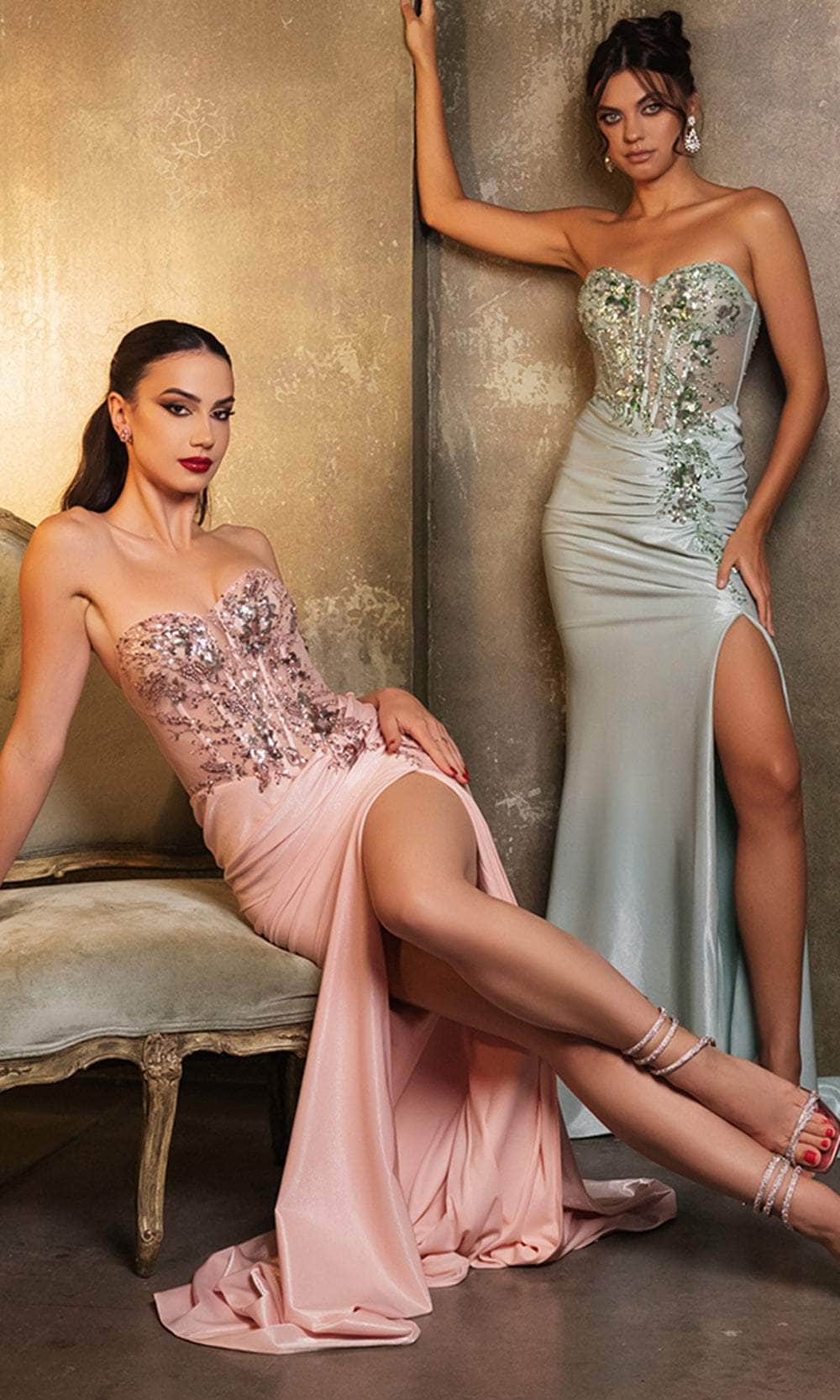 Elevate your style with the May Queen MQ2119 gown, a stunning creation designed to make you the center of attention. This beautiful strapless corset bodice is adorned with intricate beads and sequins, offering a captivating and luxurious look. The lace-up tie and concealed zipper closure at the back provide a perfect fit, ensuring you feel comfortable and confident. The floor-length skirt flows in a sheath silhouette, featuring a daring slit and ending with an elegant train. Perfect for any special occasion, this gown combines timeless elegance with modern sophistication. Embrace the allure of this exquisite May Queen MQ2119 and make a memorable entrance, creating lasting impressions with your graceful presence. Models are wearing Blush, Dusty Blue, Blush, and Sage colors.