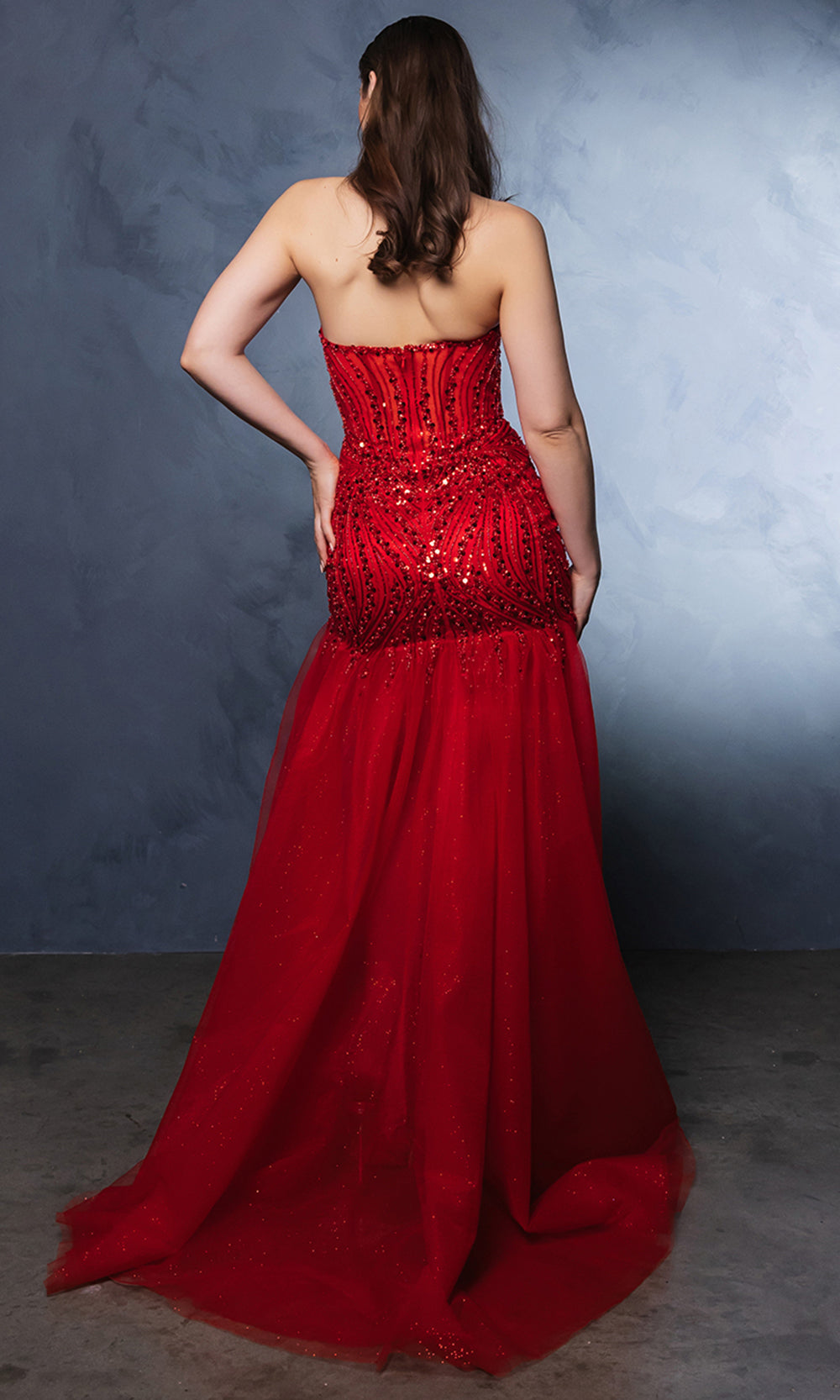 Make a stunning statement in the May Queen MQ2131, a long trumpet dress with modern flair. Glistening sequin and bead embellishments adorn the sheer corset bodice, cascading gracefully into the hips for a striking effect. The sweetheart neckline and strapless design complements the figure, enhancing its glamorous appeal. The May Queen MQ2131 is an ideal option for evening galas, offering a sophisticated blend of shine and structure. Models are wearing Black, Dustyblue, and Red colors.