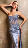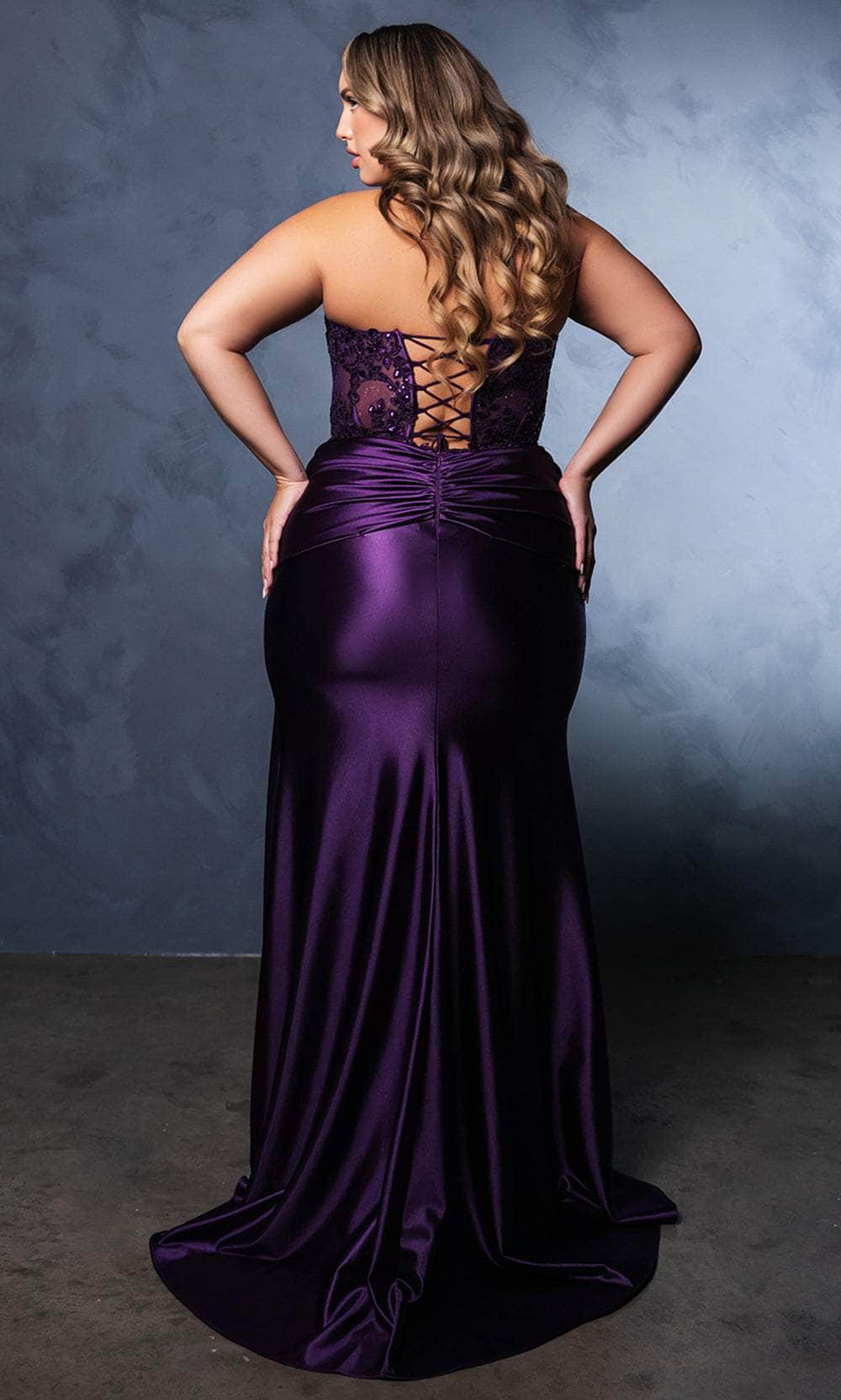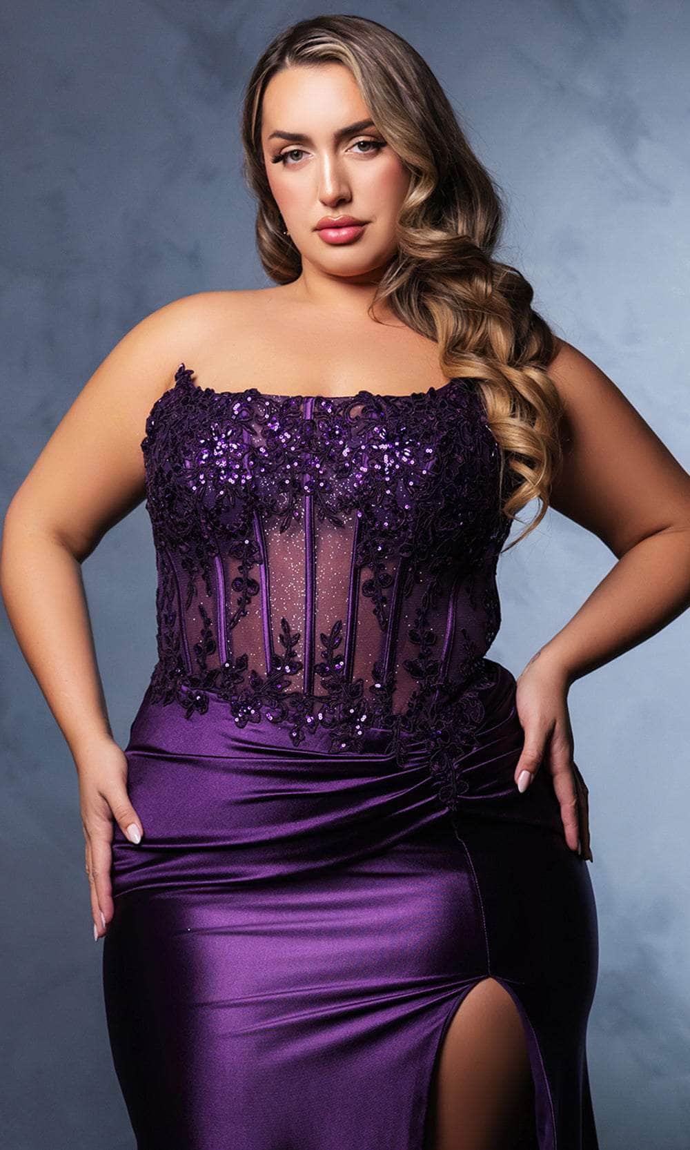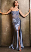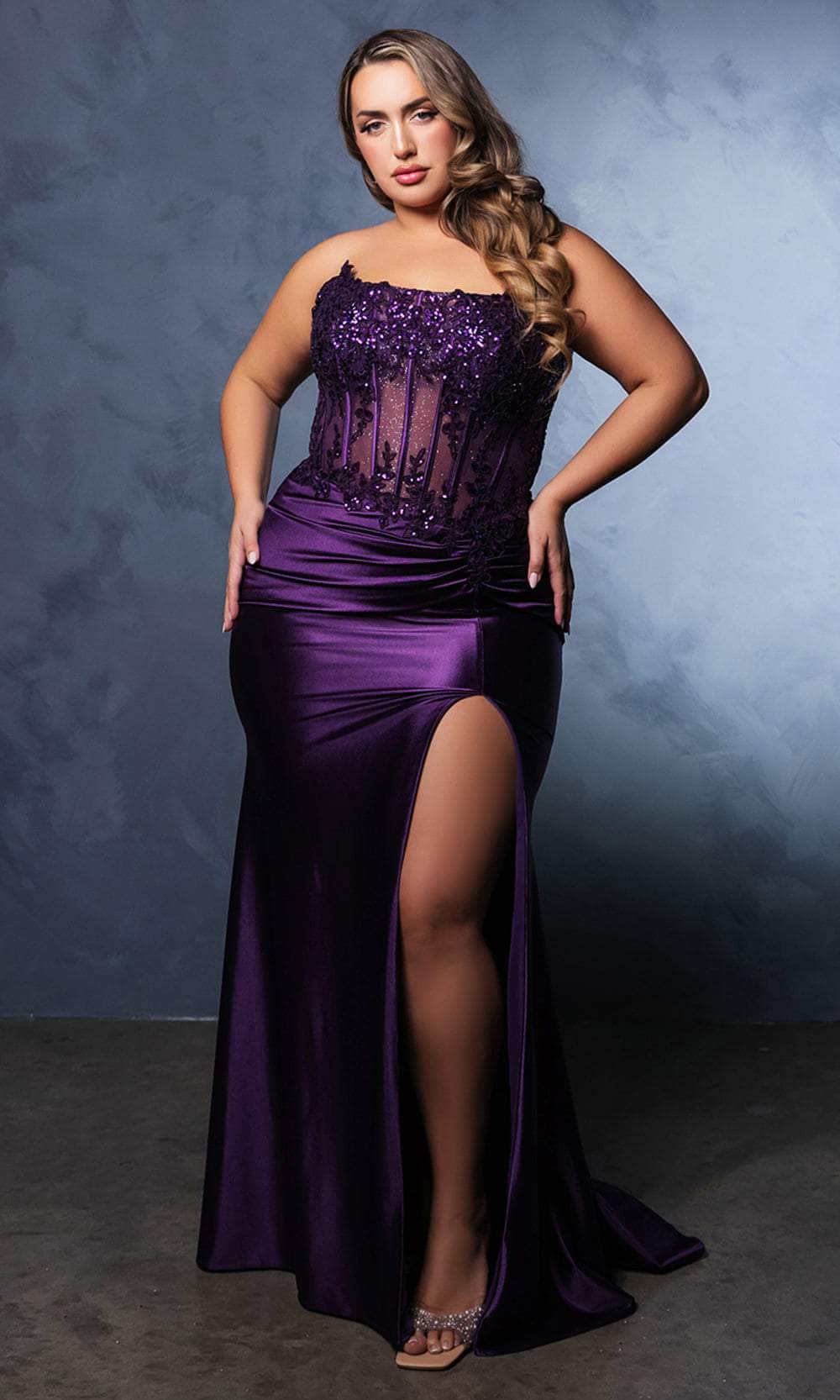 Channel red carpet glamour wearing this May Queen MQ2140 evening dress. This dress exhibits an alluring strapless scoop neckline on a fitted bodice. The illusion top is beautifully designed with floral embroidery, while the floor-length sheath skirt highlights a seductive high slit and ruching effects below the natural waistline. It also reveals a classy mid-open back that is enclosed by a lace for a graceful finish. Be the spotlight wearing this extravagant May Queen MQ2140 masterpiece. Models are wearing Dusty Blue, Eggplant, and Rose Gold colors.