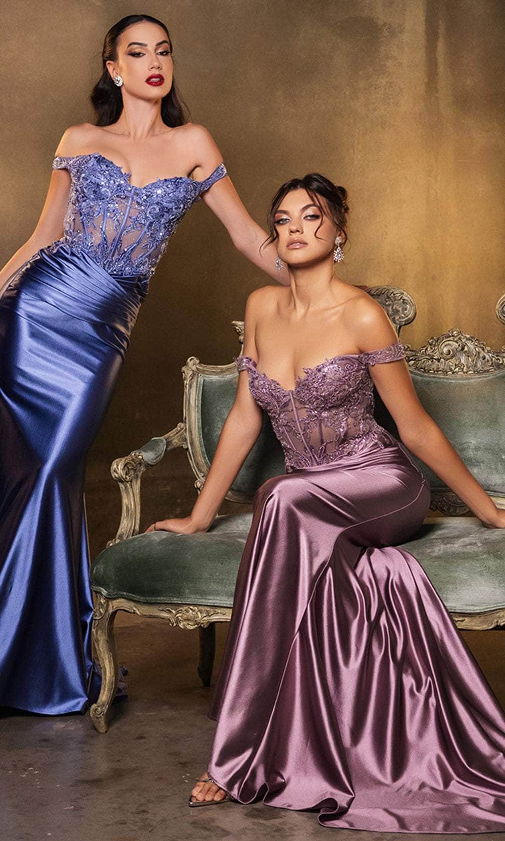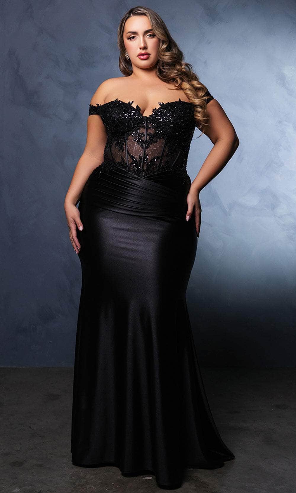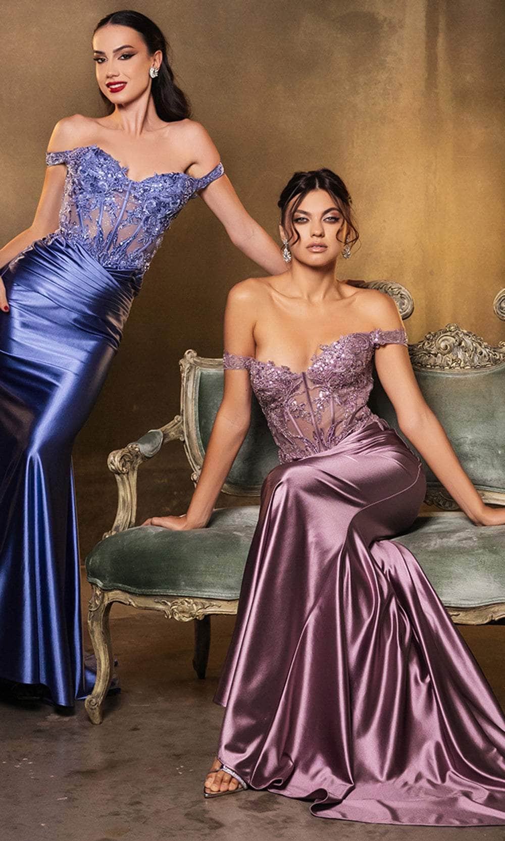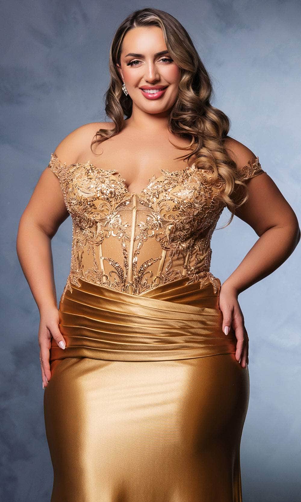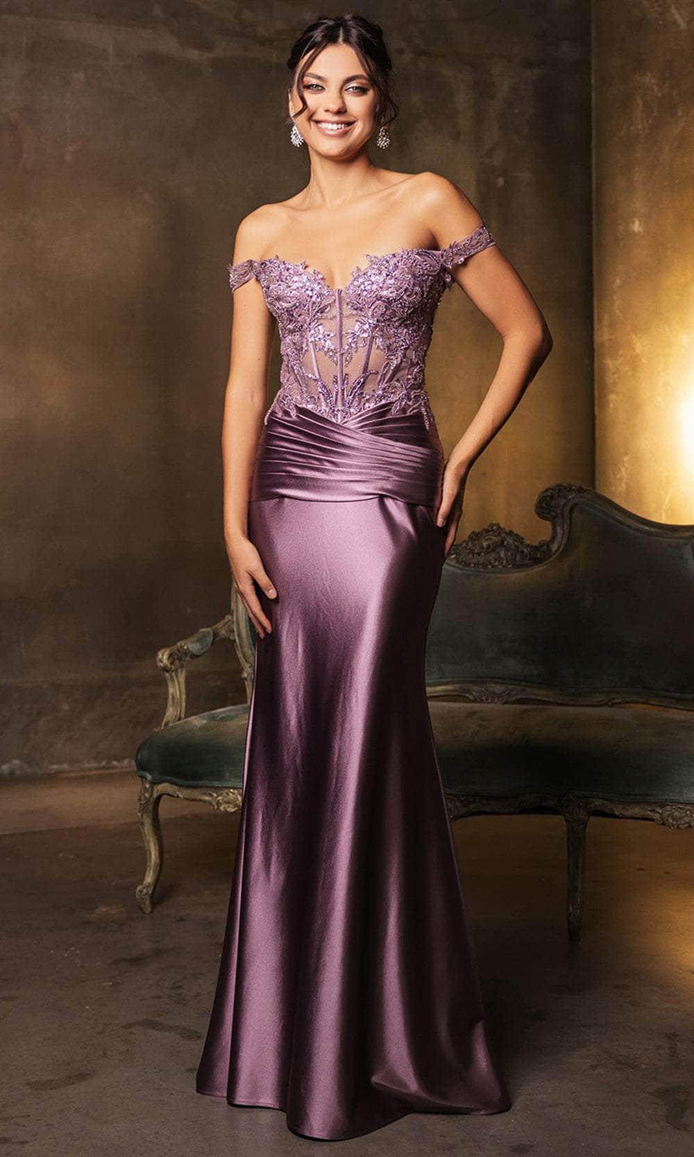 Get ready to show off your glamorous side in this May Queen MQ2141 evening dress. This dress showcases a stunning off-shoulder neckline on a figure-flattering bodice, complemented by a classy mid-open back that is secured with zipper for a polished finish. The top is beautifully adorned with sequin embellishments, allowing you to sparkle all night long, while the floor-length sheath skirt exhibits pleat designs below the Basque waistline. Create a special moment in this May Queen MQ2141 masterpiece. Models are wearing Black, Dusty Blue, Gold, and Victorian colors.