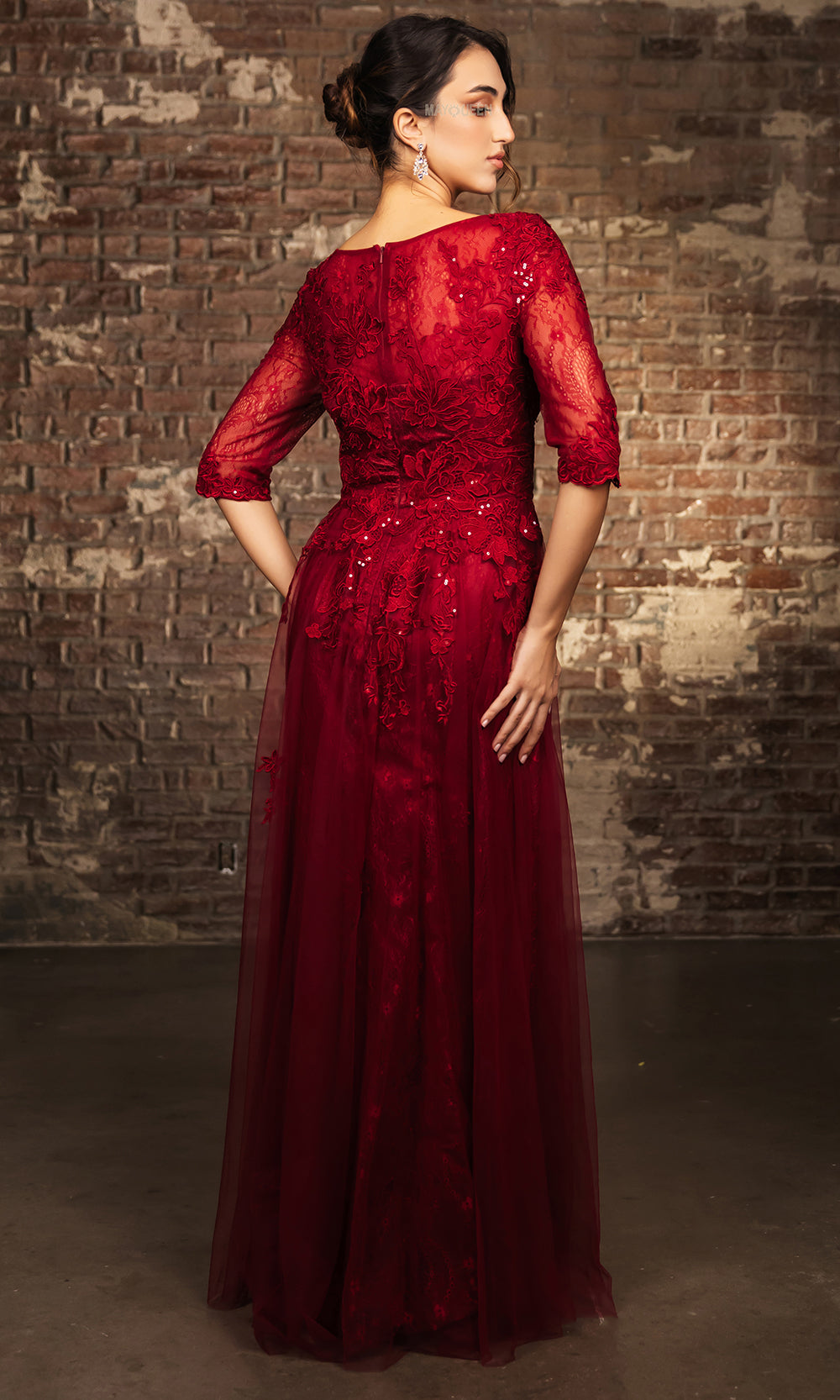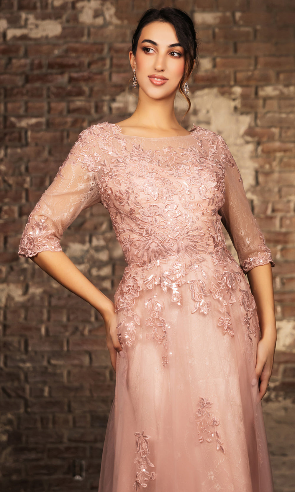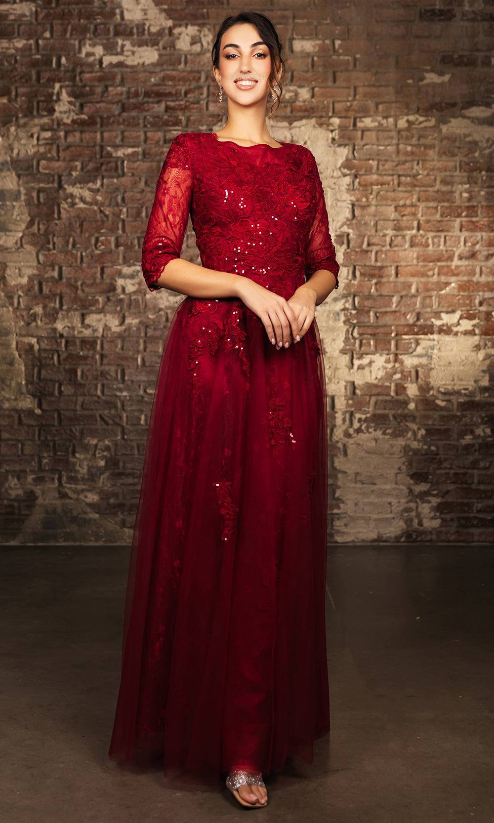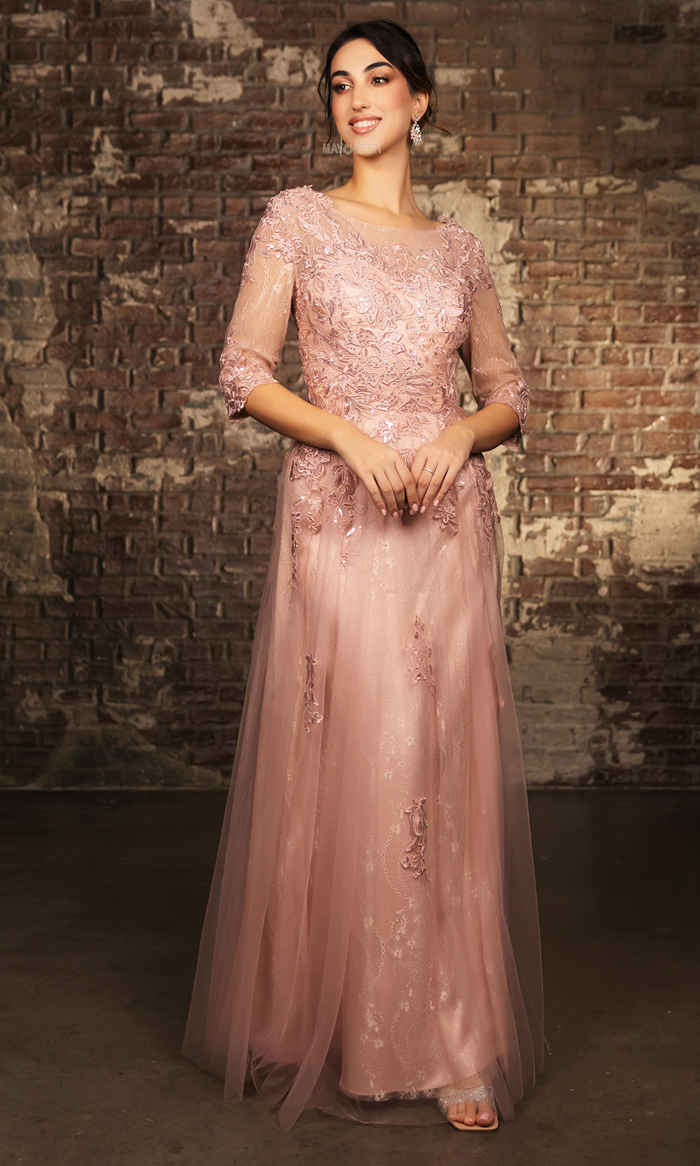 Grace the room in the May Queen MQ2143, a gown designed for elegance and charm. This floor-length design features an illusion bateau neckline and full back design. Exquisite floral appliques and glistening sequins adorn the fitted bodice, cascading beautifully into the soft layers of the A-line skirt. The sheer quarter-length sleeves offer delicate coverage, adding sophistication to the look. With its natural waistline and classic silhouette, the May Queen MQ2143 is ideal for weddings, galas, or black-tie events. Models are wearing Black, Burgundy, Dustyblue, and Dustyrose colors.