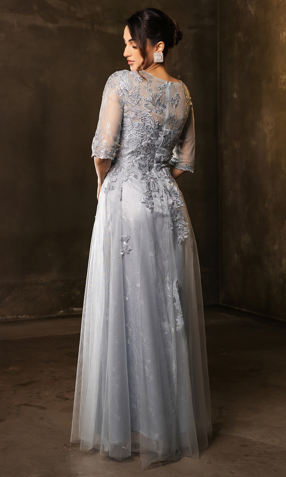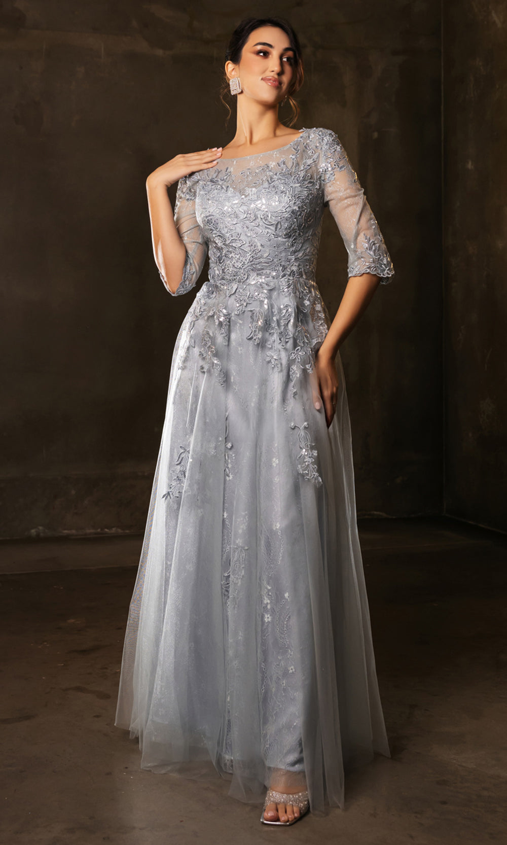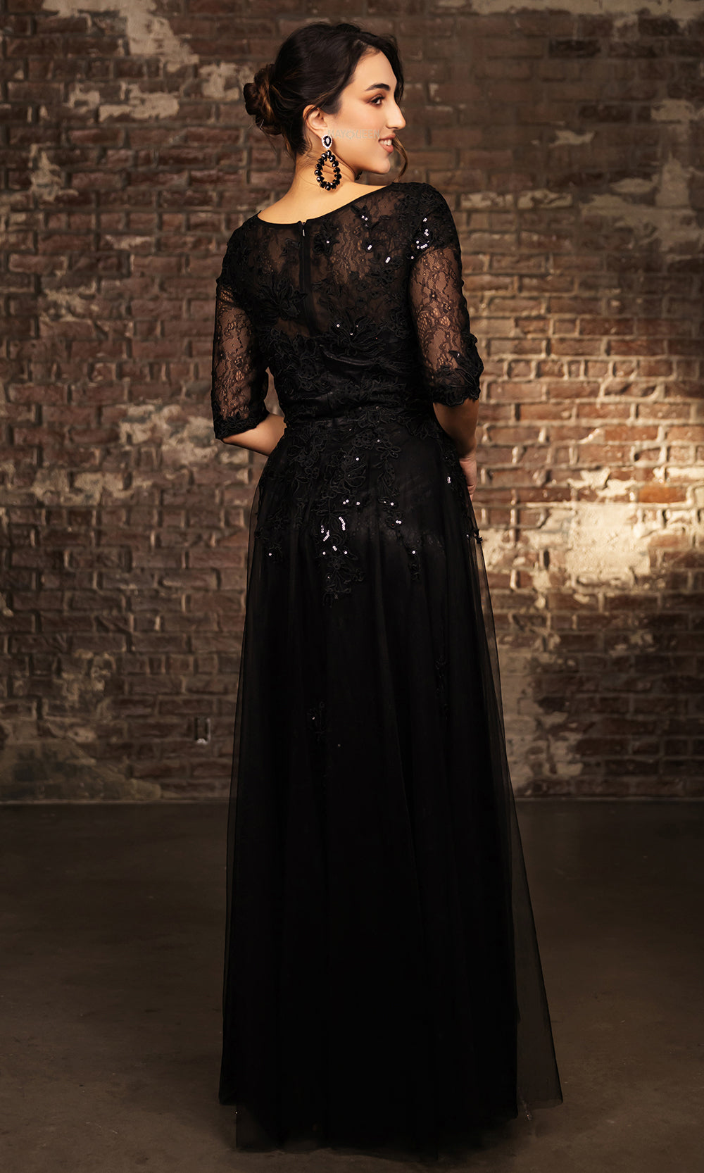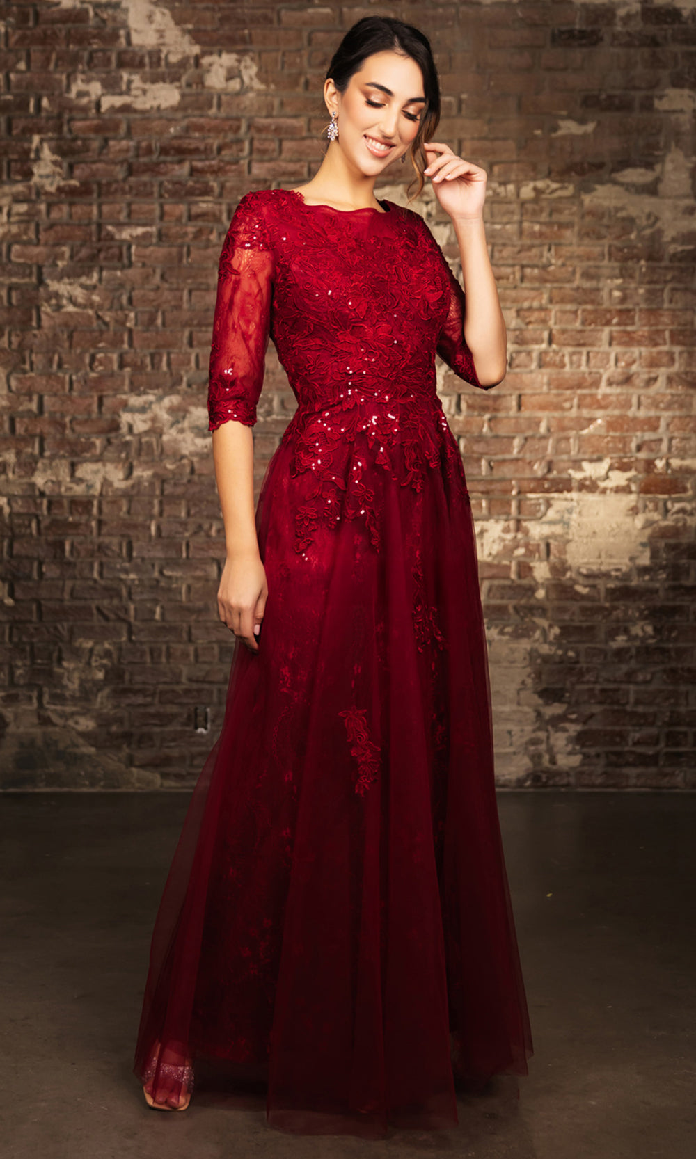 Grace the room in the May Queen MQ2143, a gown designed for elegance and charm. This floor-length design features an illusion bateau neckline and full back design. Exquisite floral appliques and glistening sequins adorn the fitted bodice, cascading beautifully into the soft layers of the A-line skirt. The sheer quarter-length sleeves offer delicate coverage, adding sophistication to the look. With its natural waistline and classic silhouette, the May Queen MQ2143 is ideal for weddings, galas, or black-tie events. Models are wearing Black, Burgundy, Dustyblue, and Dustyrose colors.