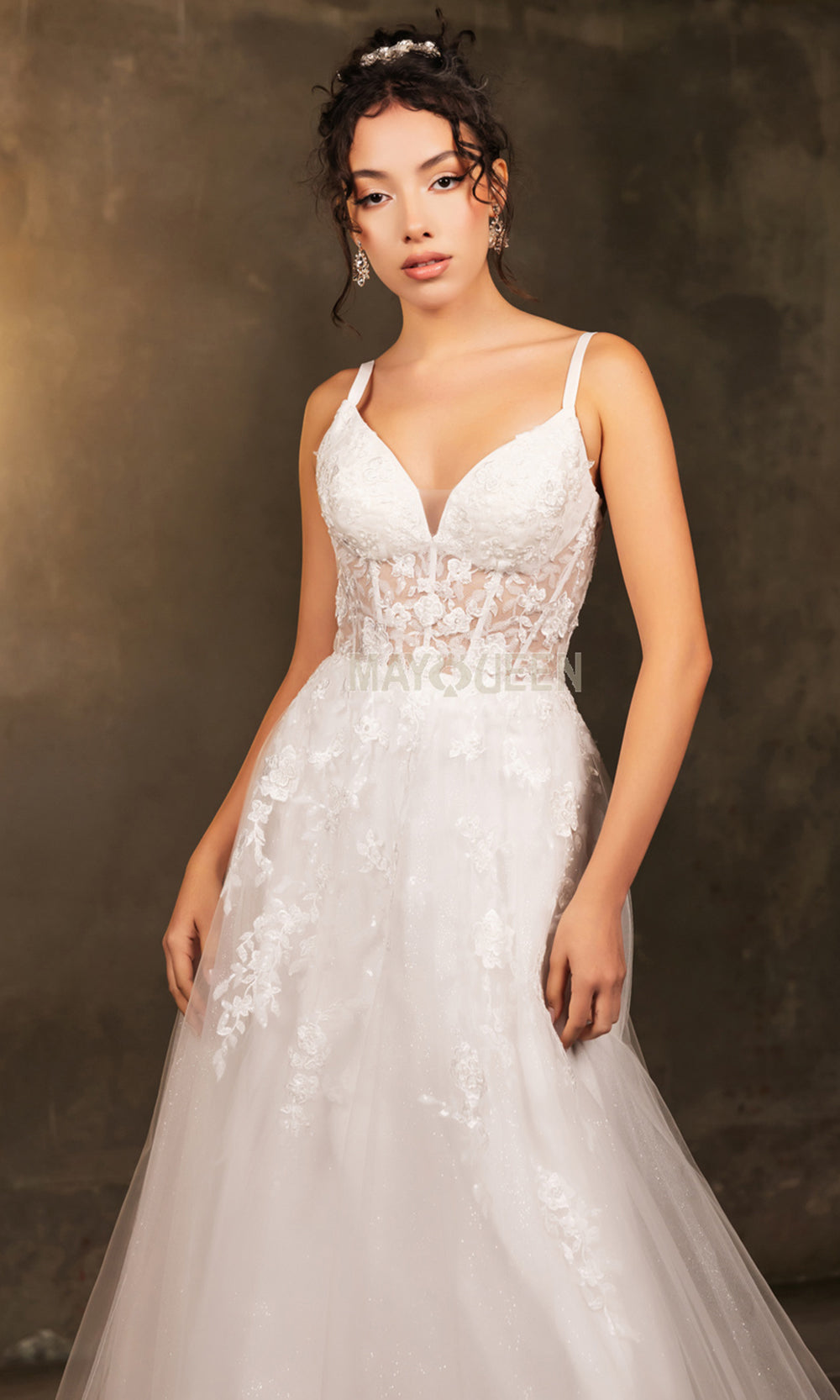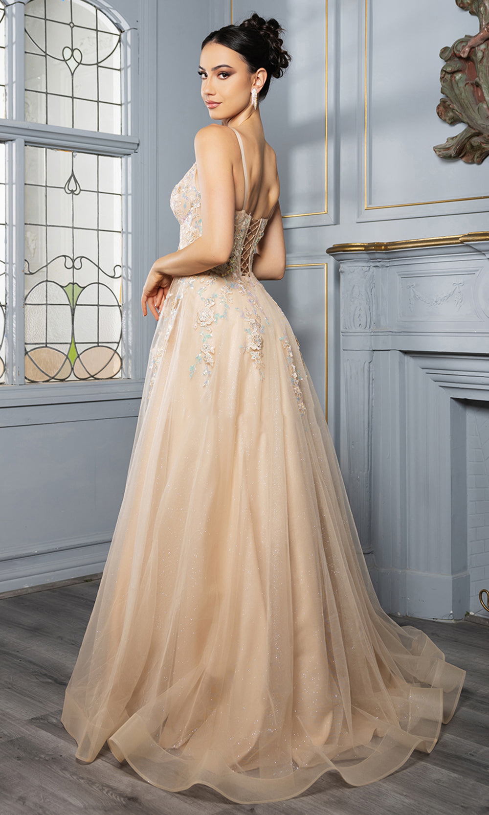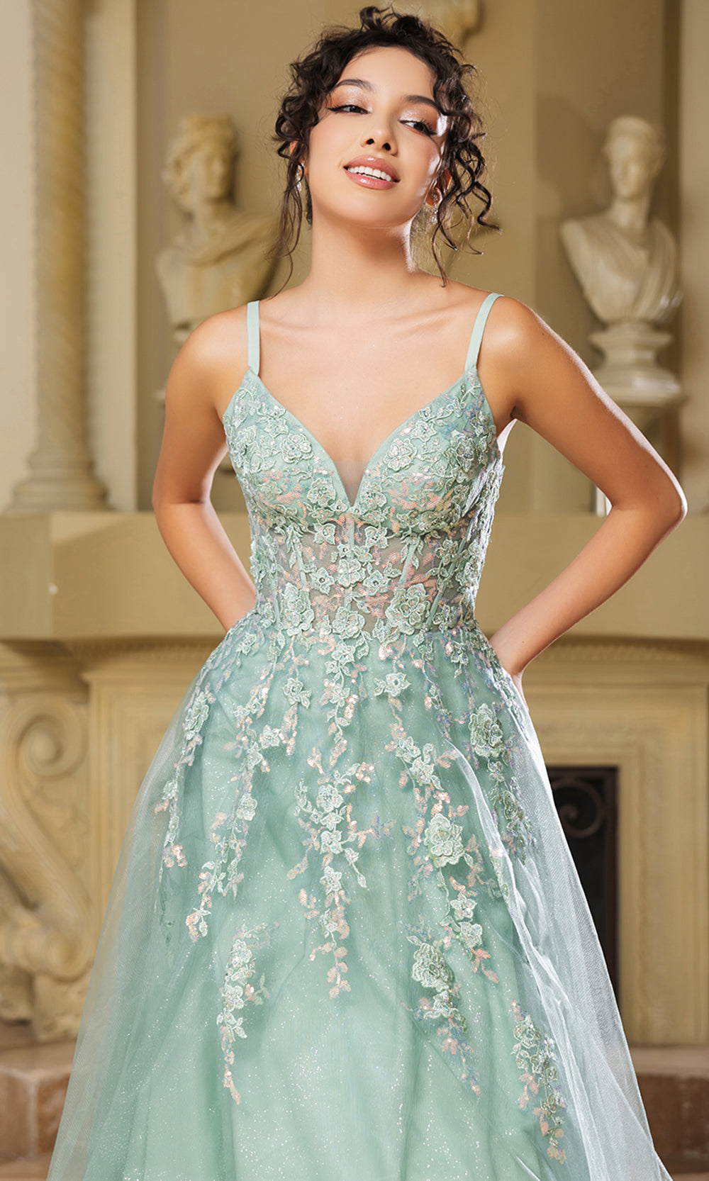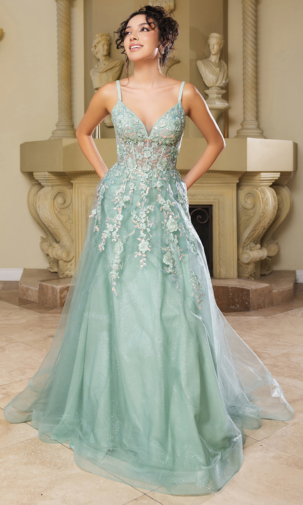 Infuse your evening look with romance and whimsy in this May Queen MQ2165 ethereal design. The sleeveless gown features a sheer lace applique bodice with beaded details, framed by delicate spaghetti straps and a flattering deep V-neckline. The layered tulle skirt flows effortlessly into a soft A-line silhouette, perfect for gliding across the dance floor. Ideal for proms, garden parties, or formal events, the May Queen MQ2165 is sure to capture attention with its fairy-tale charm. Models are wearing Champagne, Ivory, Rosegold, and Sage colors.