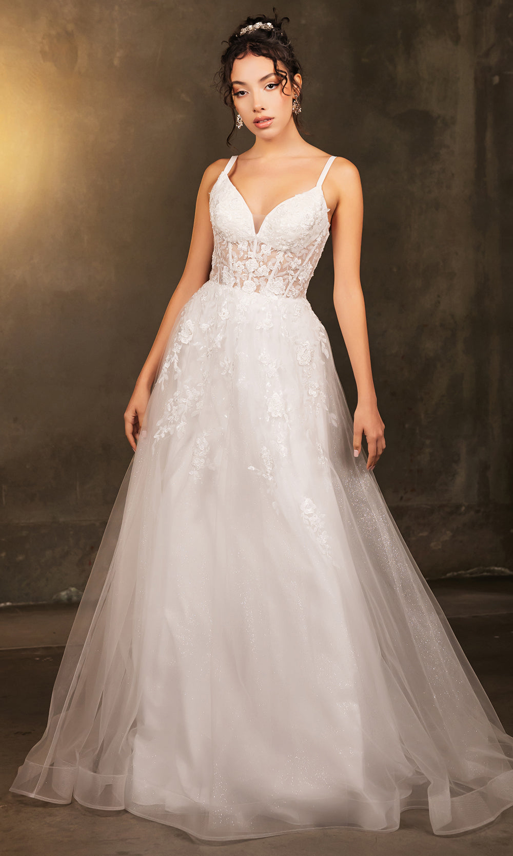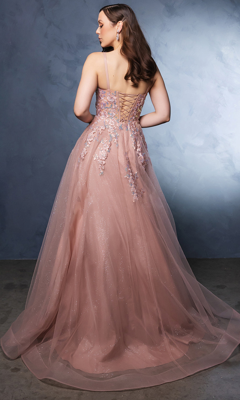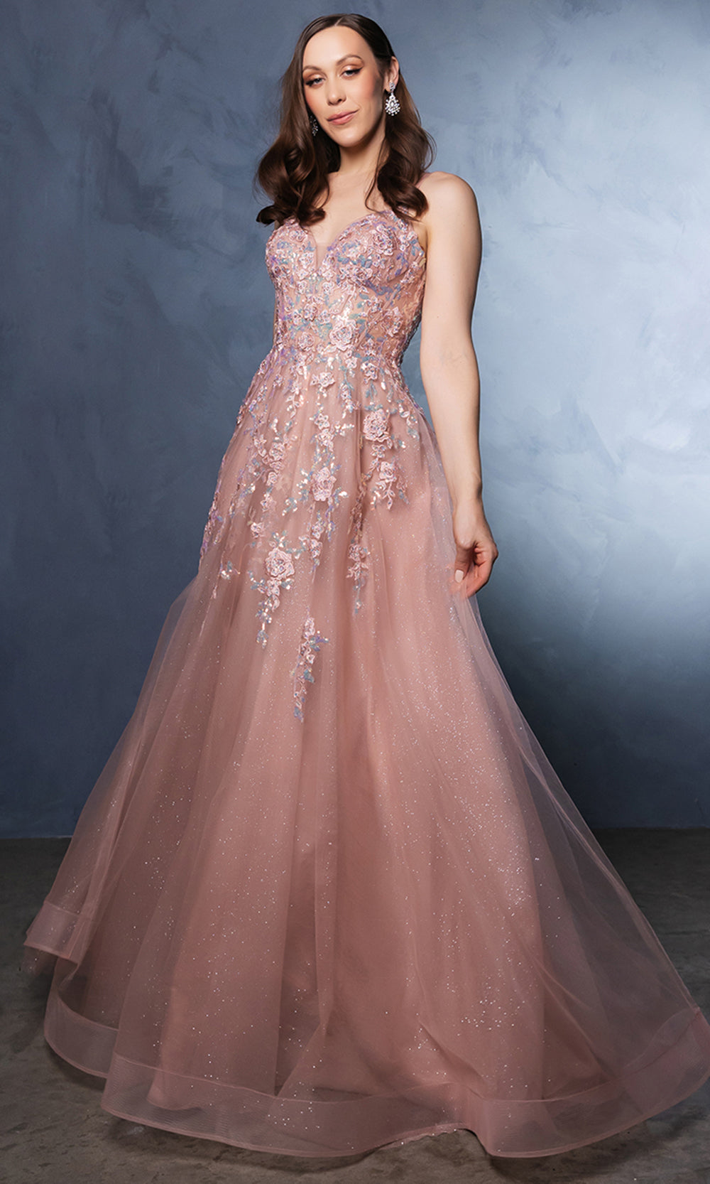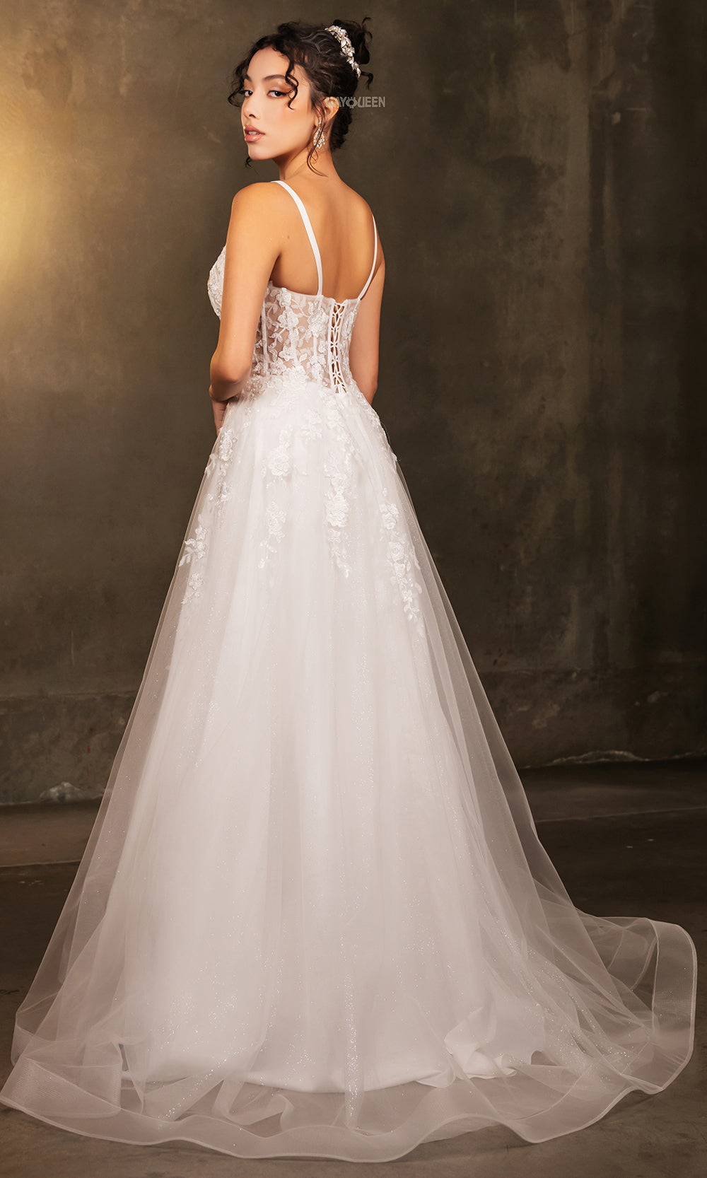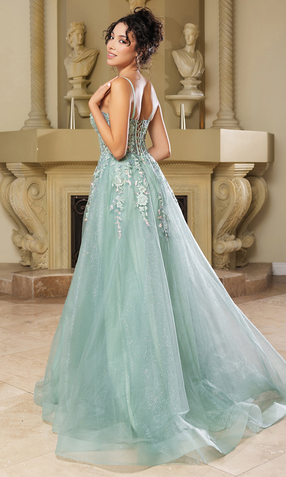 Infuse your evening look with romance and whimsy in this May Queen MQ2165 ethereal design. The sleeveless gown features a sheer lace applique bodice with beaded details, framed by delicate spaghetti straps and a flattering deep V-neckline. The layered tulle skirt flows effortlessly into a soft A-line silhouette, perfect for gliding across the dance floor. Ideal for proms, garden parties, or formal events, the May Queen MQ2165 is sure to capture attention with its fairy-tale charm. Models are wearing Champagne, Ivory, Rosegold, and Sage colors.