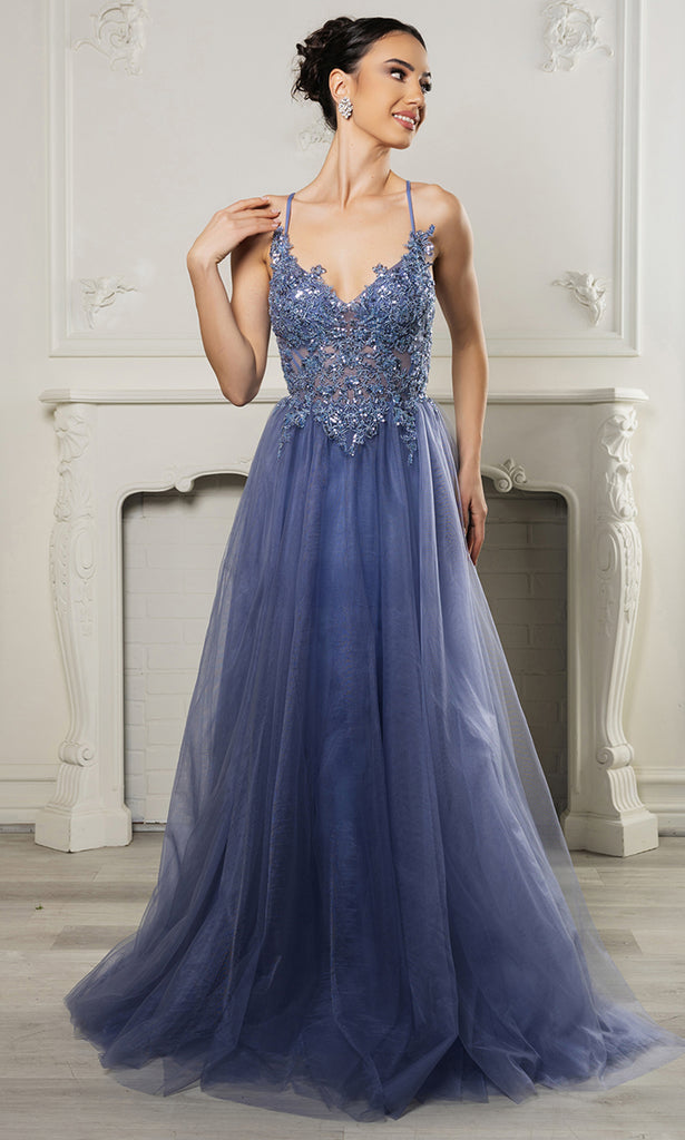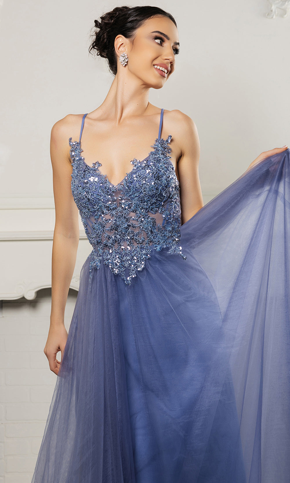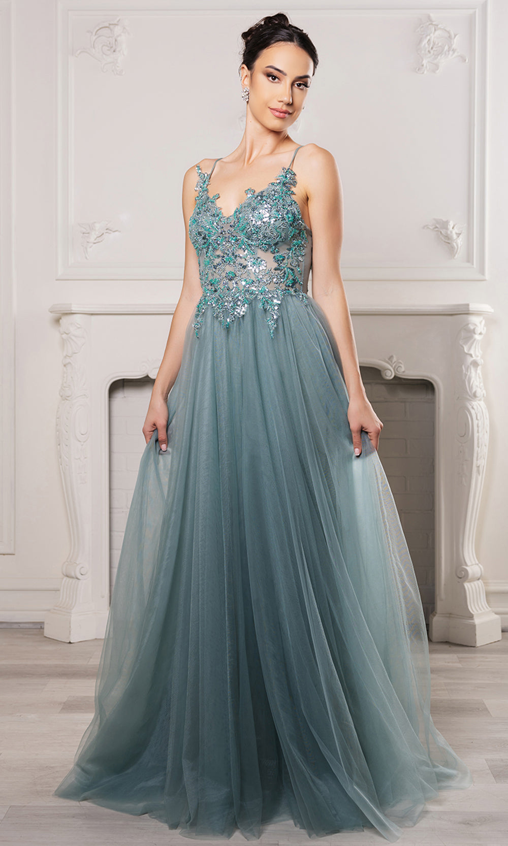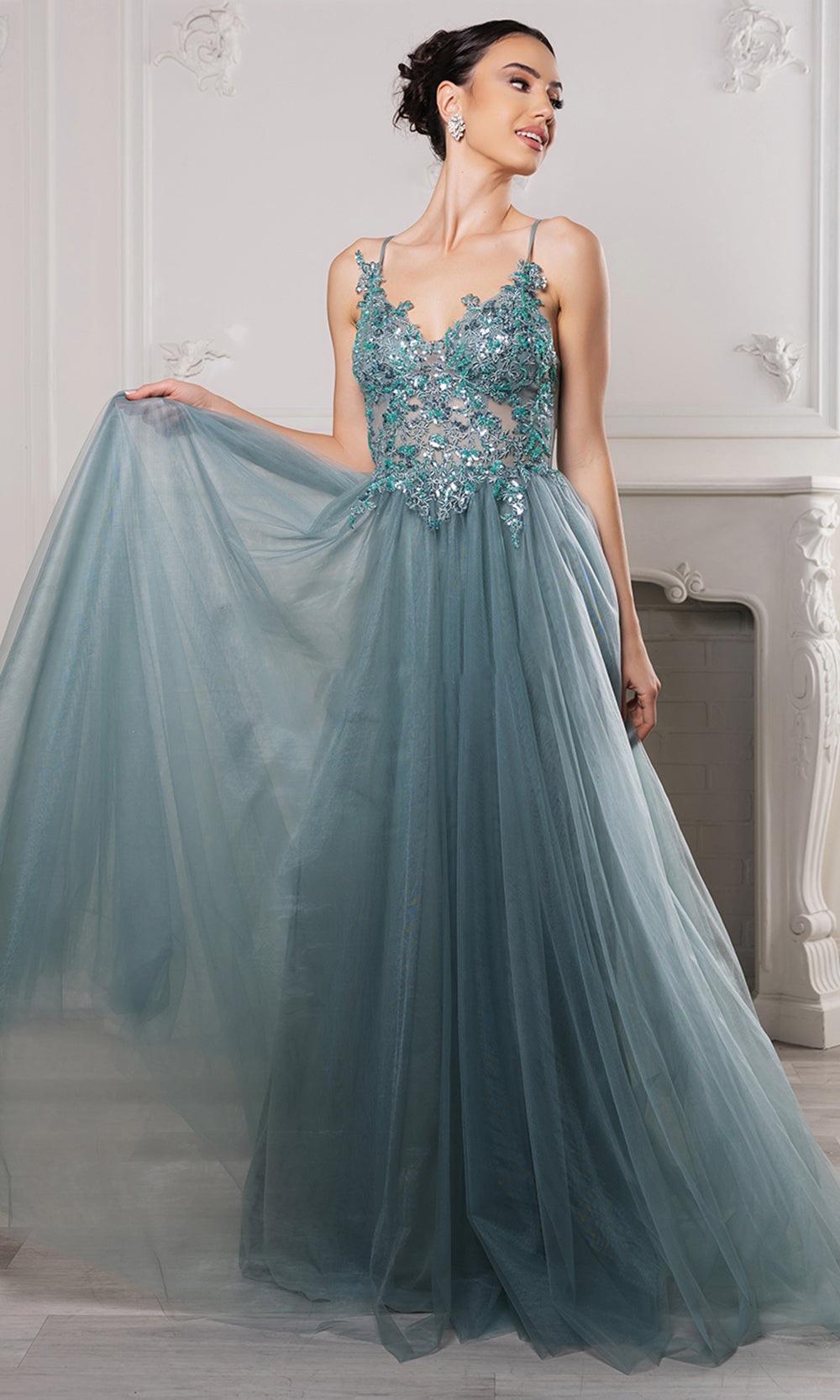 Radiate ethereal beauty in a May Queen MQ2167 gown that feels like a dream. The ensemble highlights a sheer illusion bodice decorated with floral lace applique and shimmering sequins. Spaghetti straps and a delicate deep V-neckline elevate the romantic design, while the full tulle skirt adds a soft and airy finish to the A-line silhouette. The May Queen MQ2167 is the perfect pick for proms, weddings, or formal evenings where elegance is key. Models are wearing Dustyblue, Ivory, Rosegold, and Sage colors.
