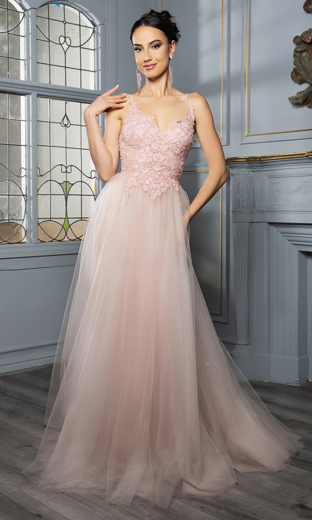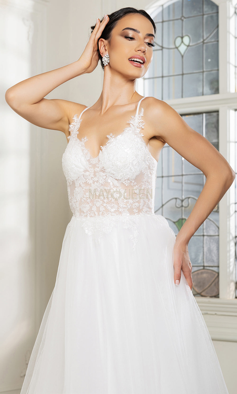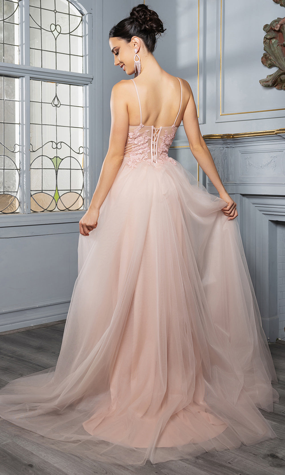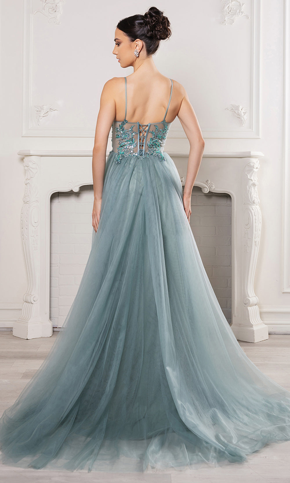 Radiate ethereal beauty in a May Queen MQ2167 gown that feels like a dream. The ensemble highlights a sheer illusion bodice decorated with floral lace applique and shimmering sequins. Spaghetti straps and a delicate deep V-neckline elevate the romantic design, while the full tulle skirt adds a soft and airy finish to the A-line silhouette. The May Queen MQ2167 is the perfect pick for proms, weddings, or formal evenings where elegance is key. Models are wearing Dustyblue, Ivory, Rosegold, and Sage colors.