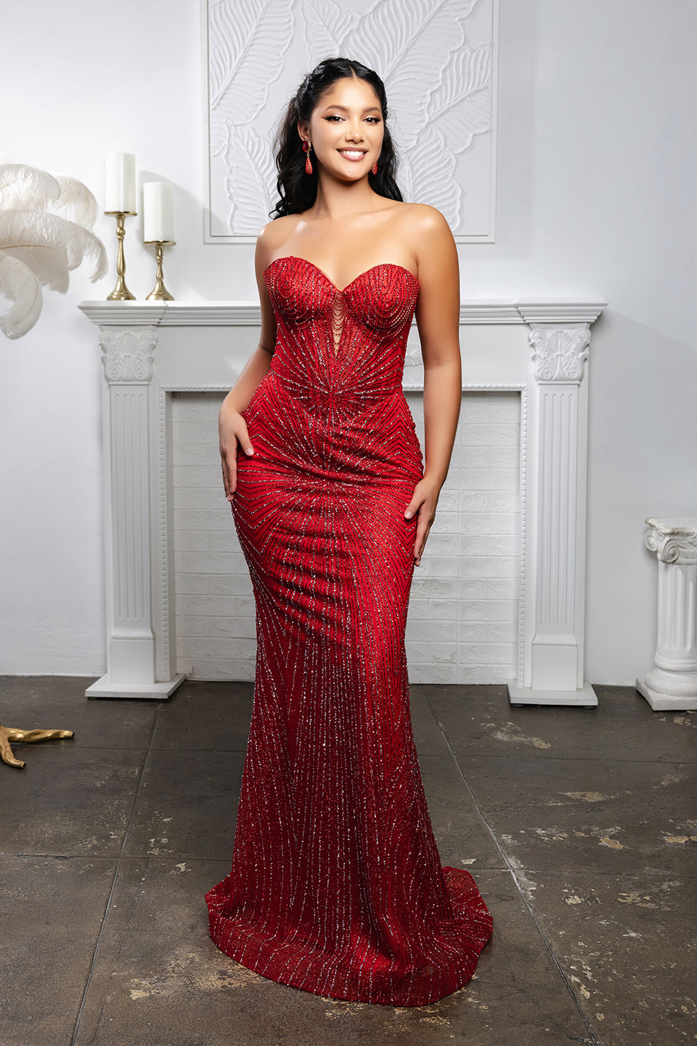 Exuding visual drama from every angle, the May Queen MQ2195 makes a dazzling impression with its striking linear pattern. A sculpted illusion bodice with corset boning elevates the structure, while the strapless sweetheart neckline provides a soft contrast to the shimmering texture throughout. The figure-hugging sheath silhouette extends to the floor, maintaining elegance in form and length. Beaded fringe brings movement and texture, accentuating the upper bodice with eye-catching detail. Whether for pageants, galas, or upscale evening events, the May Queen MQ2195 delivers unforgettable allure with every detail. Models are wearing Black/Gold, Champagne/Gold, Red, Rose Gold, Royal Blue, and Sage colors.